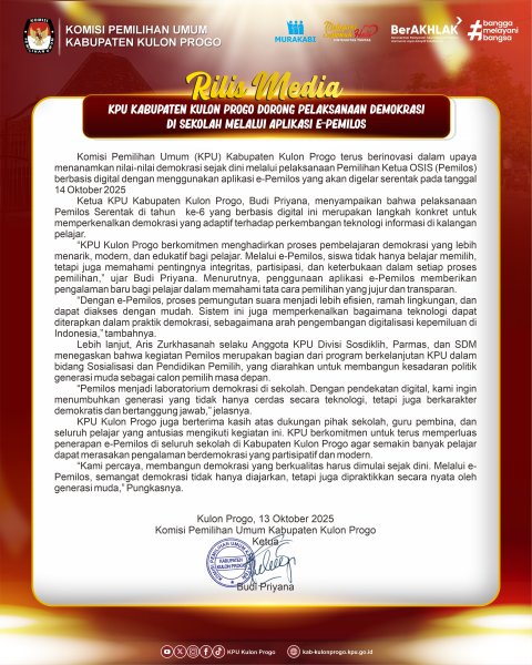 #TemanPemilih, berikut adalah Rilis Media KPU Kabupaten Kulon Progo Dorong Pelaksanaan Demokrasi di Sekolah melalui Aplikasi e-Pemilos. #KPUMelayani #MURAKABI #PemilosSerentak2025KP ....