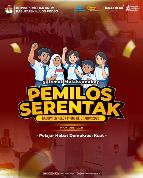 Selamat Melaksanakan Pemilos Serentak Kabupaten Kulon Progo ke-6 Tahun 2025 bagi siswa SMP/MTs dan SMA/SMK/MA se Kabupaten Kulon Progo pada hari ini, 14 Oktober 2025. Pelajar Hebat, Demokrasi Kuat! #KPUMelayani #MURAKABI #PemilosSerentak2025KP ....