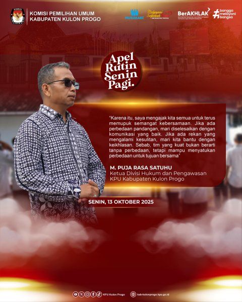 Apel Rutin Senin Pagi KPU Kabupaten Kulon Progo Pembina Apel : M. Puja Rasa Satuhu Senin, 13 Oktober 2025 KPU Kabupaten Kulon Progo kembali melaksanakan apel rutin Senin pagi yang dilaksanakan di halaman kantor KPU Kabupaten Kulon Progo yang diikuti oleh Komisioner, Pejabat Struktural, Staf/Pelaksana dan PPNPN di lingkungan KPU Kabupaten Kulon Progo. Pembina apel pada kesempatan kali ini adalah Anggota Komisioner KPU Kabupaten Kulon Progo, M. Puja Rasa Satuhu. Dalam sambutannya M. Puja Rasa Satuhu menyampaikan bahwa KPU adalah sebuah lembaga yang bekerja berdasarkan TIM dengan tujuan yang sama. Dalam setiap lembaga, termasuk di lingkungan kita, tidak ada satu pun pekerjaan besar yang bisa diselesaikan oleh satu orang saja. Kesuksesan sebuah organisasi lahir dari kekuatan kerja tim yang solid, di mana setiap individu berperan sesuai tanggung jawabnya dan saling melengkapi satu sama lain. Setiap keberhasilan kegiatan—baik itu tahapan pemilu, pelayanan publik, atau kegiatan internal—adalah hasil dari kerja sama semua pihak, bukan satu orang. “Karena itu, saya mengajak kita semua untuk terus memupuk semangat kebersamaan. Jika ada perbedaan pandangan, mari diselesaikan dengan komunikasi yang baik. Jika ada rekan yang mengalami kesulitan, mari kita bantu dengan keikhlasan. Sebab, tim yang kuat bukan berarti tanpa perbedaan, tetapi mampu menyatukan perbedaan untuk tujuan Bersama” tegasnya. Semoga semangat kebersamaan ini menjadi energi positif dalam menjalankan tugas-tugas kita ke depan, dan menjadikan kinerja lembaga kita semakin solid, profesional, dan berintegritas. -Saf ....
