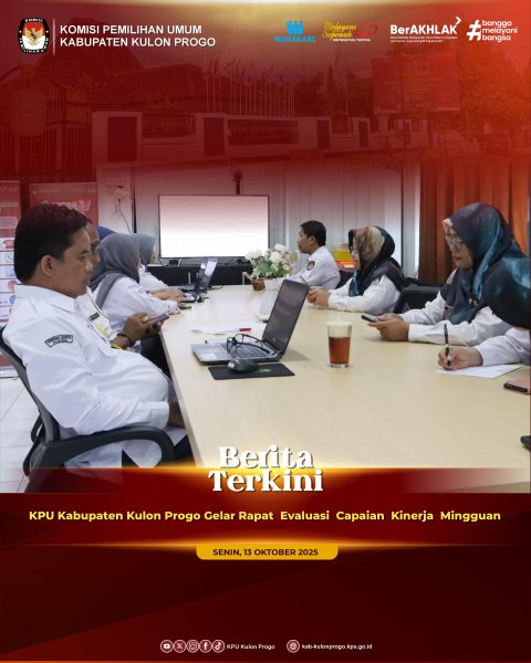 Komisi Pemilihan Umum (KPU) Kabupaten Kulon Progo kembali menggelar Rapat Evaluasi Kinerja Mingguan pada Senin (13/10/2025), bertempat di Ruang Pendopo KPU Kabupaten Kulon Progo. Rapat ini dipimpin langsung oleh Sekretaris KPU Kabupaten Kulon Progo, Widi Purnama, serta diikuti oleh seluruh Kasubbag, Pejabat Pengadaan, Pengelola Keuangan, serta staf Subbagian Rendatin di lingkungan KPU Kabupaten Kulon Progo. Kegiatan ini merupakan agenda rutin yang bertujuan untuk memantau capaian kinerja serta menindaklanjuti hasil agenda dari masing-masing subbagian KPU Kabupaten Kulon Progo untuk seminggu ke depan. Dalam rapat tersebut, para Kasubbag menyampaikan laporan perkembangan kegiatan dan kendala yang dihadapi selama pelaksanaan tugas minggu sebelumnya. Evaluasi ini menjadi sarana penting bagi jajaran sekretariat untuk meningkatkan koordinasi, memperkuat sinergi, dan memastikan seluruh program berjalan sesuai target waktu dan standar yang telah ditentukan, demi peningkatan mutu pelayanan kelembagaan. Beberapa poin penting menjadi sorotan, di antaranya: 1. Tindak lanjut atas undangan dari Pemerintah Kabupaten Kulon Progo dalam rangka peringatan Hari Jadi ke-74 Kabupaten Kulon Progo. 2. Pembagian Penugasan Pembukaan Pelaksanaan PEMILOS Serentak Kabupaten Kulon Progo ke-6 Tahun 2025. 3. Perkembangan PDPB 8.918 Data turun dari KPU RI yang harus terselesaikan pada akhir tahun ini. 4. Penyelesaian penyusunan SKP minimal tanggal 17 Oktober 2025. 5. Undangan dari KPU DIY terkait evaluasi pendidikan pemilih. 6. Penyelesaian pengarsipan di bagian divisi hukum. 7. Pelengkapan dokumentasi arsip Pemilu mulai dari tahun 2004, 2009, 2014, 2019 dan 2024. Rapat evaluasi mingguan ini diharapkan, menjadi momentum penting untuk memperkuat koordinasi internal serta memastikan seluruh target kinerja dapat tercapai sesuai rencana kerja dan jadwal yang telah ditetapkan. -Irv ....