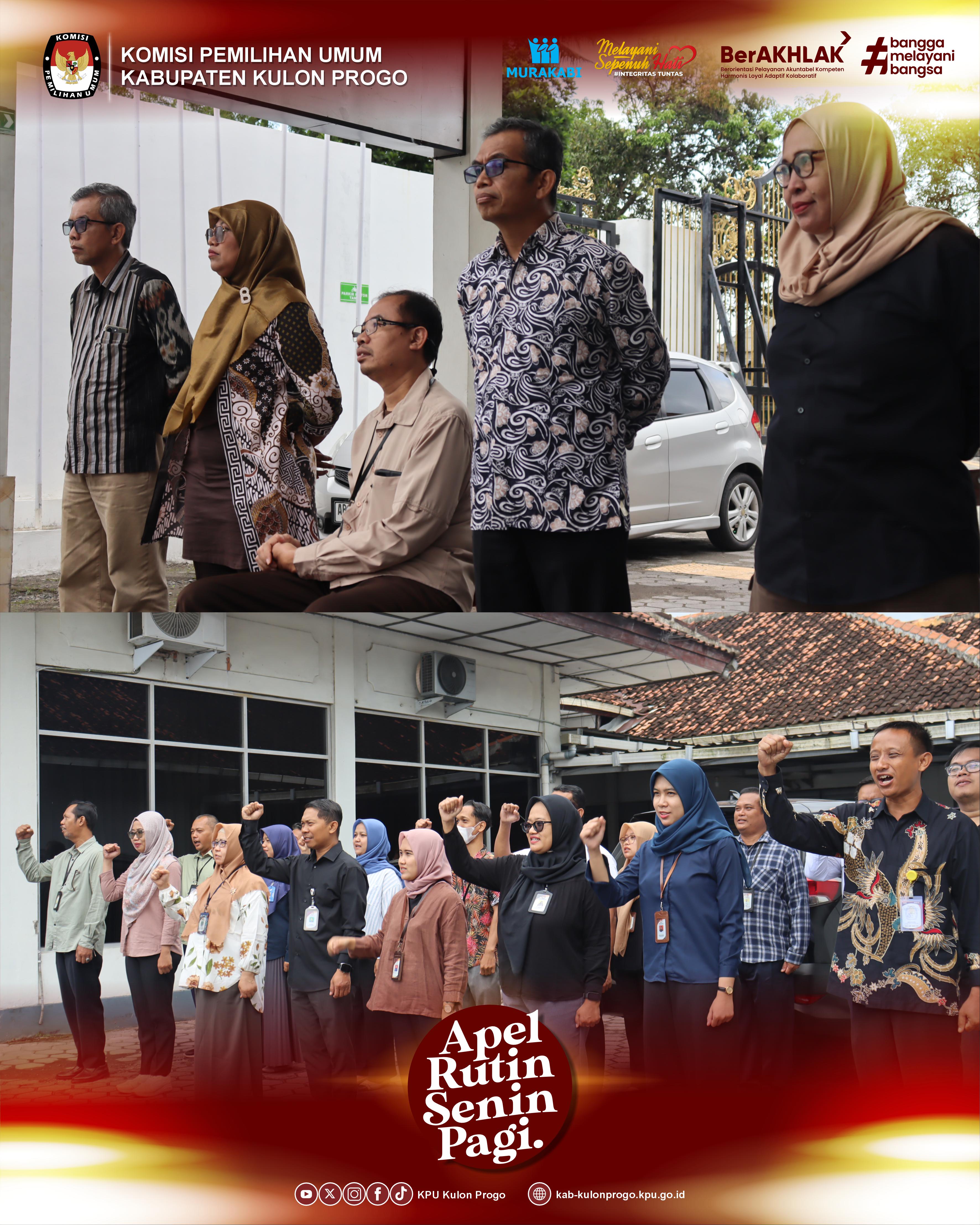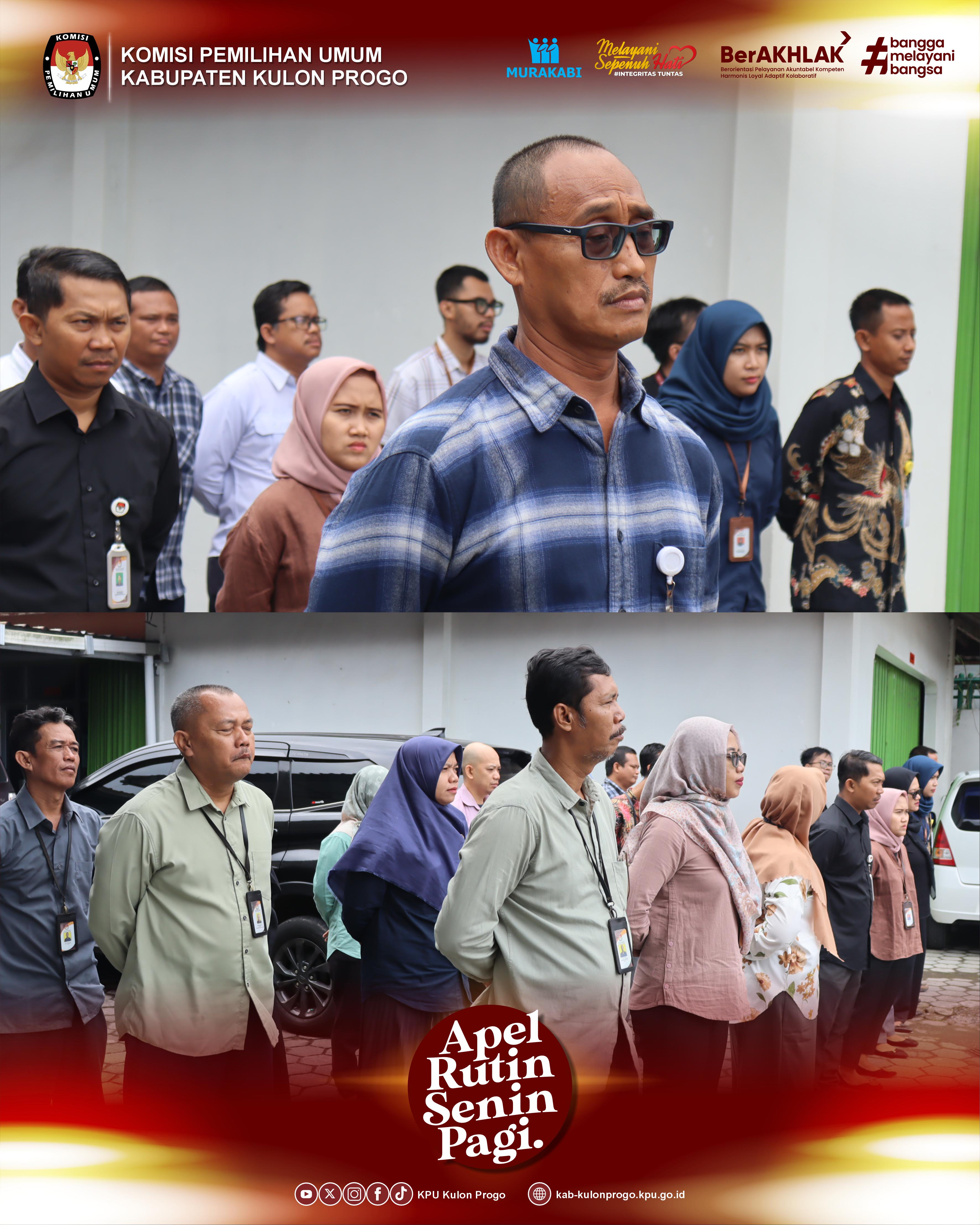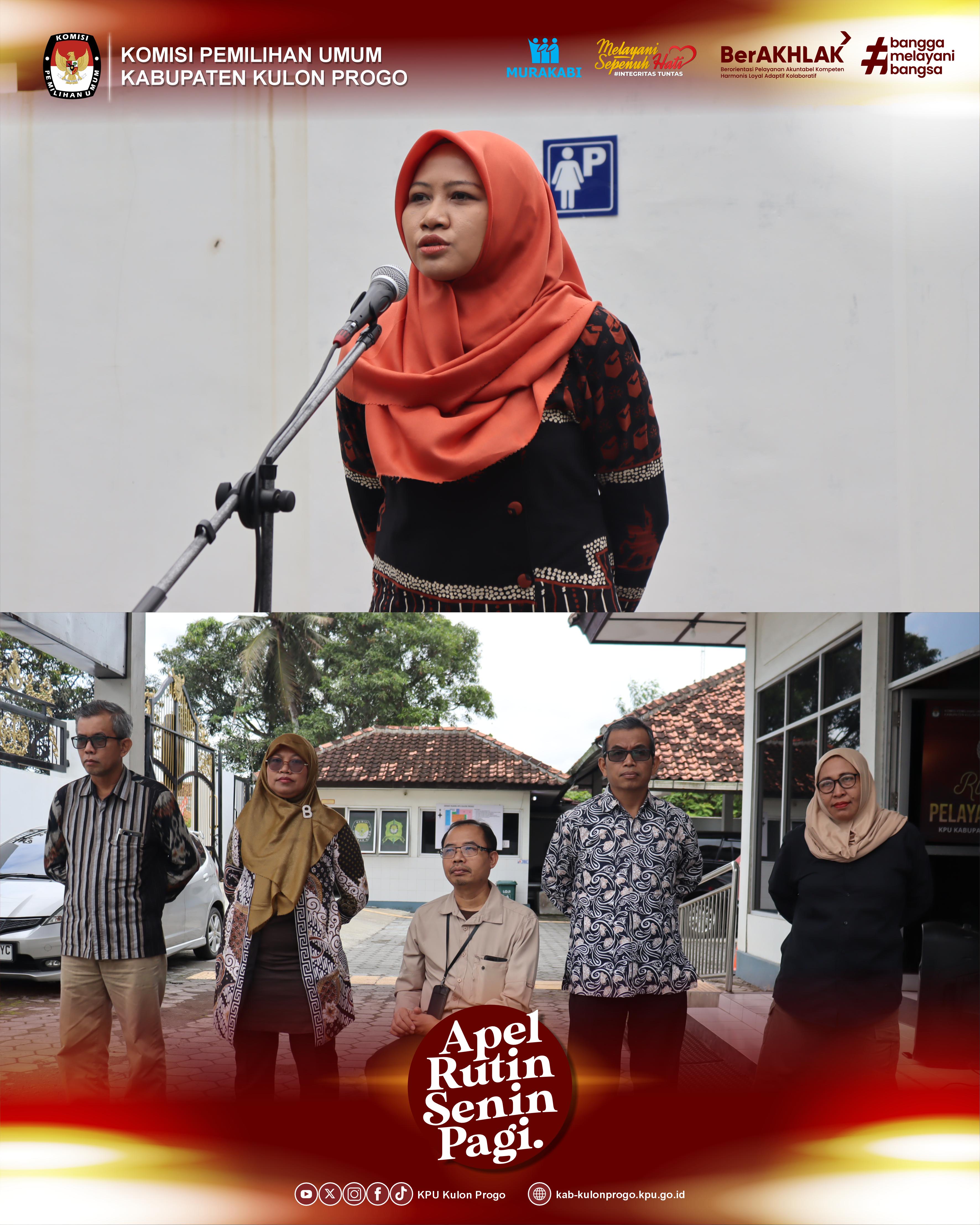 Senin, 15 September 2025 KPU Kabupaten Kulon Progo kembali melaksanakan apel rutin Senin pagi yang dilaksanakan di halaman kantor KPU Kabupaten Kulon Progo yang diikuti oleh Komisioner, Pejabat Struktural, Staf/Pelaksana dan PPNPN di lingkungan KPU Kabupaten Kulon Progo. Pembina apel pada kesempatan kali ini adalah Ketua Divisi Perencanaan, Data dan Informasi, Ria Harlinawati.