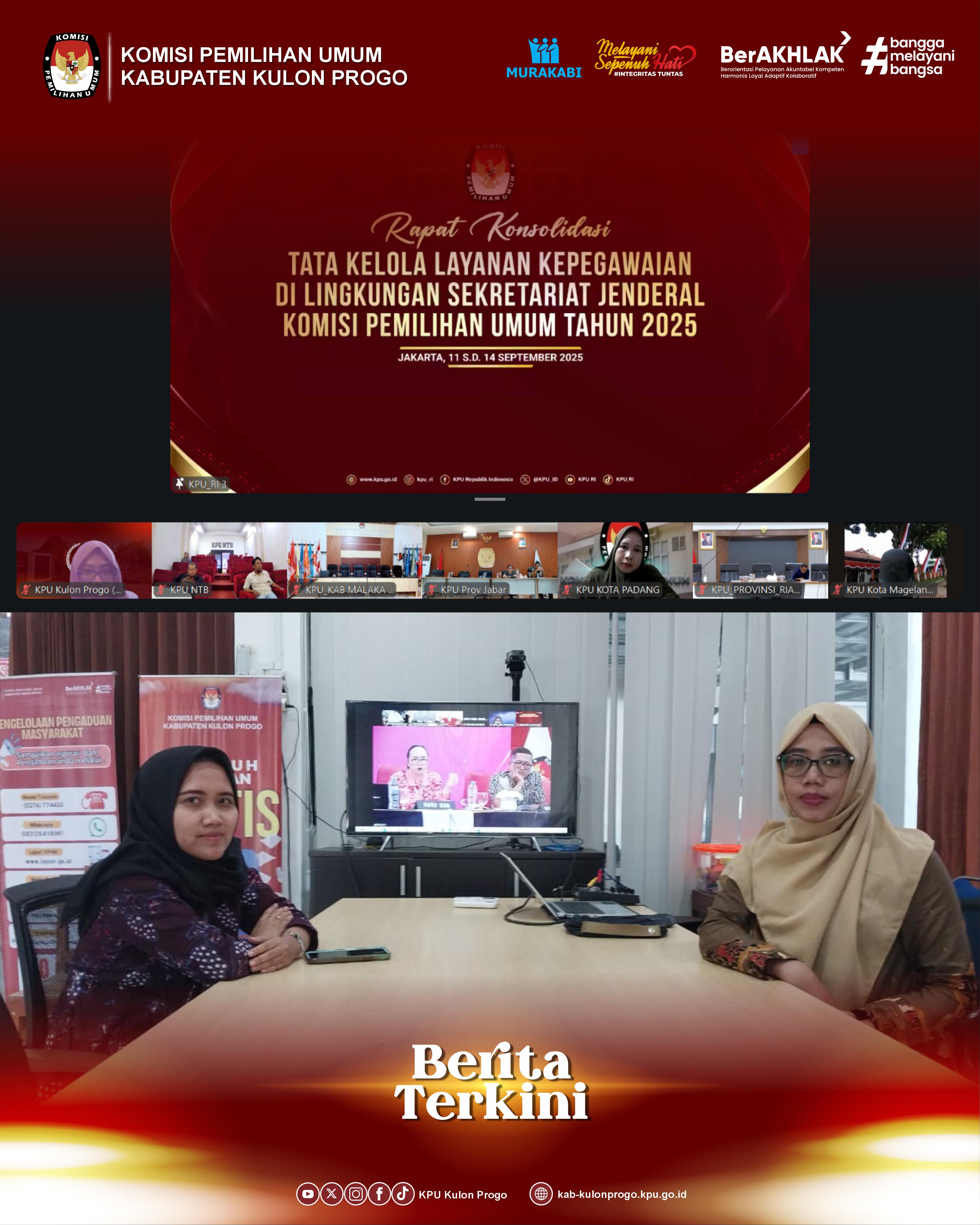 Kulon Progo – KPU Kabupaten Kulon Progo mengikuti Rapat Konsolidasi Tata Kelola Layanan Kepegawaian di Lingkungan Sekretariat Jenderal KPU Tahun 2025 yang diselenggarakan oleh Sekretariat Jenderal KPU RI pada 12–13 September 2025. Kegiatan ini dilaksanakan secara daring dan diikuti oleh seluruh satuan kerja KPU provinsi maupun KPU kabupaten/kota.