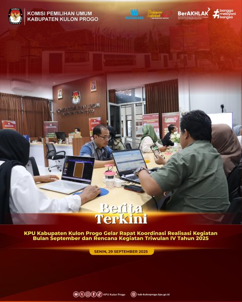 Wates – Komisi Pemilihan Umum (KPU) Kabupaten Kulon Progo menyelenggarakan Rapat Koordinasi Realisasi Kegiatan Bulan September dan Rencana Kegiatan Triwulan IV Tahun 2025 pada Selasa, 30 September 2025, di ruang Pendopo Kantor KPU Kabupaten Kulon Progo. Kegiatan ini dihadiri oleh Ketua, Anggota, Sekretaris dan para Kepala Subbagian (Kasubbag), serta staf pelaksana yang membidangi masing-masing divisi terkait. Kegiatan ini dilaksanakan sebagai upaya evaluasi kinerja dan penyiapan agenda strategis menjelang akhir tahun.