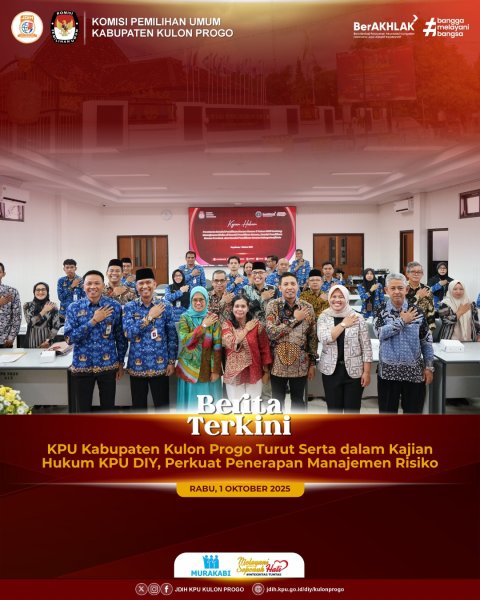 Yogyakarta, 1 Oktober 2025 – Komisi Pemilihan Umum Kabupaten Kulon Progo ikuti Kajian Hukum yang diselenggarakan KPU DIY yang berfokus pada Peraturan KPU Nomor 2 Tahun 2025 tentang Manajemen Risiko di lingkungan Penyelenggara Pemilu. Acara kajian hukum ini dihadiri oleh ketua KPU, Ketua Divisi Hukum dan Pengawasan, Kepala Sub Bagian Hukum dan Teknis serta pelaksana sub bag teknis dan hukum KPU se-DIY .