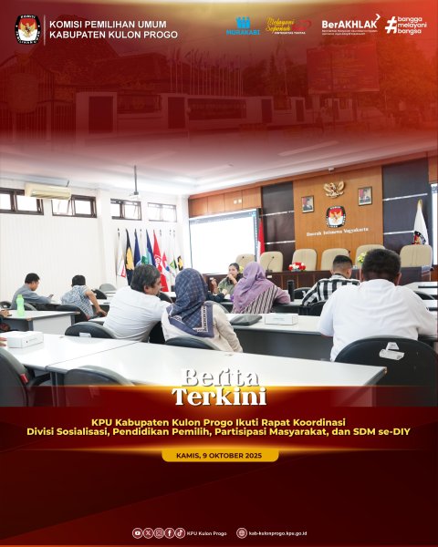 Yogyakarta — KPU Kabupaten Kulon Progo ikuti Rapat Koordinasi Divisi Sosialisasi, Pendidikan Pemilih, Partisipasi Masyarakat (Sosdiklih, Parmas) dan SDM se Kabupaten/Kota di lingkungan KPU se-DIY yang diselenggarakan oleh Komisi Pemilihan Umum Daerah Istimewa Yogyakarta (KPU DIY) pada Kamis, 9 Oktober 2025 bertempat di Ruang Rapat Lantai 2 Kantor KPU DIY, Yogyakarta.