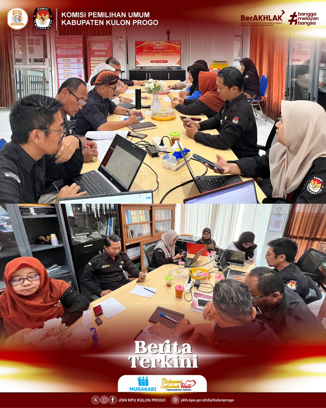 Wates, 15 Oktober 2025 – Komisi Pemilihan Umum (KPU) Kabupaten Kulon Progo hari ini, menggelar Rapat Pleno rutin dengan agenda utama Evaluasi Pelaksanaan Pemilihan Ketua OSIS (Pemilos) Serentak. Rapat yang dilaksanakan di Pendopo KPU Kabuparten Kulon Progo ini dihadiri lengkap oleh Ketua dan Anggota KPU, Sekretaris KPU, seluruh Kepala Subbagian (Kasubbag), serta ASN Sub Bagian Teknis dan Hukum di lingkungan KPU Kabupaten Kulon Progo.