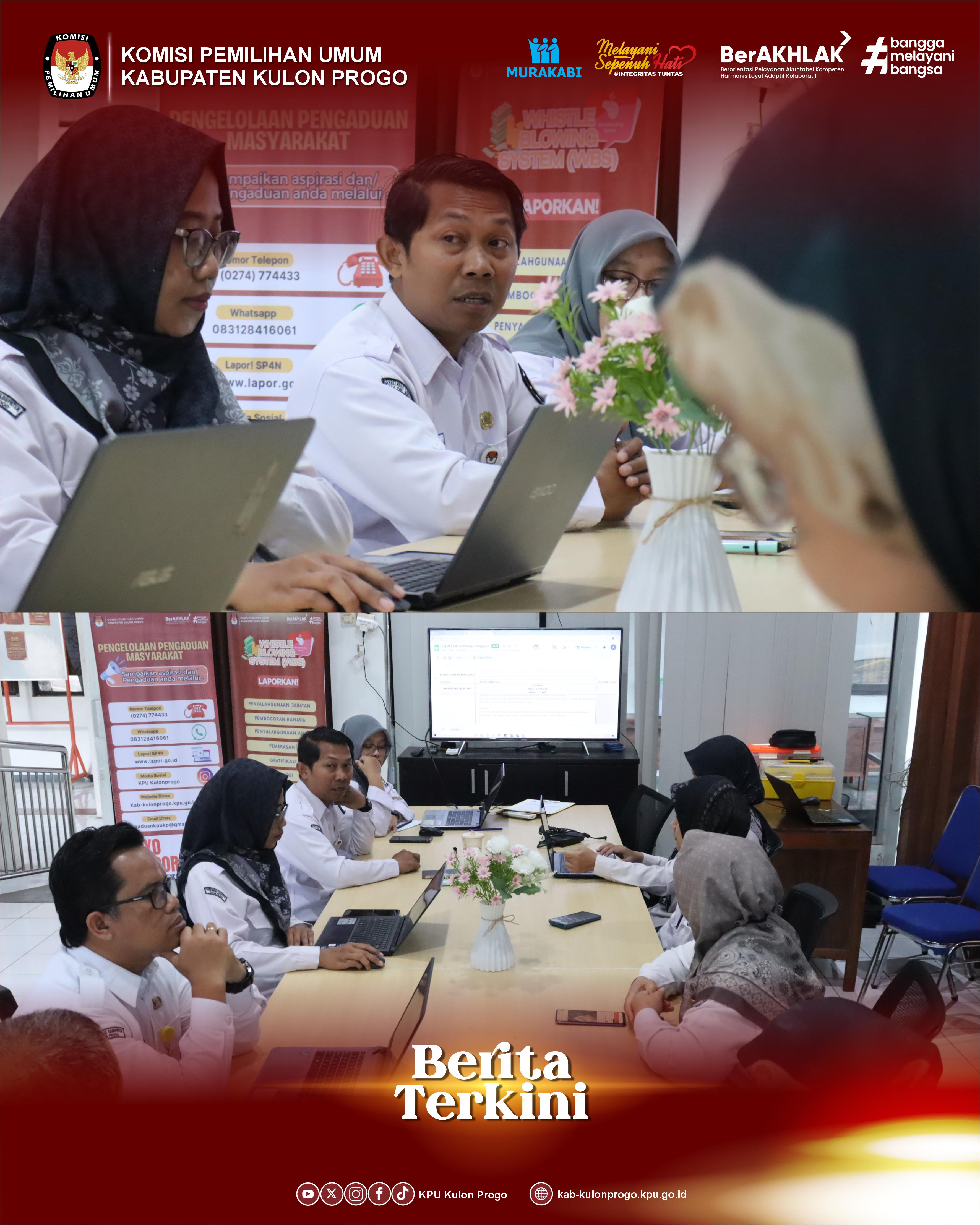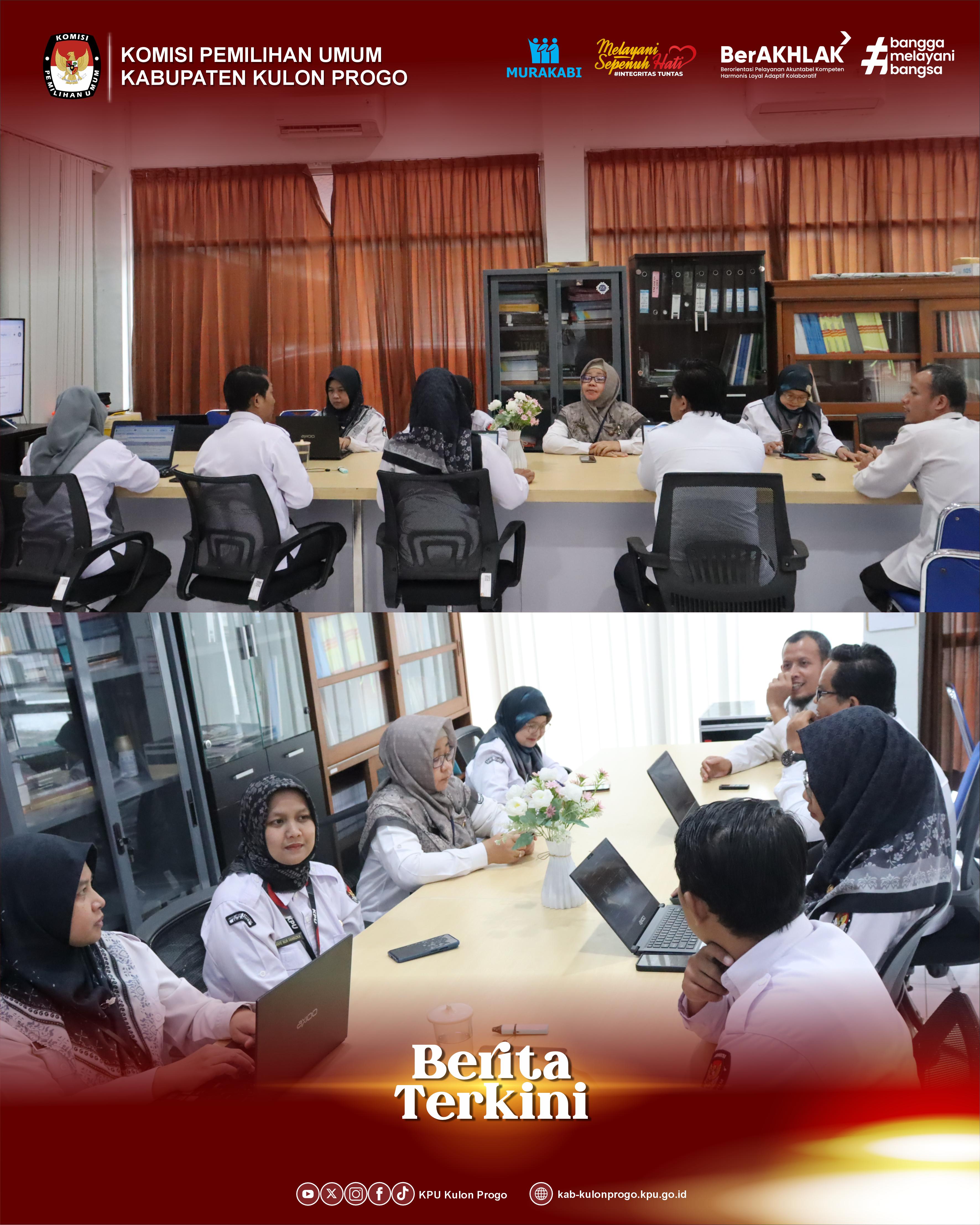 Wates — Komisi Pemilihan Umum (KPU) Kabupaten Kulon Progo kembali melaksanakan Rapat Evaluasi Capaian Kinerja Mingguan pada Senin (27/10/2025) bertempat di Ruang Pendopo KPU Kabupaten Kulon Progo. Kegiatan rutin ini diikuti oleh seluruh Kasubbag, Pejabat Pengadaan, Pengelola Keuangan, serta staf Subbagian Rendatin di lingkungan KPU Kabupaten Kulon Progo. Pada kesempatan kali ini, rapat dipimpin oleh Kasubbag Perencanaan, Data, dan Informasi (Rendatin), Aan Rimawanto.