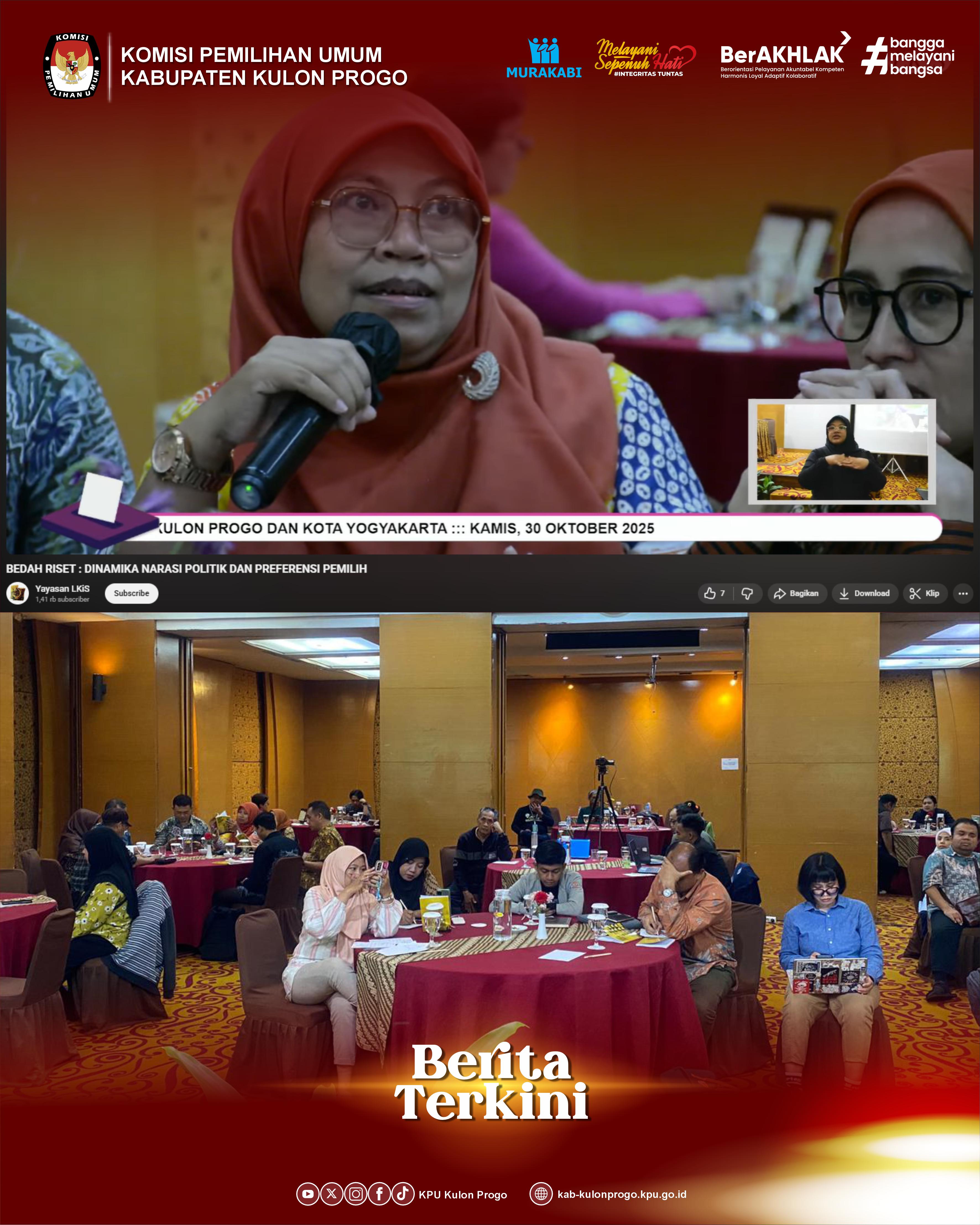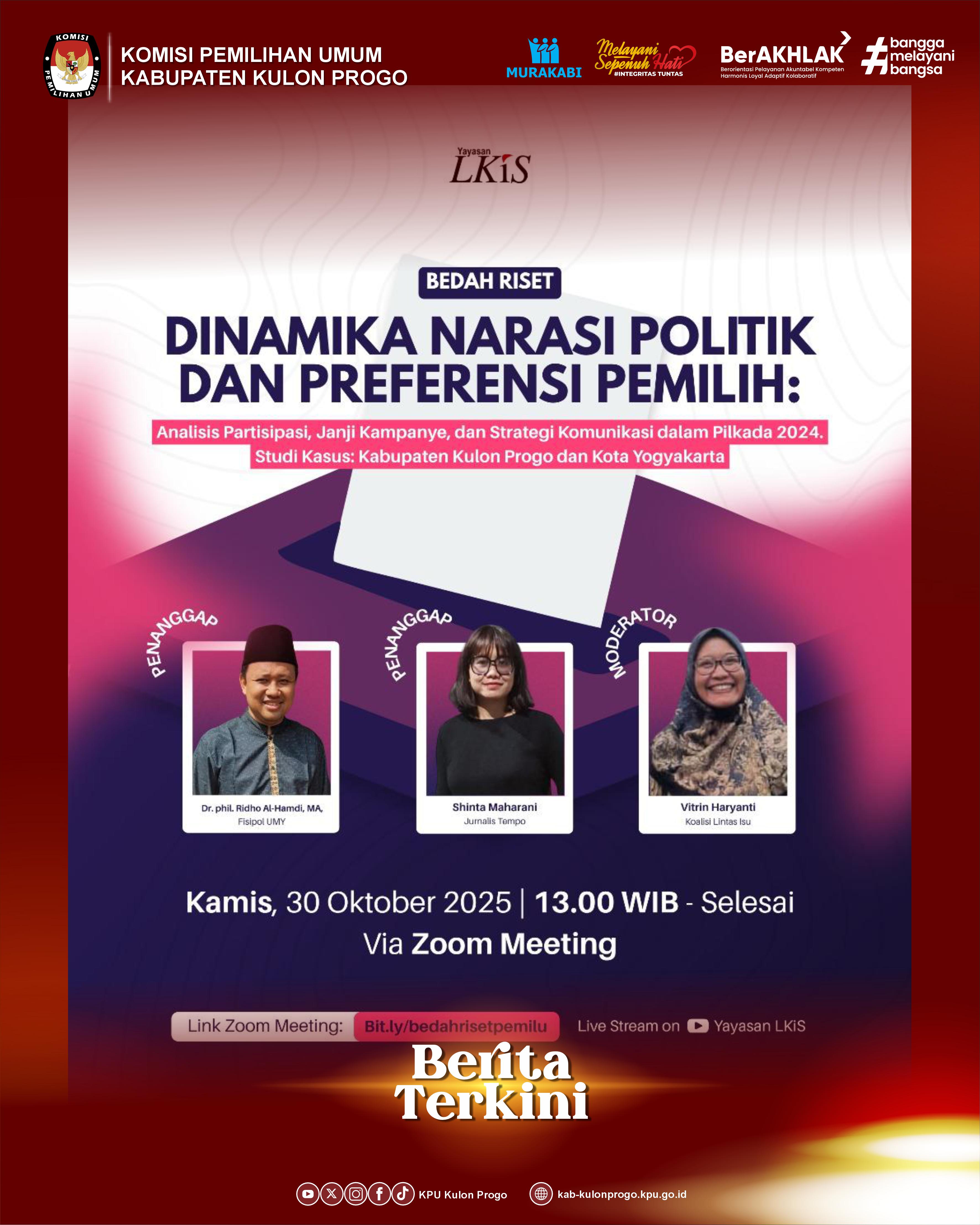 Yogyakarta, — Komisi Pemilihan Umum (KPU) Kabupaten Kulon Progo menghadiri kegiatan Bedah Riset Publik bertema “Dinamika Narasi Politik dan Preferensi Pemilih: Analisis Partisipasi, Janji Kampanye, dan Strategi Komunikasi dalam Pilkada 2024” yang diselenggarakan oleh Yayasan LKiS Yogyakarta. Kegiatan ini menjadi bagian dari rangkaian program Ketahanan Demokrasi yang selama ini turut melibatkan KPU Kabupaten Kulon Progo.