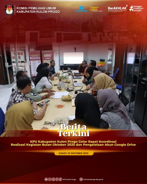 Wates, 31 Oktober 2025 – Komisi Pemilihan Umum (KPU) Kabupaten Kulon Progo melaksanakan Rapat Koordinasi Realisasi Kegiatan Bulan Oktober Tahun 2025 dan Pengelolaan Akun Google Drive yang bertempat di ruang Pendopo Kantor KPU Kabupaten Kulon Progo.