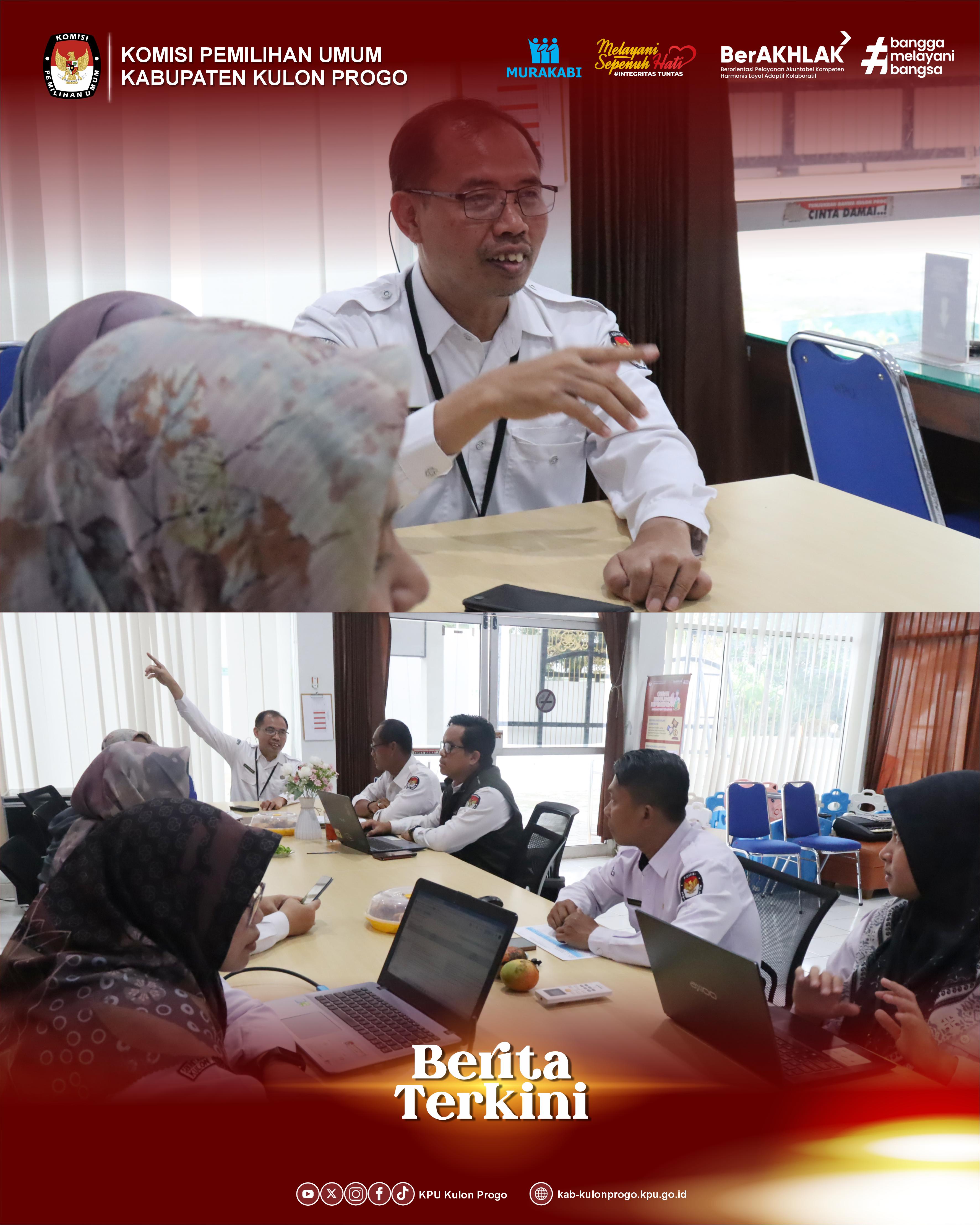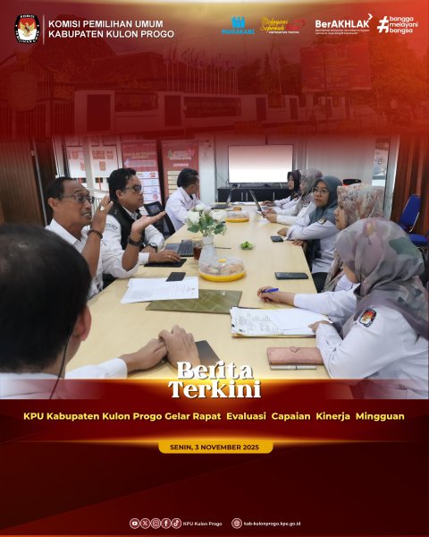 Wates — Komisi Pemilihan Umum (KPU) Kabupaten Kulon Progo kembali melaksanakan Rapat Evaluasi Capaian Kinerja Mingguan pada Senin (3/11/2025) bertempat di Ruang Pendopo KPU Kabupaten Kulon Progo. Kegiatan rutin ini diikuti oleh Sekretaris, seluruh Kasubbag, Pejabat Pengadaan, Pengelola Keuangan, serta staf Subbagian Rendatin di lingkungan KPU Kabupaten Kulon Progo. Pada kesempatan kali ini, rapat dipimpin oleh Kasubbag Perencanaan, Data, dan Informasi (Rendatin), Aan Rimawanto.