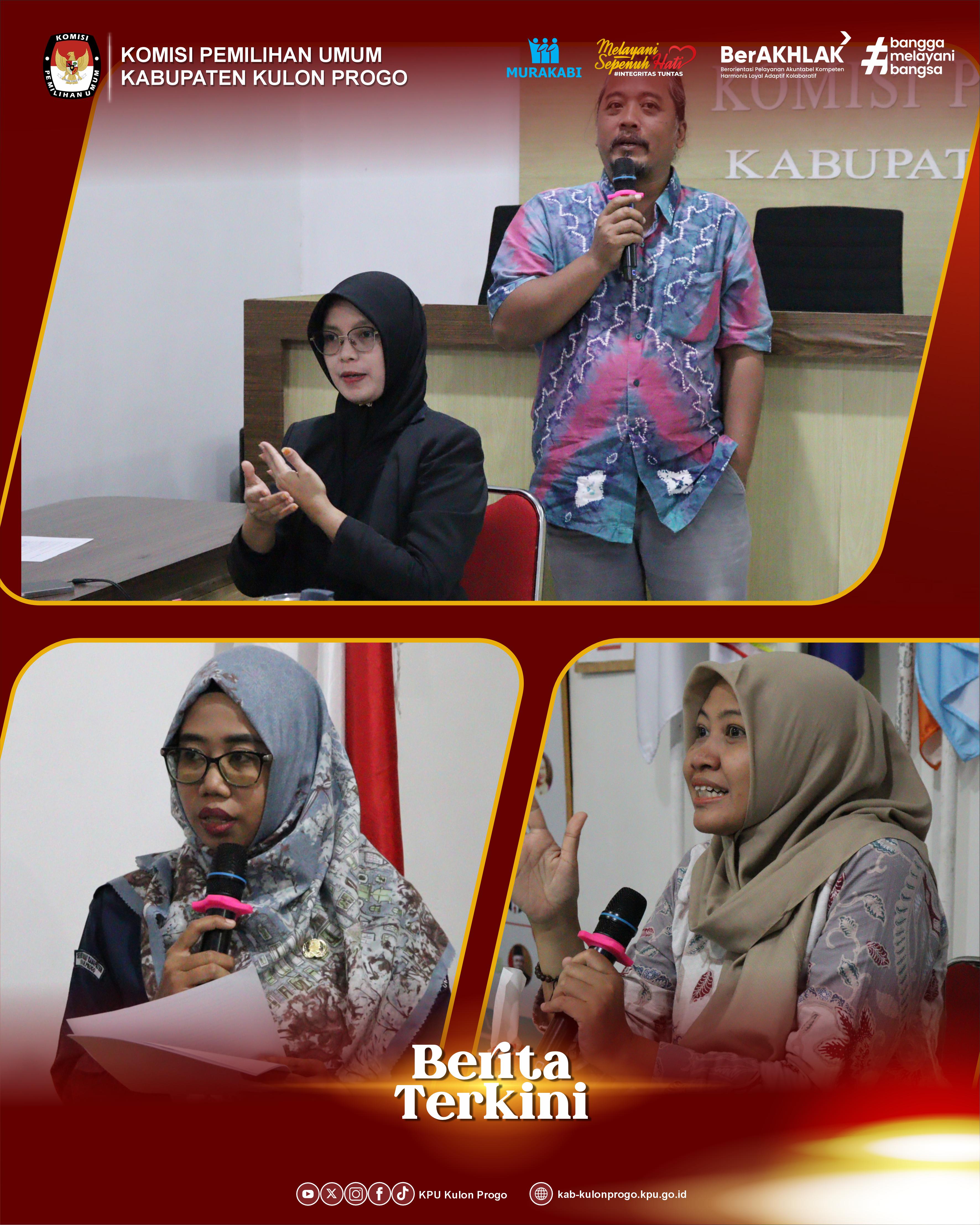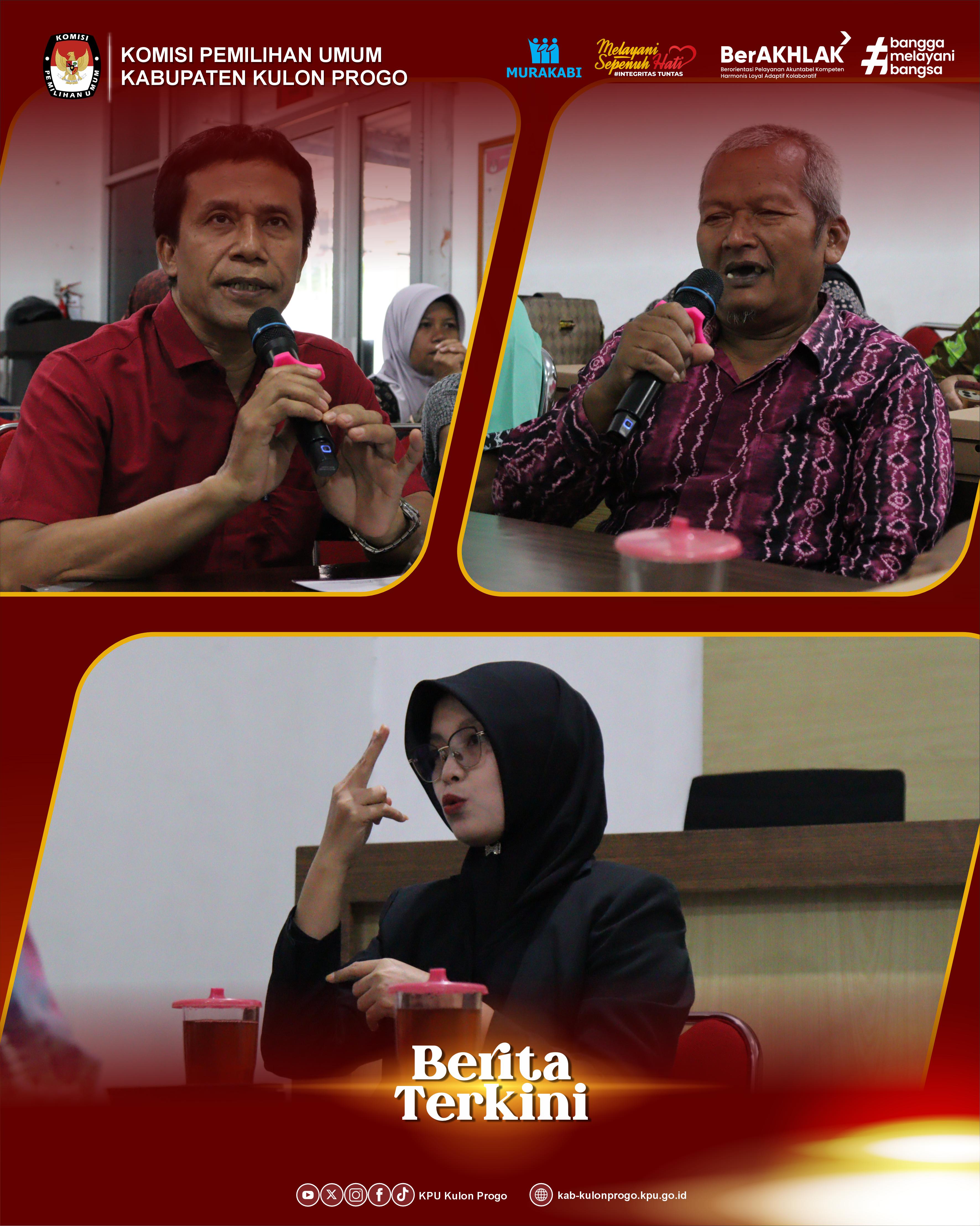 Ketua KPU Kabupaten Kulon Progo membuka acara sekaligus memberikan sambutan. Dalam sambutannya, ia menegaskan komitmen lembaganya untuk menerapkan Budaya Kerja MURAKABI (Melayani, Unggul, Responsif, Akuntabel, Kompeten, Adaptif, Bersih dan Inklusif). Ia menekankan bahwa aspek Melayani dan Inklusif merupakan wujud nyata komitmen KPU dalam memberikan layanan terbaik, termasuk kepada pemilih penyandang disabilitas.