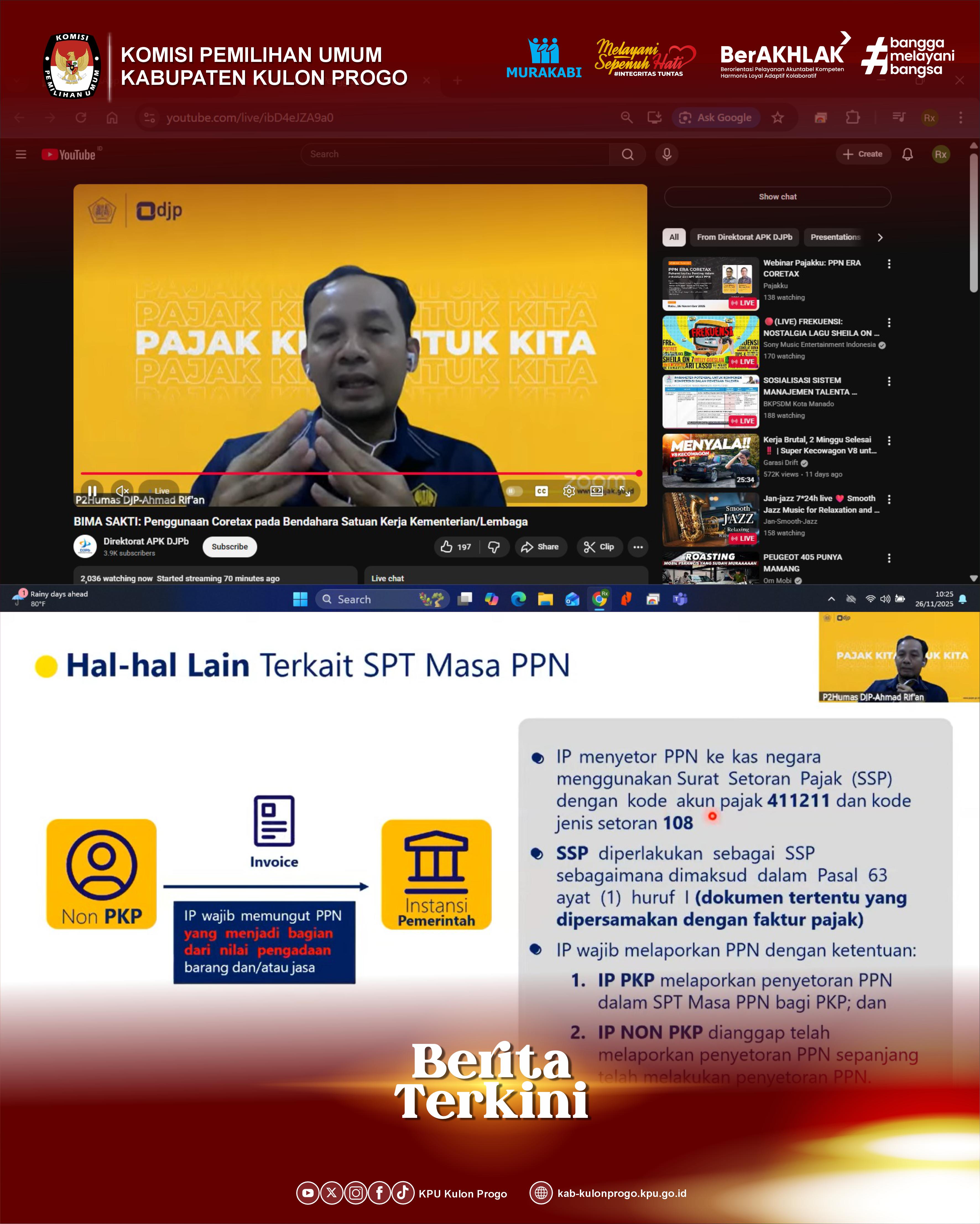 Kulon Progo – Komisi Pemilihan Umum (KPU) Kabupaten Kulon Progo mengikuti kegiatan Bimbingan Teknis Sistem Akuntansi Instansi (BIMA SAKTI) yang digelar secara daring pada Rabu (26/11/2025). Kegiatan ini diselenggarakan oleh Direktorat APK DJPb melalui saluran YouTube dan Zoom, dengan tajuk "Penggunaan Coretax pada Bendahara Satuan Kerja Kementerian/Lembaga".