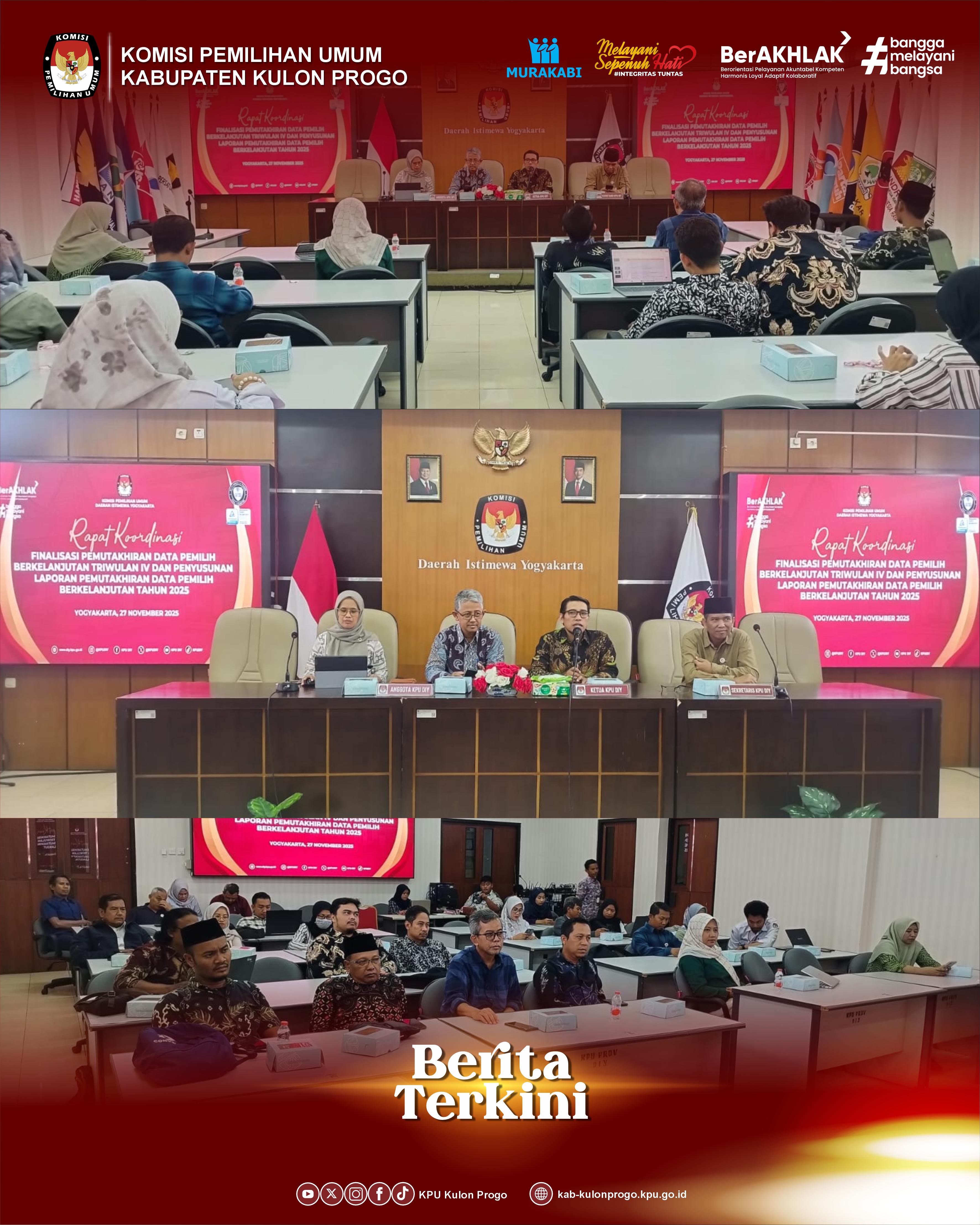Yogyakarta, 27 November 2025 – Komisi Pemilihan Umum (KPU) Kabupaten Kulon Progo mengikuti kegiatan Rapat Koordinasi Rakor Finalisasi PDPB Triwulan IV dan Penyusunan Laporan PDPB Tahun 2025 oleh KPU Daerah Istimewa Yogyakarta (DIY) pada Senin (27/11), bertempat di Lantai 2 kantor KPU DIY. Kegiatan ini dihadiri oleh Ketua dan Anggota serta Sekretaris KPU DIY.