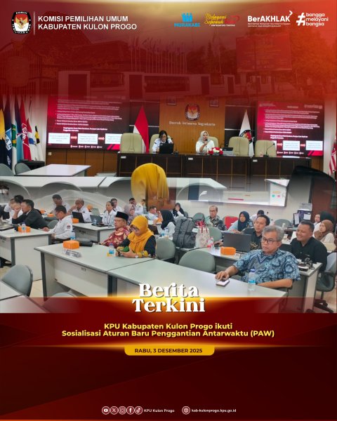 YOGYAKARTA – Komisi Pemilihan Umum (KPU) Kabupaten Kulon Progo mengikuti sosialisasi dan bimbingan teknis terkait mekanisme Penggantian Antarwaktu (PAW) bagi anggota DPRD Provinsi dan Kabupaten/Kota pada Rabu, 4 Desember 2025 yang di gelar oleh KPU Daerah Istimewa Yogyakarta (DIY). Sosialisasi ini menekankan pada penerapan aturan terbaru, yakni Peraturan KPU Nomor 3 Tahun 2025.