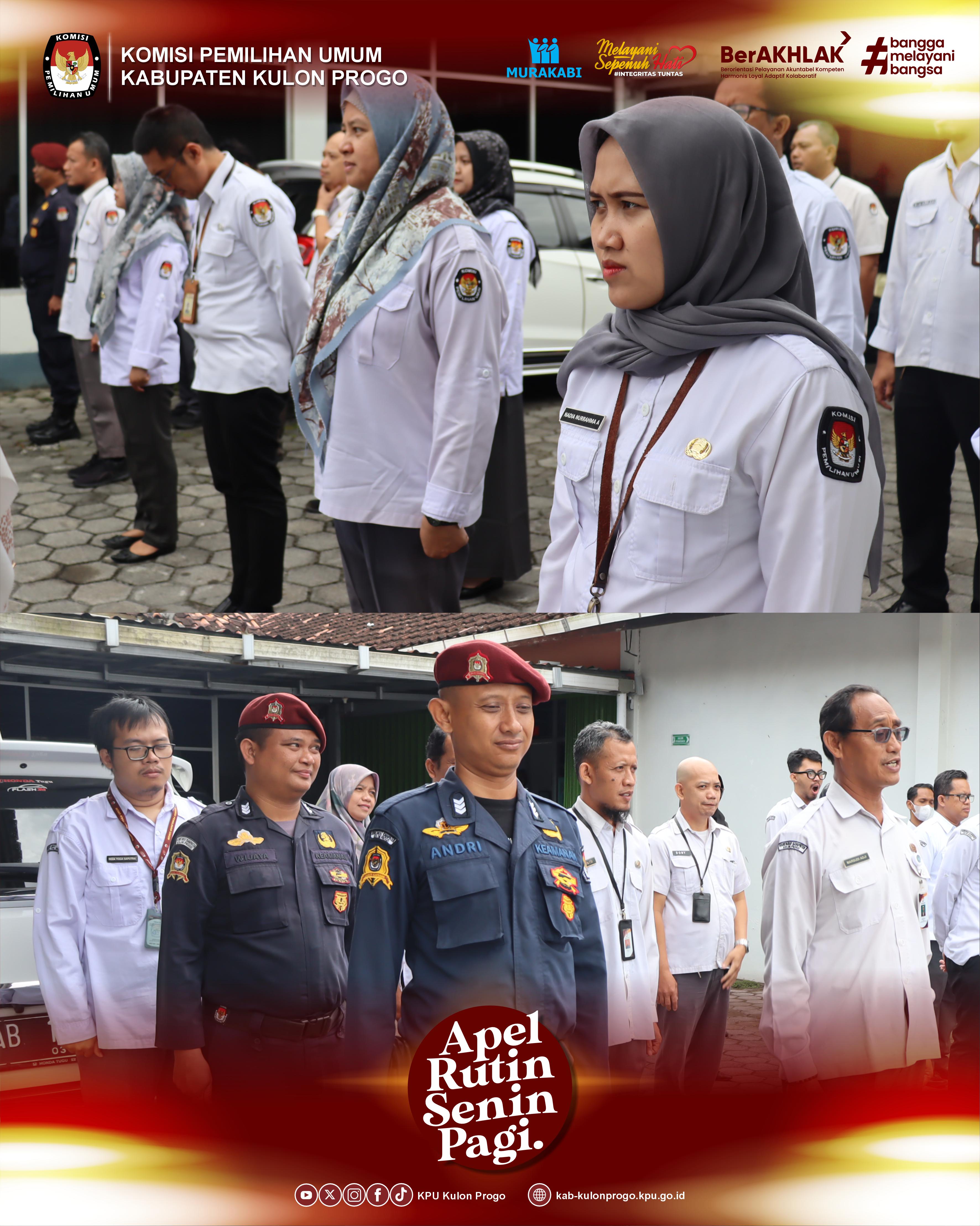 KPU Kabupaten Kulon Progo melaksanakan apel pagi pada hari ini, Senin 8 Desember 2025 dengan pembina apel Ketua KPU Kabupaten Kulon Progo, Budi Priyana. Kegiatan berlangsung dengan tertib dan diikuti seluruh jajaran sekretariat serta anggota KPU.