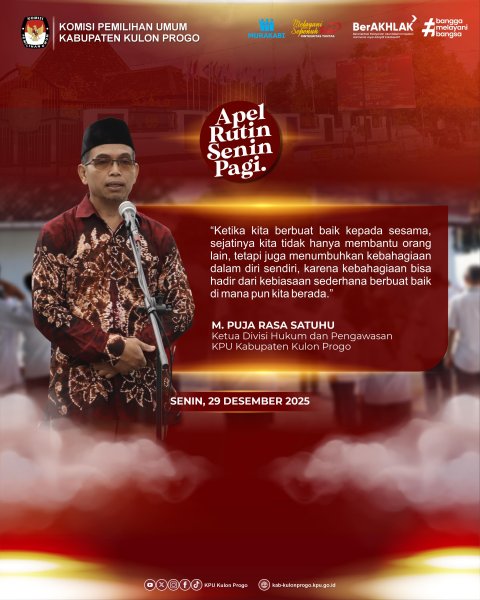 Apel rutin kali ini dipimpin oleh Anggota Komisioner KPU Kabupaten Kulon Progo, M. Puja Rasa Satuhu, yang bertindak sebagai pembina apel. Dalam amanatnya, ia menyampaikan bahwa kebahagiaan dapat diciptakan melalui sikap menikmati dan mensyukuri apa yang telah dialami, serta melalui perbuatan baik kepada sesama.