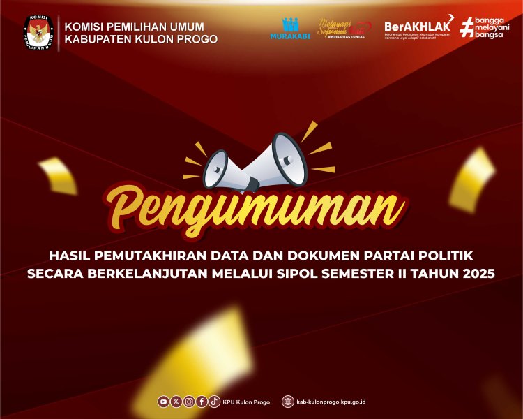 Pengumuman Tentang Hasil Pemutakhiran Data dan Dokumen Partai Politik Secara Berkelanjutan Melalui Sipol Semester II Tahun 2025 Jumat, 02 Januari 2026 13:56 126 Pengumuman Nomor 652/PL.01.PU/340/2/2025 tentang Hasil Pemutakhiran Data dan Dokumen Partai Politik Secara Berkelanjutan Melalui Sipol Semester II Tahun 2025 Bagikan: Telah dilihat 126 kali