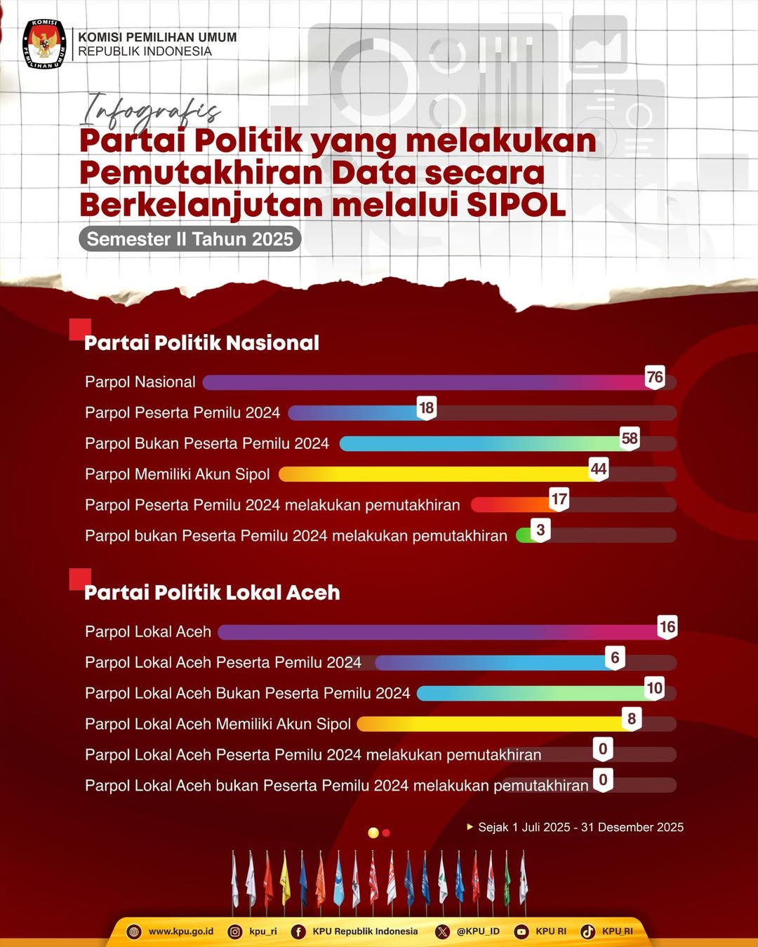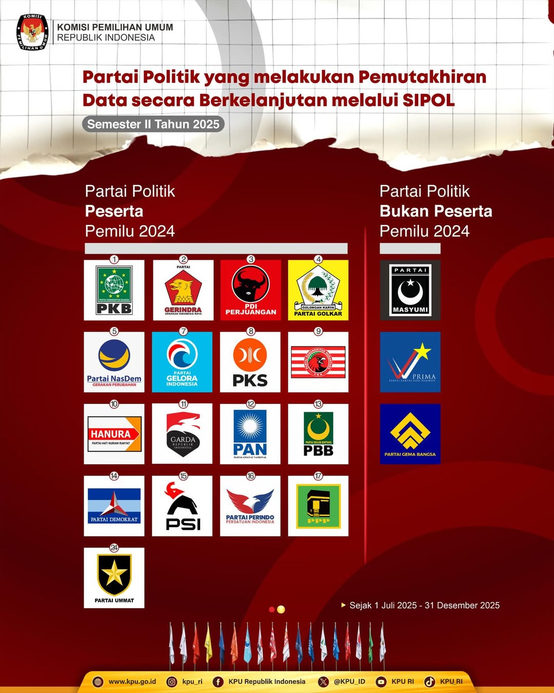 #TemanPemilih, inilah daftar Partai Politik yang melakukan Pemutakhiran Data Secara Berkelanjutan melalui SIPOL pada Semester II Tahun 2025.