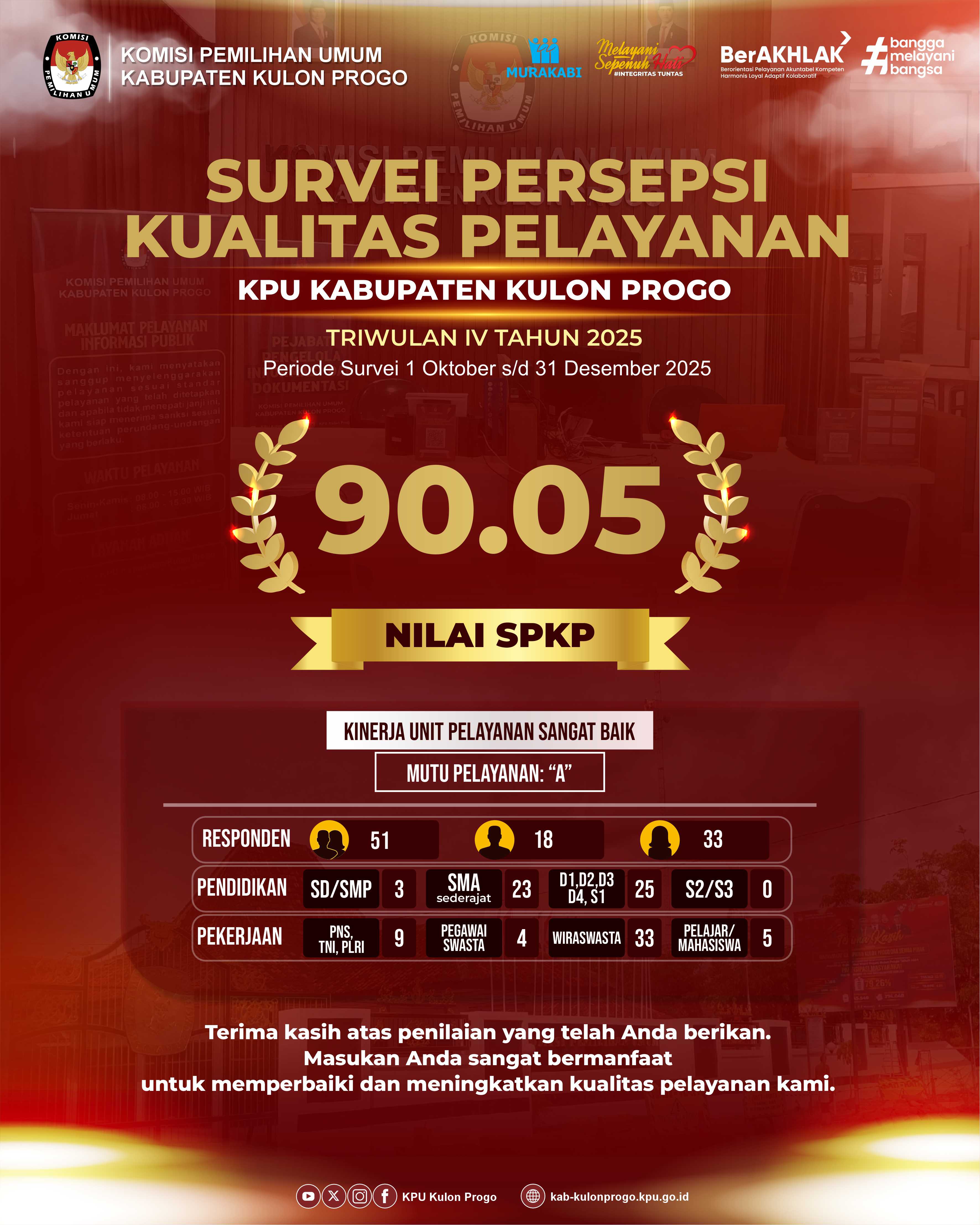 #TemanPemailih, berikut adalah Infografis Survei Persepsi Kualitas Pelayanan (SPKP) Komisi Pemilihan Umum Kabupaten Kulon Progo Triwulan IV Tahun 2025 dengan capaian Nilai 90.05.