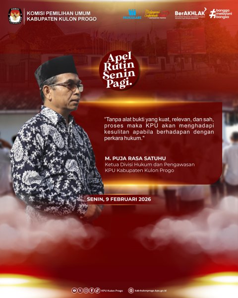 Bertindak sebagai pembina apel, Anggota Komisioner KPU Kabupaten Kulon Progo, M. Puja Rasa Satuhu, menegaskan bahwa alat bukti memiliki peran krusial dalam menjaga keadilan dan kepastian hukum dalam setiap penyelenggaraan Pemilu atau Pemilihan.