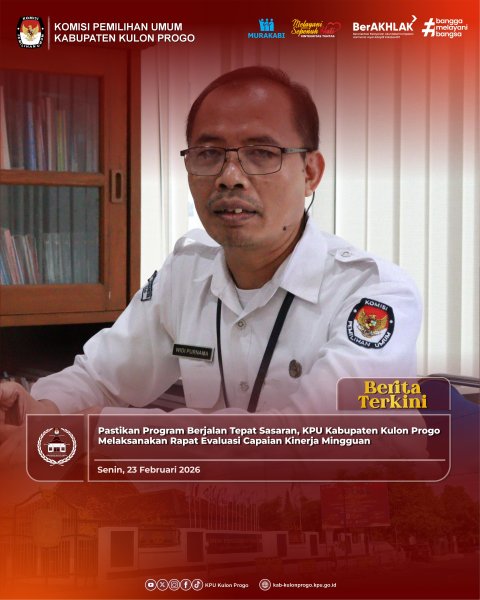Wates — Komisi Pemilihan Umum (KPU) Kabupaten Kulon Progo kembali melaksanakan Rapat Evaluasi Capaian Kinerja Mingguan pada Senin (23/2/2026) bertempat di Ruang Pendopo KPU Kabupaten Kulon Progo. Kegiatan rutin ini diikuti oleh Sekretaris, seluruh Kasubbag, Pejabat Pengadaan, Pengelola Keuangan, serta staf Subbagian Rendatin di lingkungan KPU Kabupaten Kulon Progo. Pada kesempatan kali ini, rapat dipimpin Sekretaris KPU Kabupaten Kulon Progo, Widi Purnama.