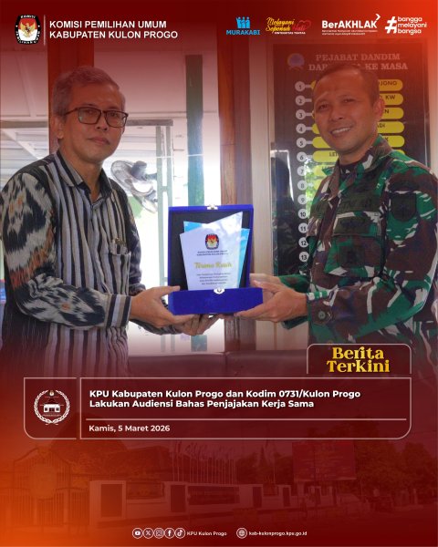 Kulon Progo, 5 Maret 2026 – Komisi Pemilihan Umum (KPU) Kabupaten Kulon Progo melakukan audiensi dengan Kodim 0731/Kulon Progo dalam rangka menjalin silaturahmi sekaligus melakukan penjajakan kerja sama kelembagaan. Kegiatan ini berlangsung di Markas Kodim 0731/Kulon Progo dan dihadiri Ketua dan Anggota KPU Kabupaten Kulon Progo.