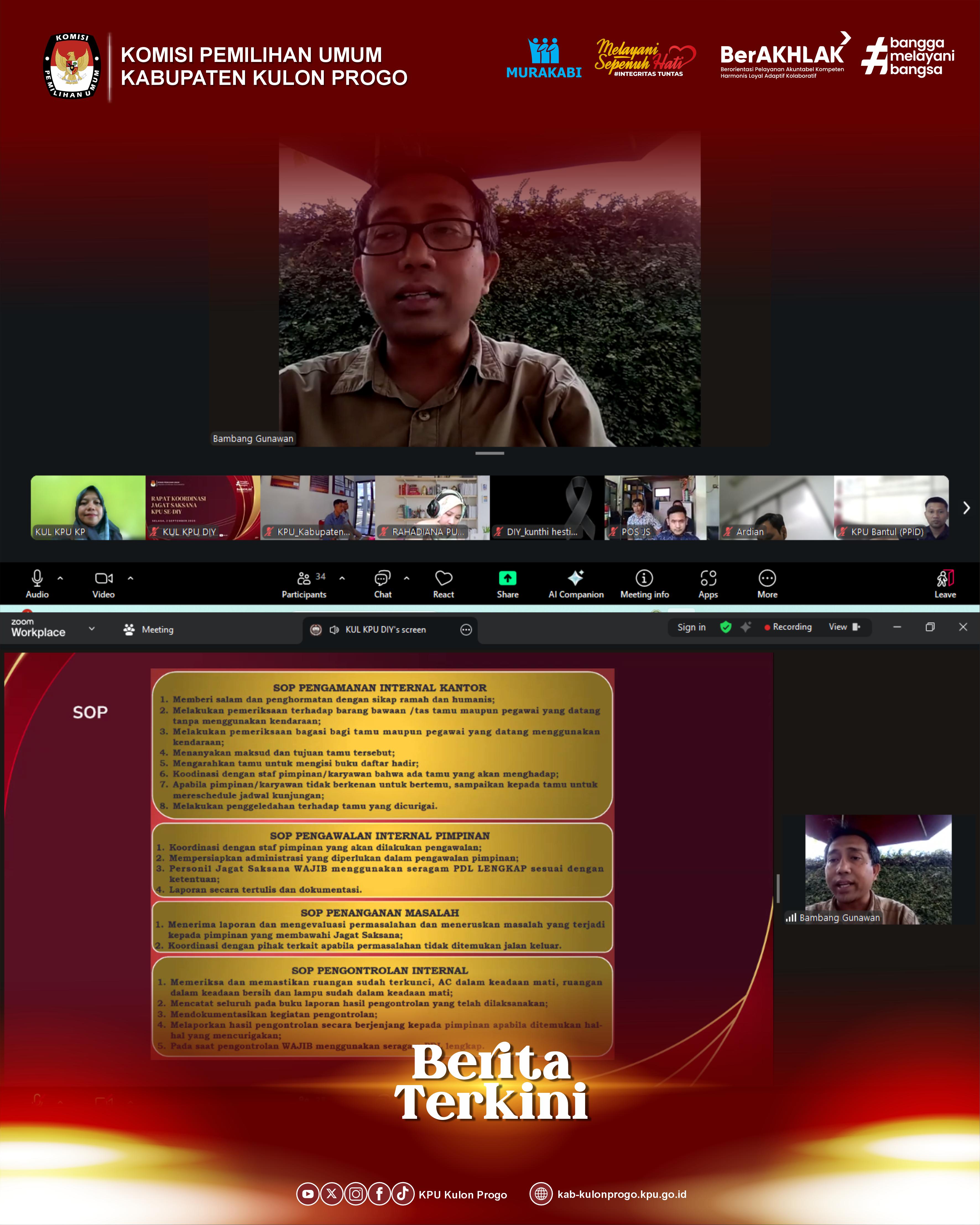 Komisi Pemilihan Umum Kulon Progo menghadiri Rapat Koordinasi Jagad saksana di Lingkungan KPU se-DIY tanggal 2 September 2025 yang dilakukan secara daring. Dalam rapat disampaikan beberapa hal yang terkait menjadi tugas dan tanggungjawab Jagad Saksana.