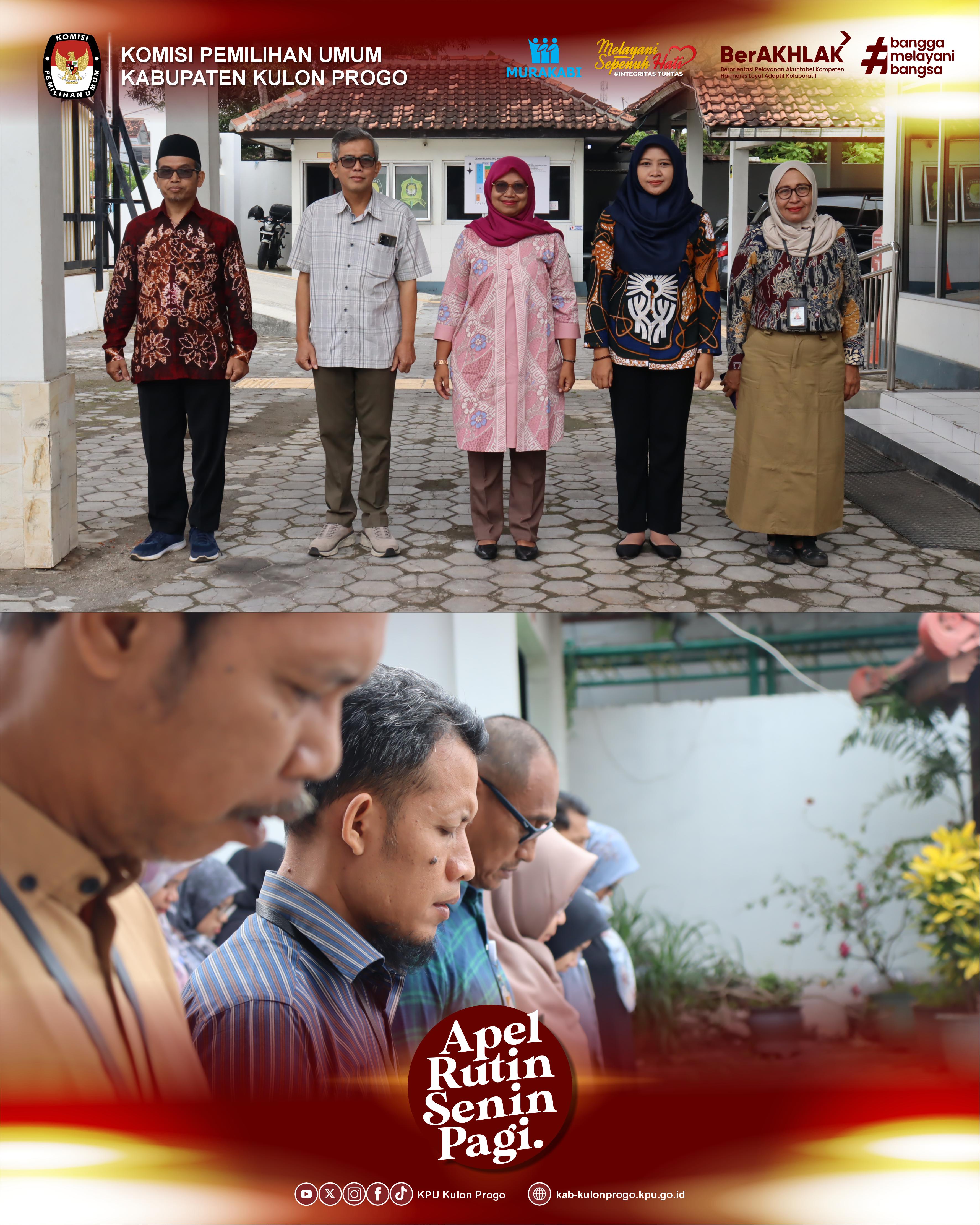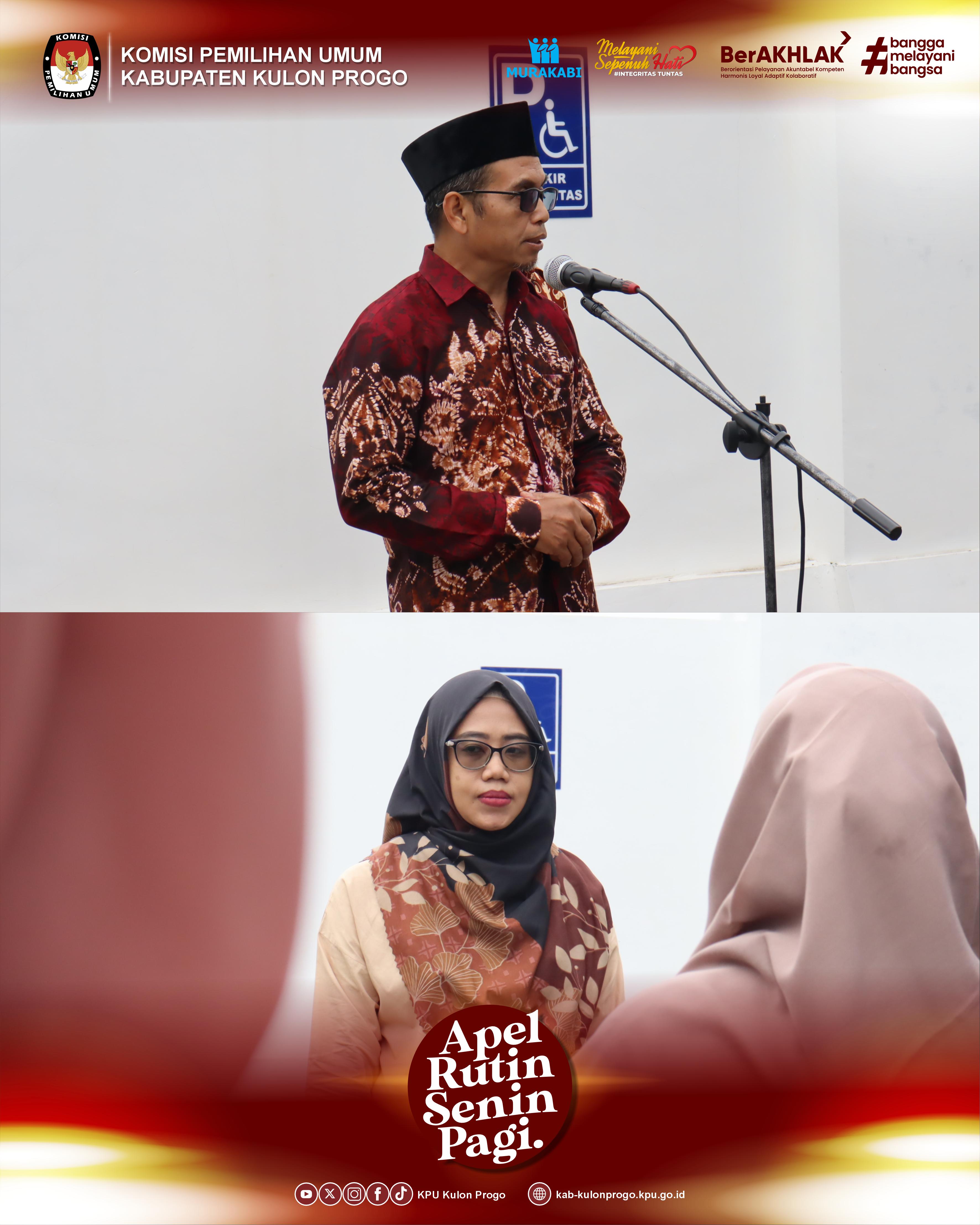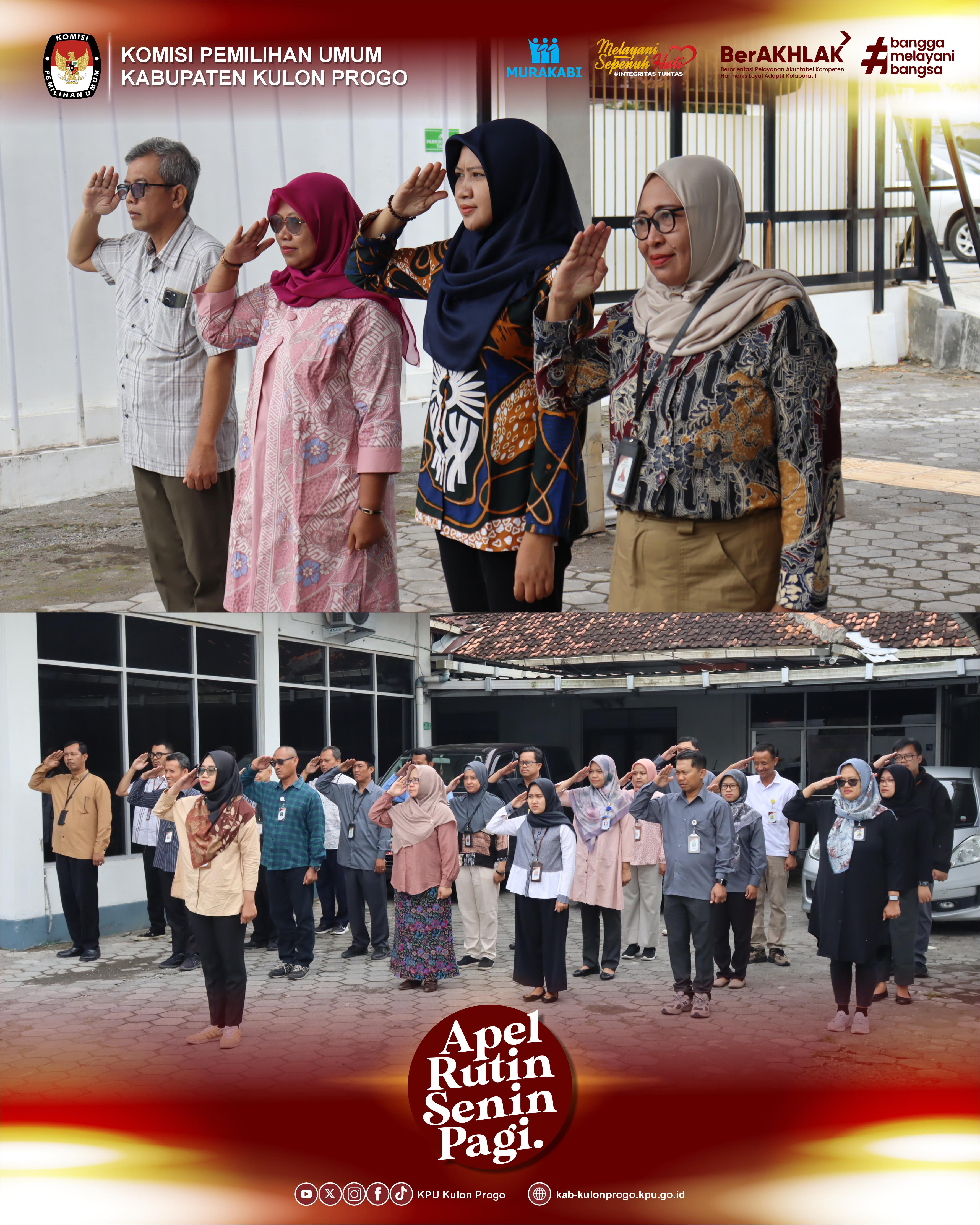 Senin, 8 September 2025 KPU Kabupaten Kulon Progo kembali melaksanakan apel rutin Senin pagi yang dilaksanakan di halaman kantor KPU Kabupaten Kulon Progo yang diikuti oleh Komisioner, Pejabat Struktural, Staf/Pelaksana dan PPNPN di lingkungan KPU Kabupaten Kulon Progo. Pembina apel pada kesempatan kali ini adalah Ketua Divisi Hukum dan Pengawasan KPU Kabupaten Kulon Progo, M. Puja Rasa Satuhu.