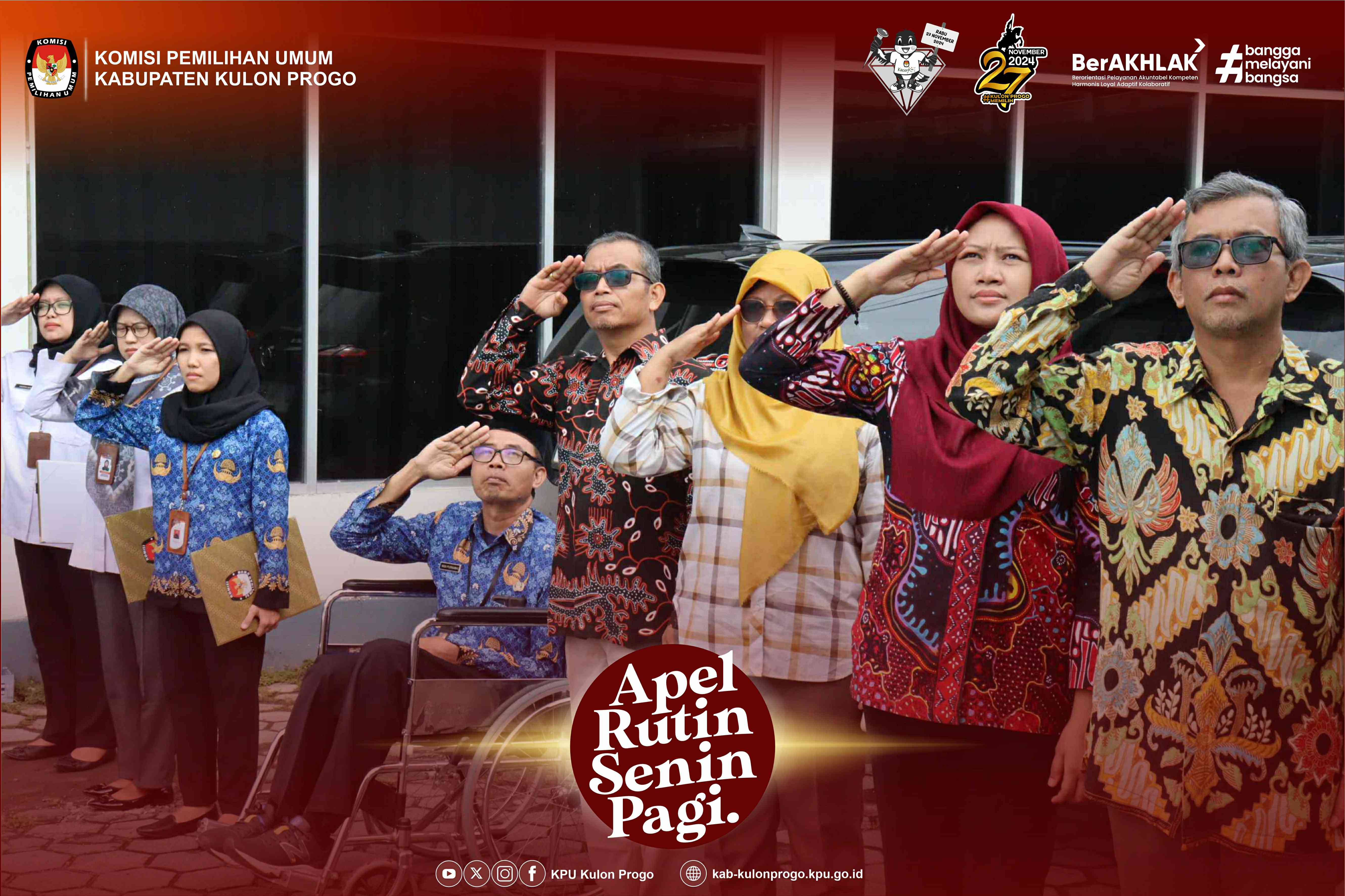 Senin, 17 Februari 2025 KPU Kabupaten Kulon Progo kembali melaksanakan apel rutin Senin pagi yang dilaksanakan di halaman kantor KPU Kabupaten Kulon Progo yang diikuti oleh Komisioner, Pejabat Struktural, Staf/Pelaksana dan PPNPN di lingkungan KPU Kabupaten Kulon Progo. Pembina apel pada kesempatan kali ini adalah Ketua Divisi Teknis Penyelenggaraan, Hidayatut Thoyyibah.