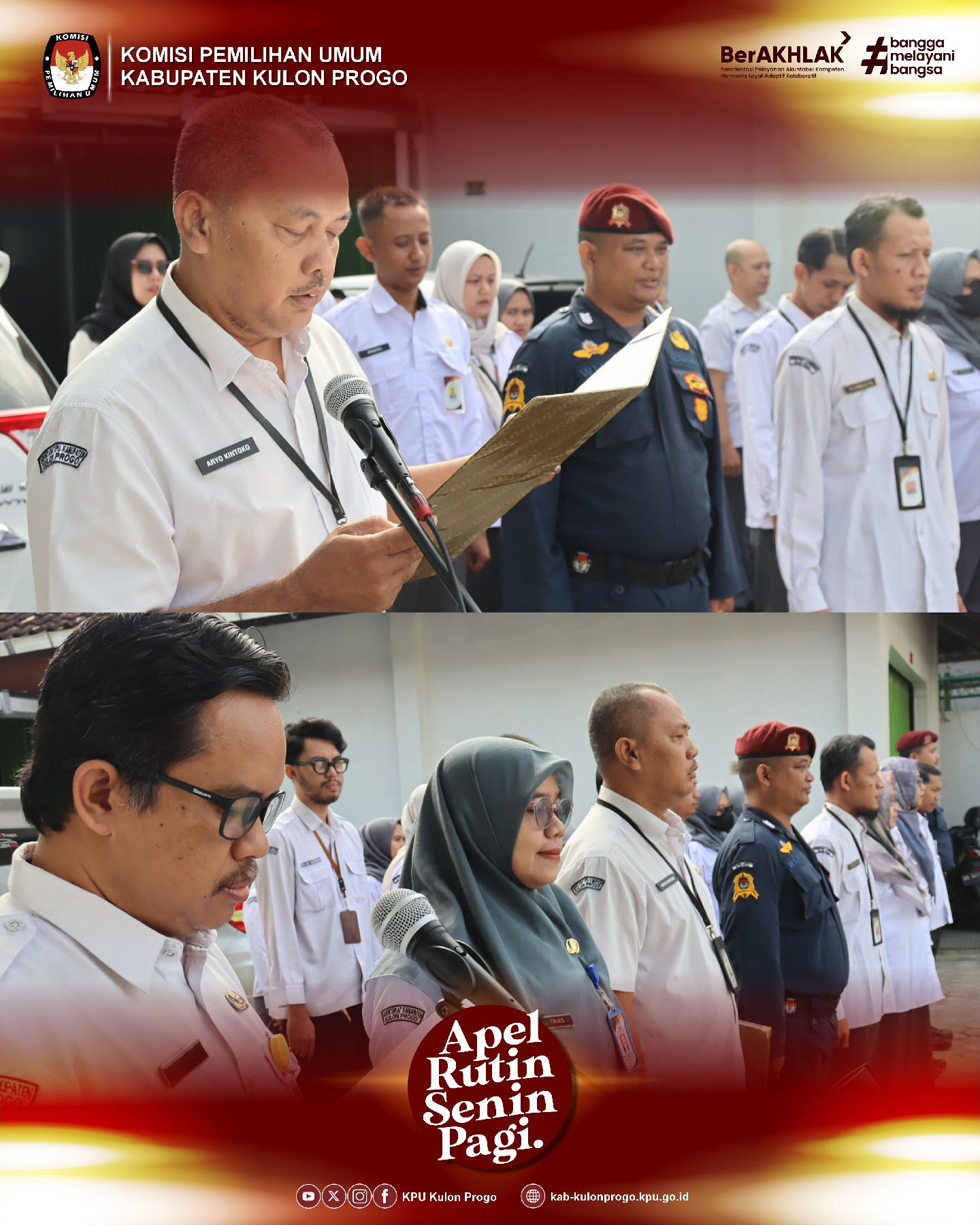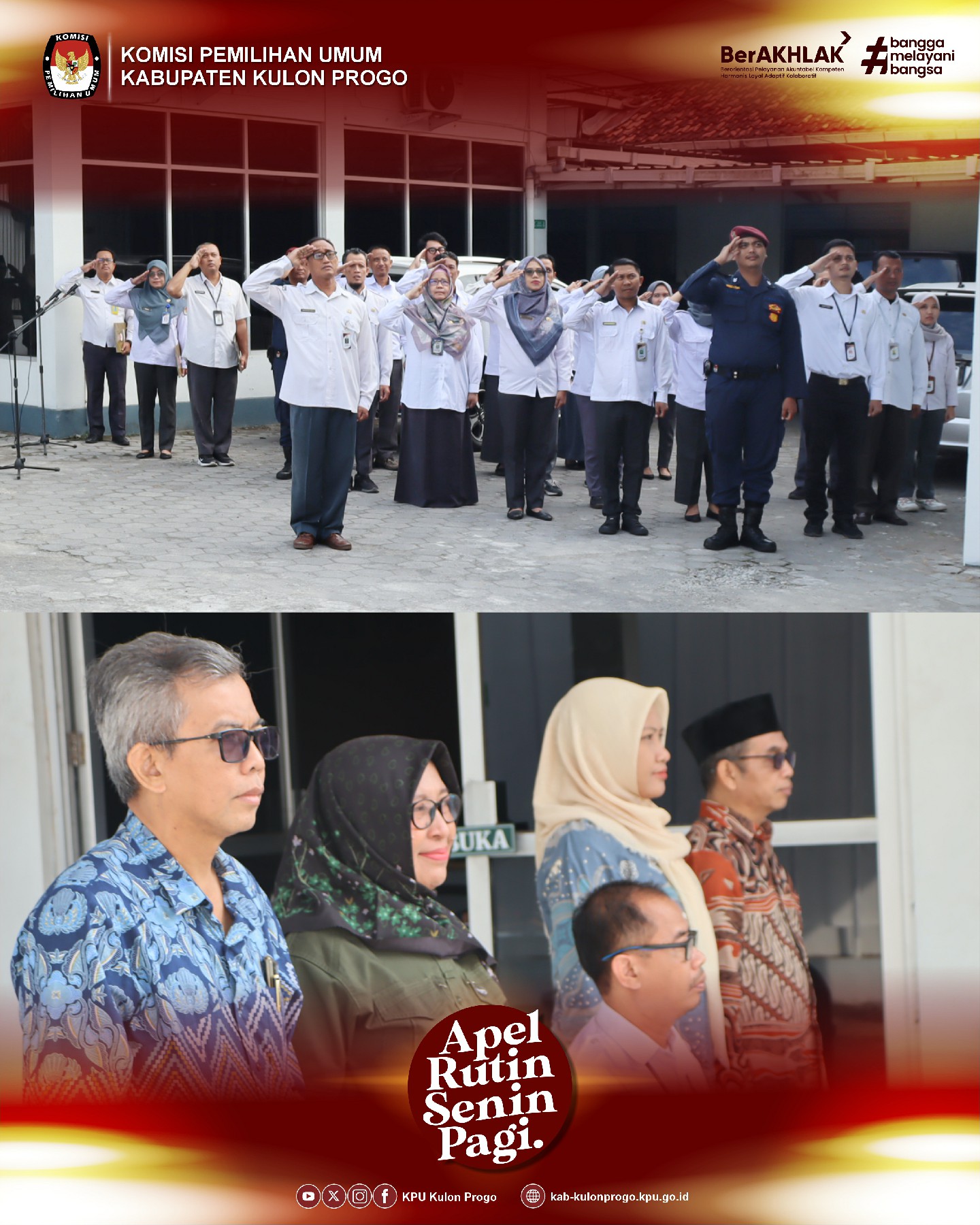 Senin, 14 Juli 2025, KPU Kabupaten Kulon Progo kembali melaksanakan apel rutin Senin pagi yang dilaksanakan di halaman kantor KPU Kabupaten Kulon Progo, yang diikuti oleh komisioner, pejabat struktural, staf/pelaksana, dan PPNPN di lingkungan KPU Kabupaten Kulon Progo. Pembina apel pada kesempatan kali ini adalah Ketua Divisi Partisipasi Masyarakat dan SDM KPU Kabupaten Kulon Progo, Aris Zurkhasanah.