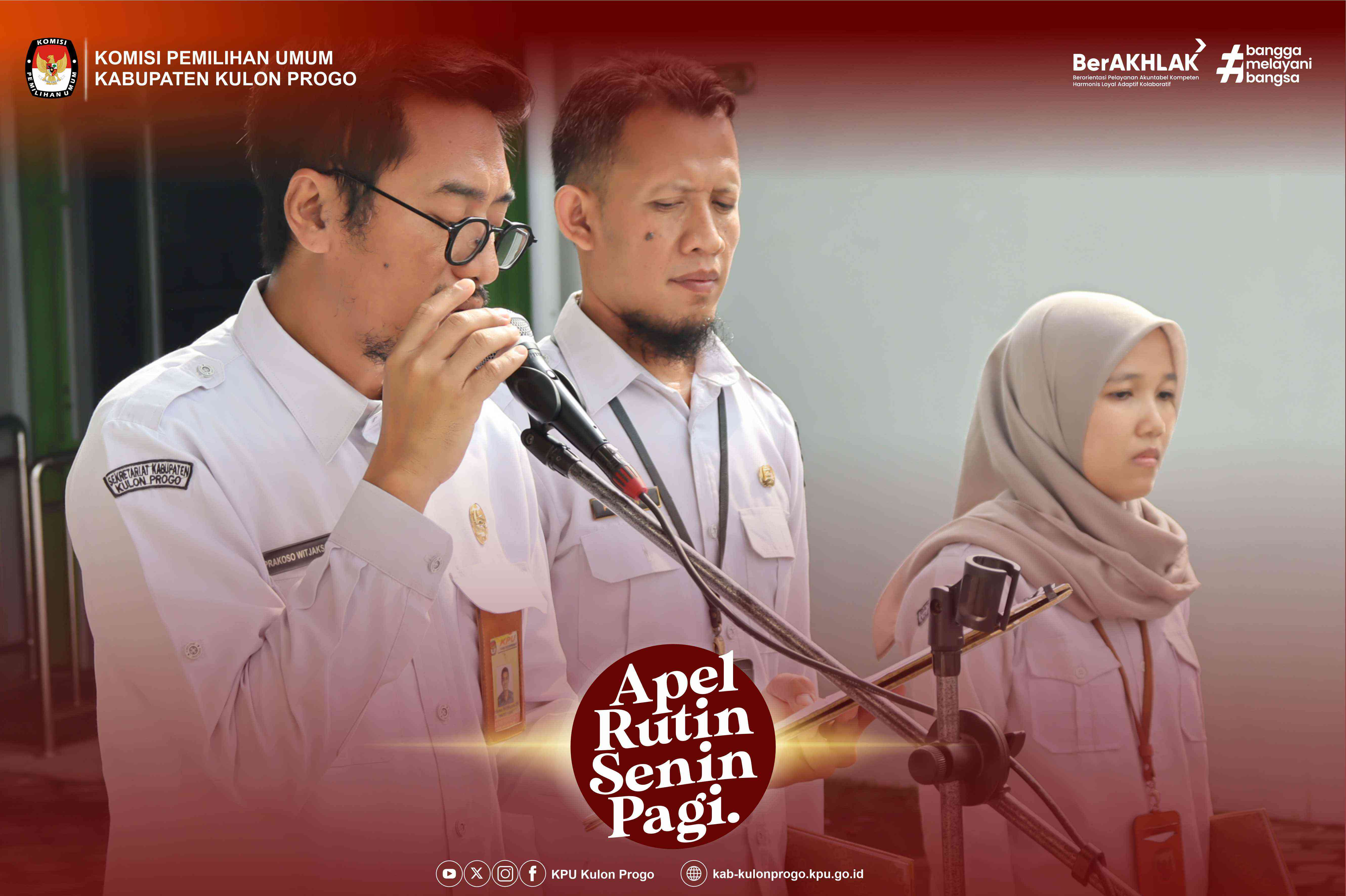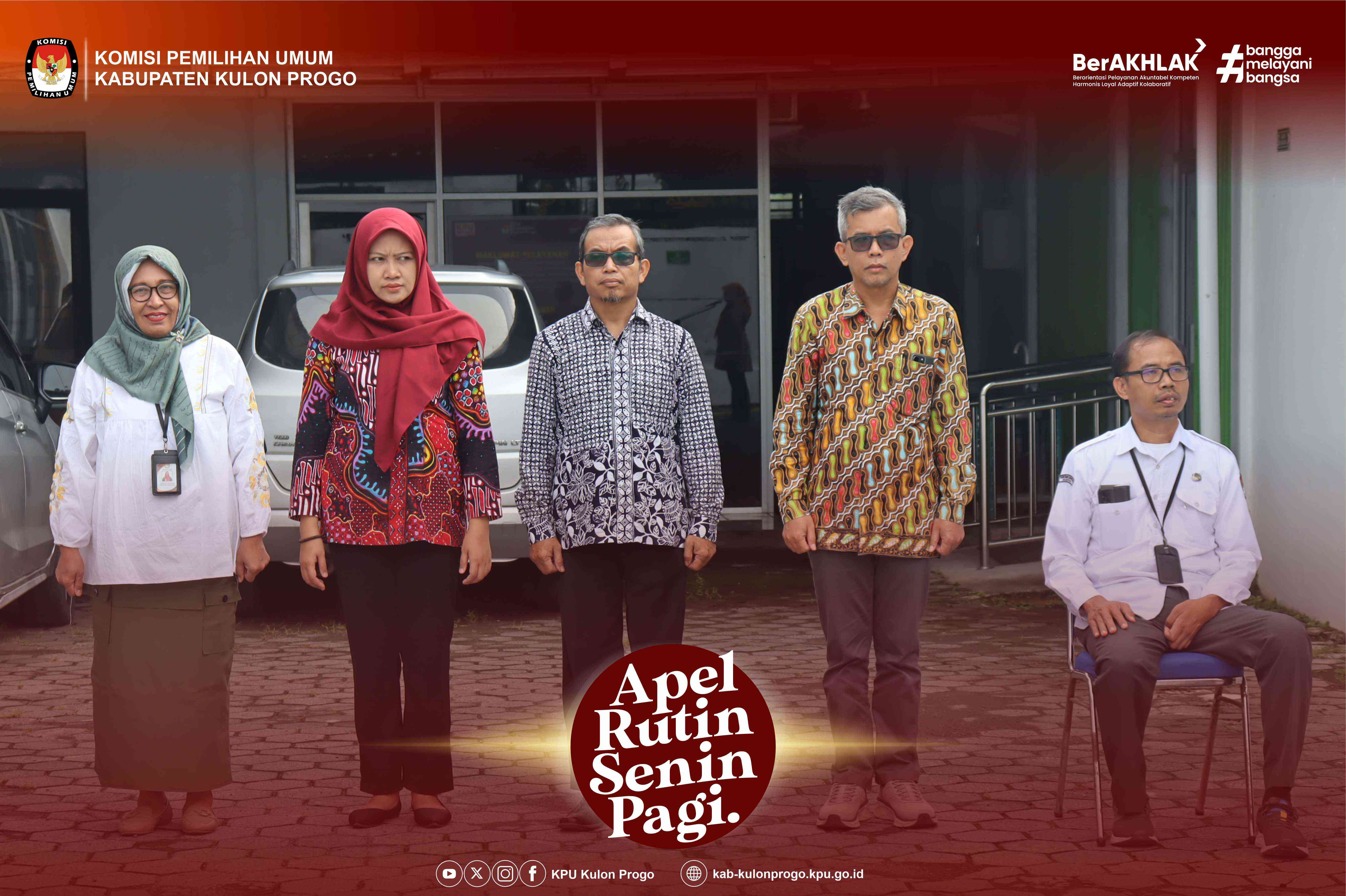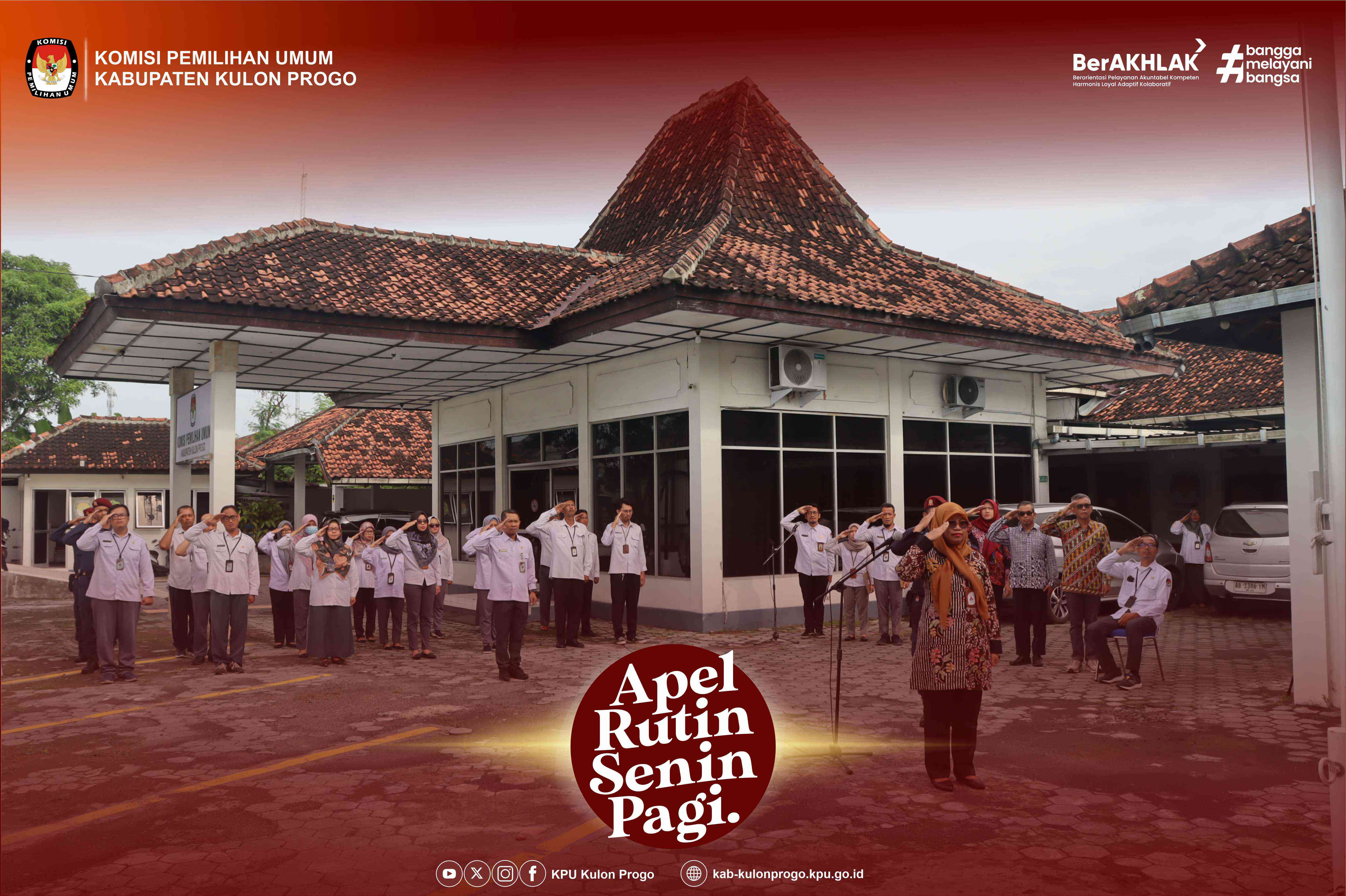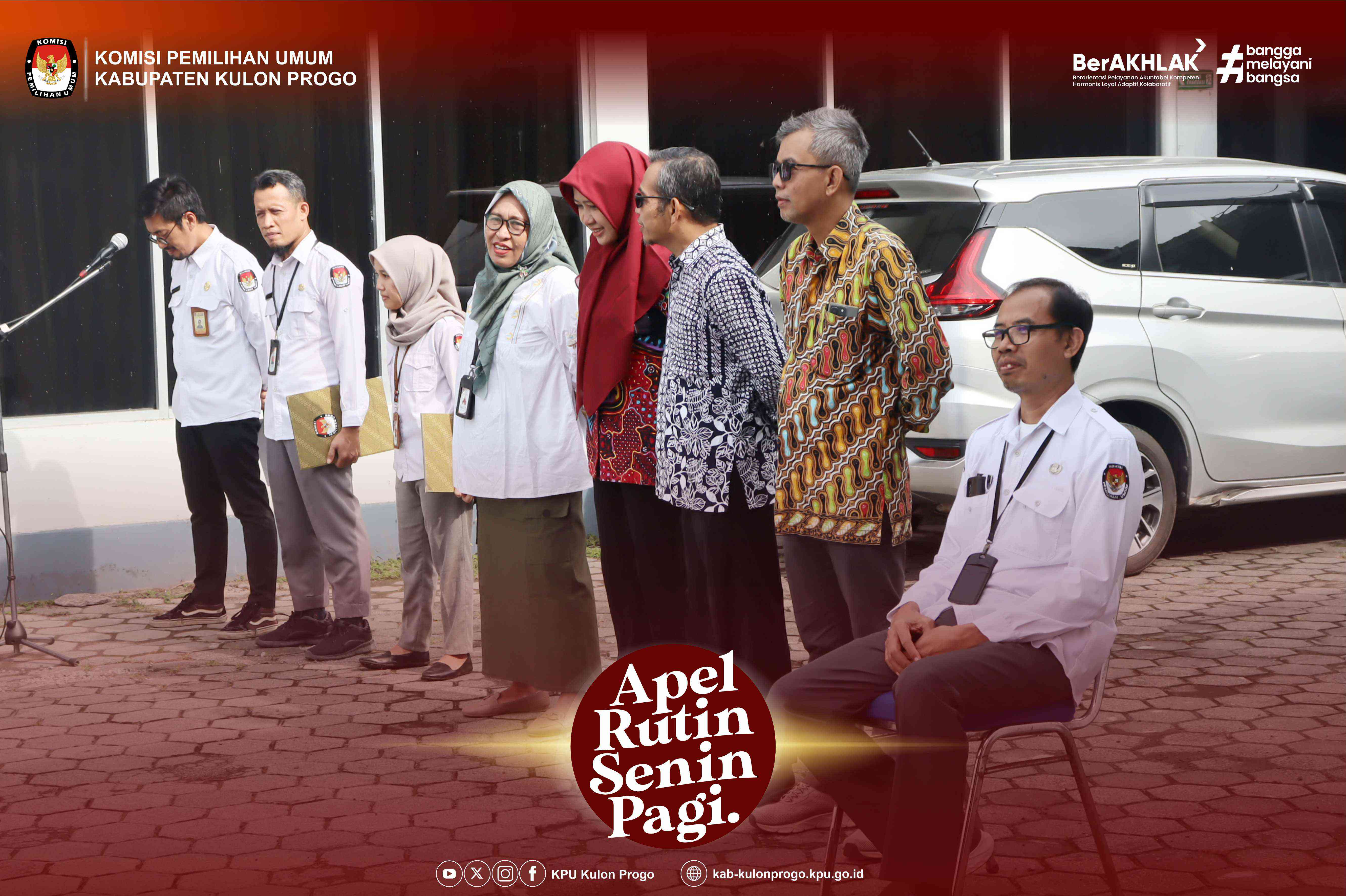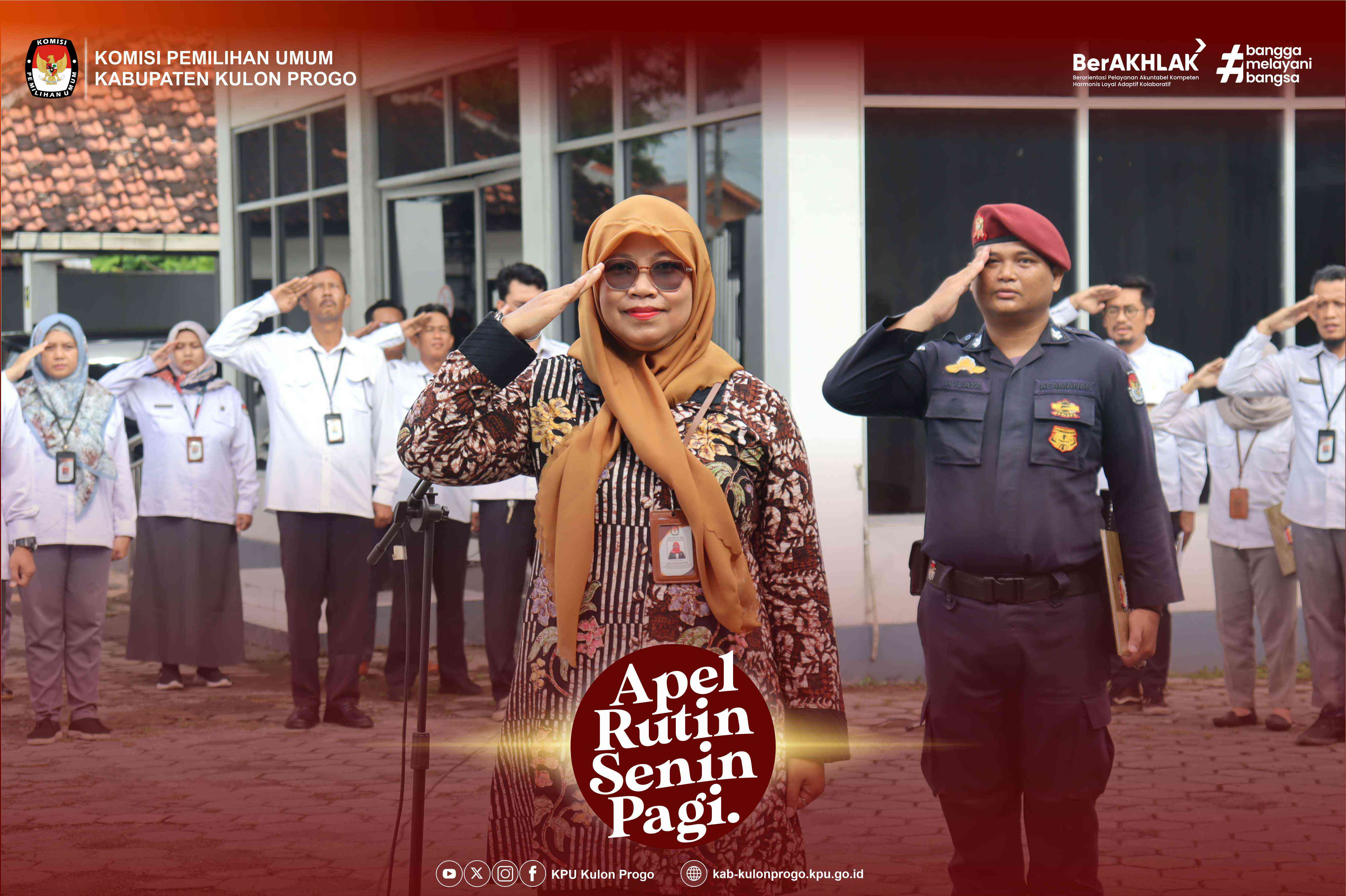 Senin, 10 Maret 2025 KPU Kabupaten Kulon Progo kembali melaksanakan apel rutin Senin pagi yang dilaksanakan di halaman kantor KPU Kabupaten Kulon Progo yang diikuti oleh Komisioner, Pejabat Struktural, Staf/Pelaksana dan PPNPN di lingkungan KPU Kabupaten Kulon Progo. Pembina apel pada kesempatan kali ini adalah Ketua Divisi Sosialisasi, Pendidikan Pemilih, Parmas dan SDM KPU Kabupaten Kulon Progo, Aris Zurkhasanah.