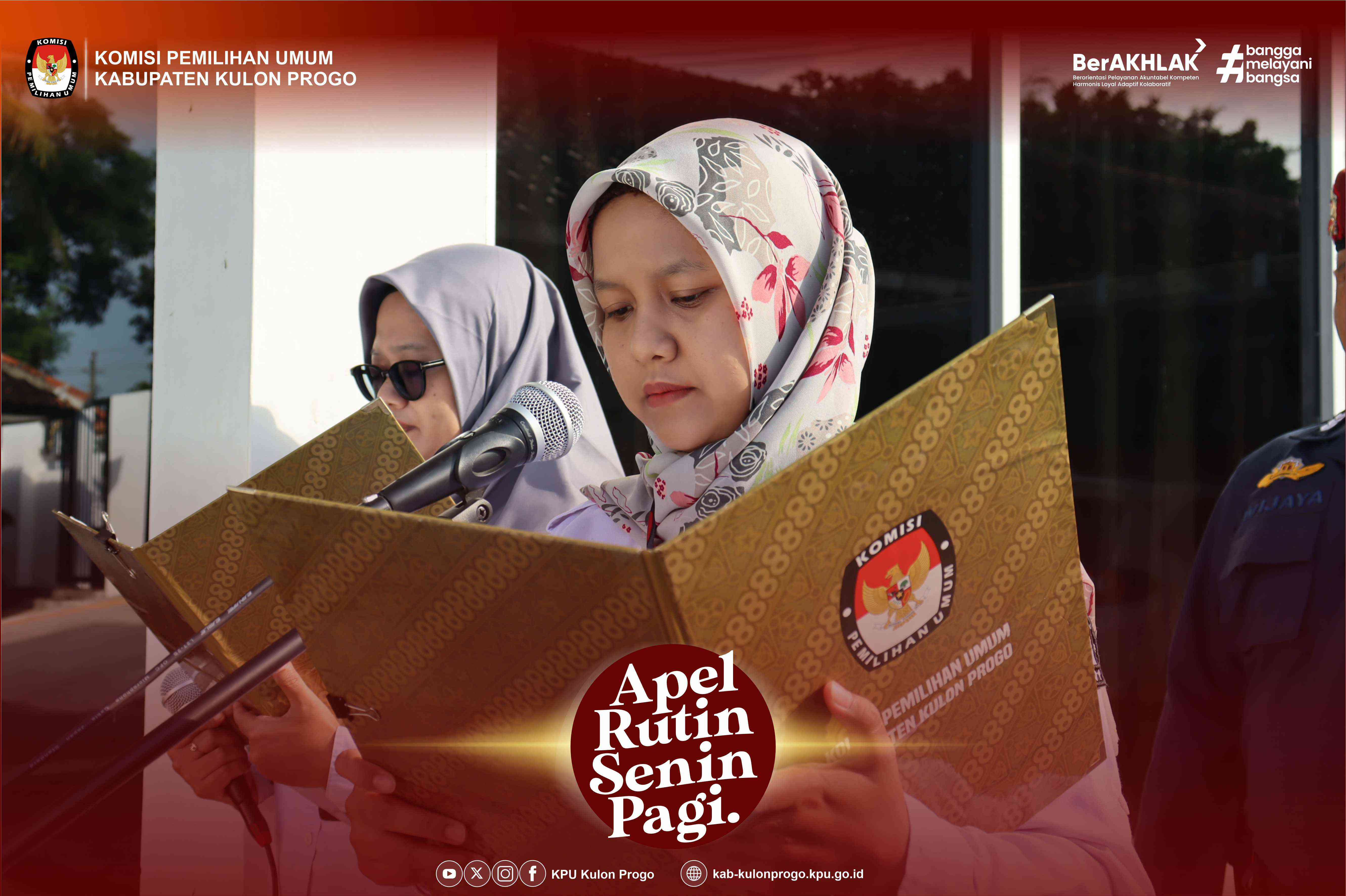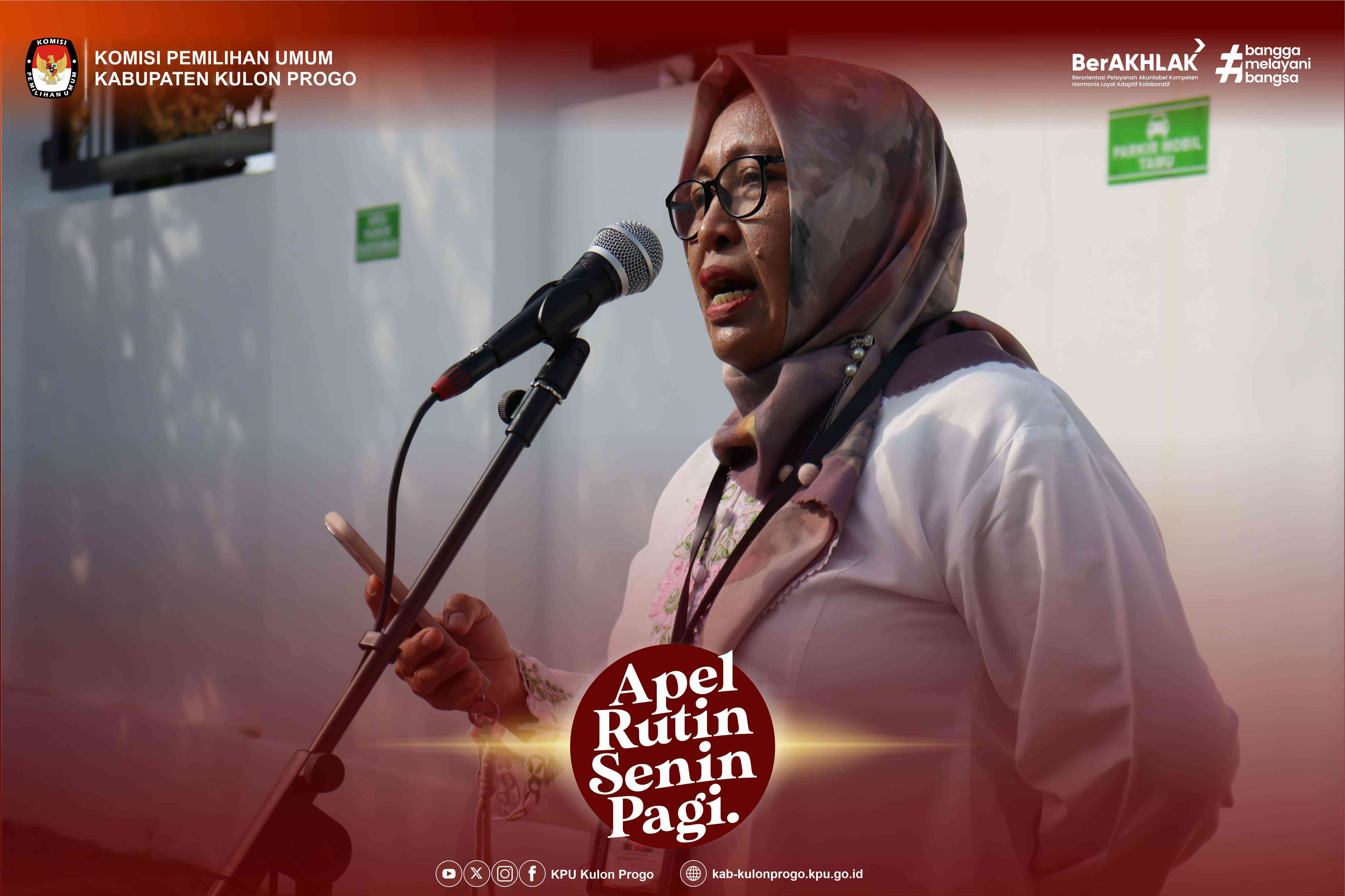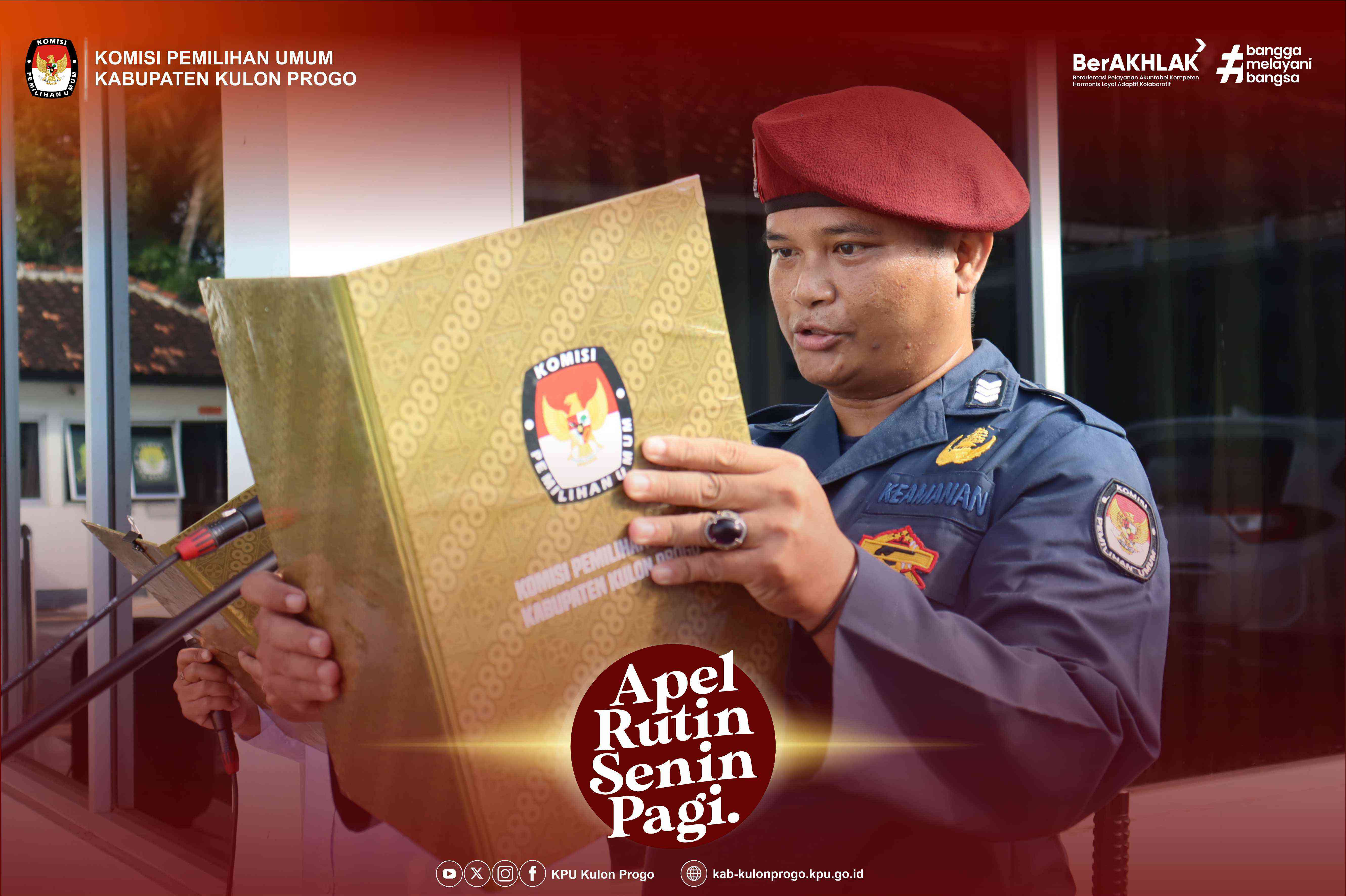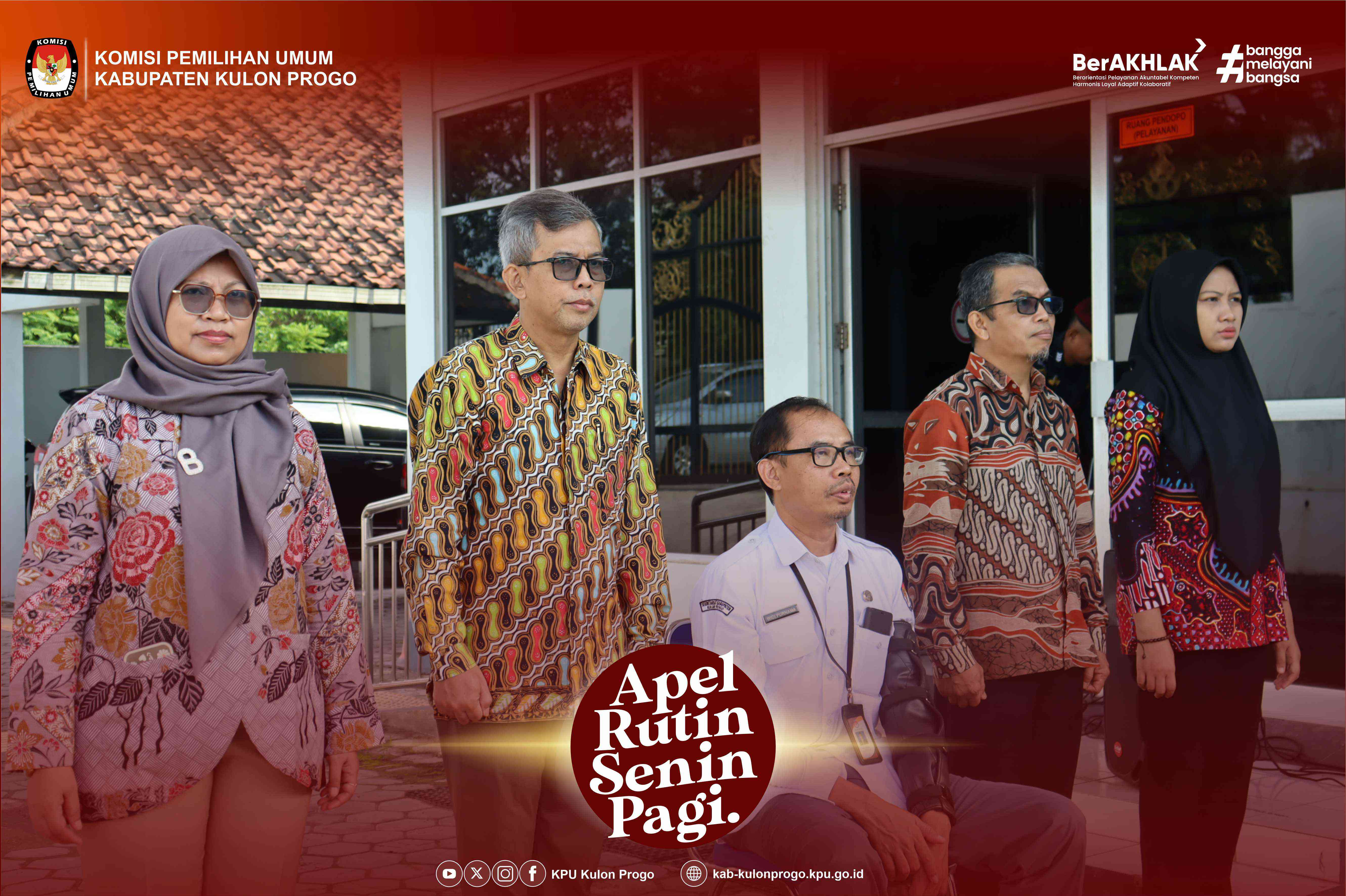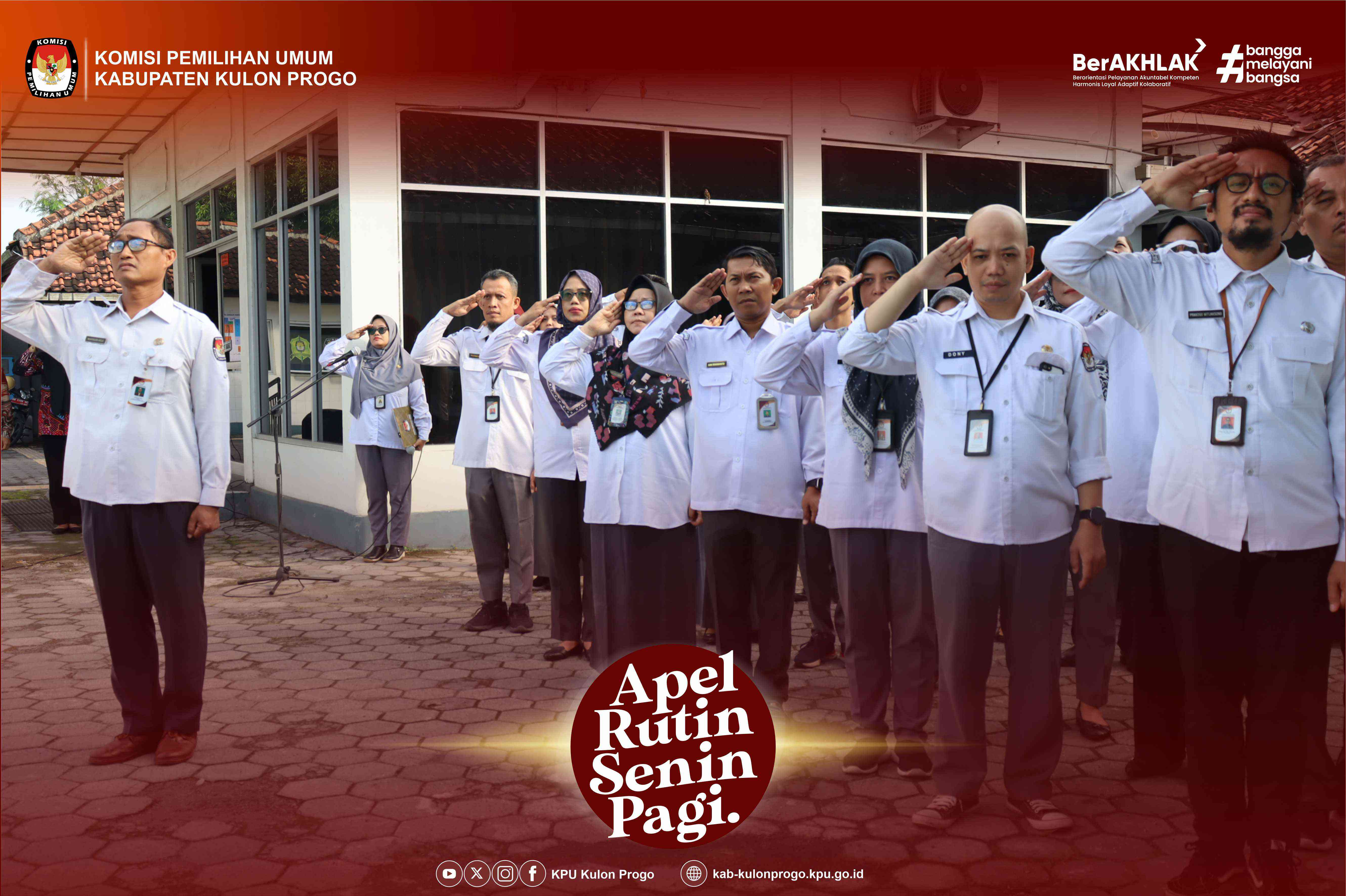 Senin, 16 Juni 2025 KPU Kabupaten Kulon Progo kembali melaksanakan apel rutin Senin pagi yang dilaksanakan di halaman kantor KPU Kabupaten Kulon Progo yang diikuti oleh Komisioner, Pejabat Struktural, Staf/Pelaksana dan PPNPN di lingkungan KPU Kabupaten Kulon Progo. Pembina apel pada kesempatan kali ini adalah Ketua Divisi Teknis Penyelenggaraan KPU Kabupaten Kulon Progo, Hidayatut Thoyyibah.