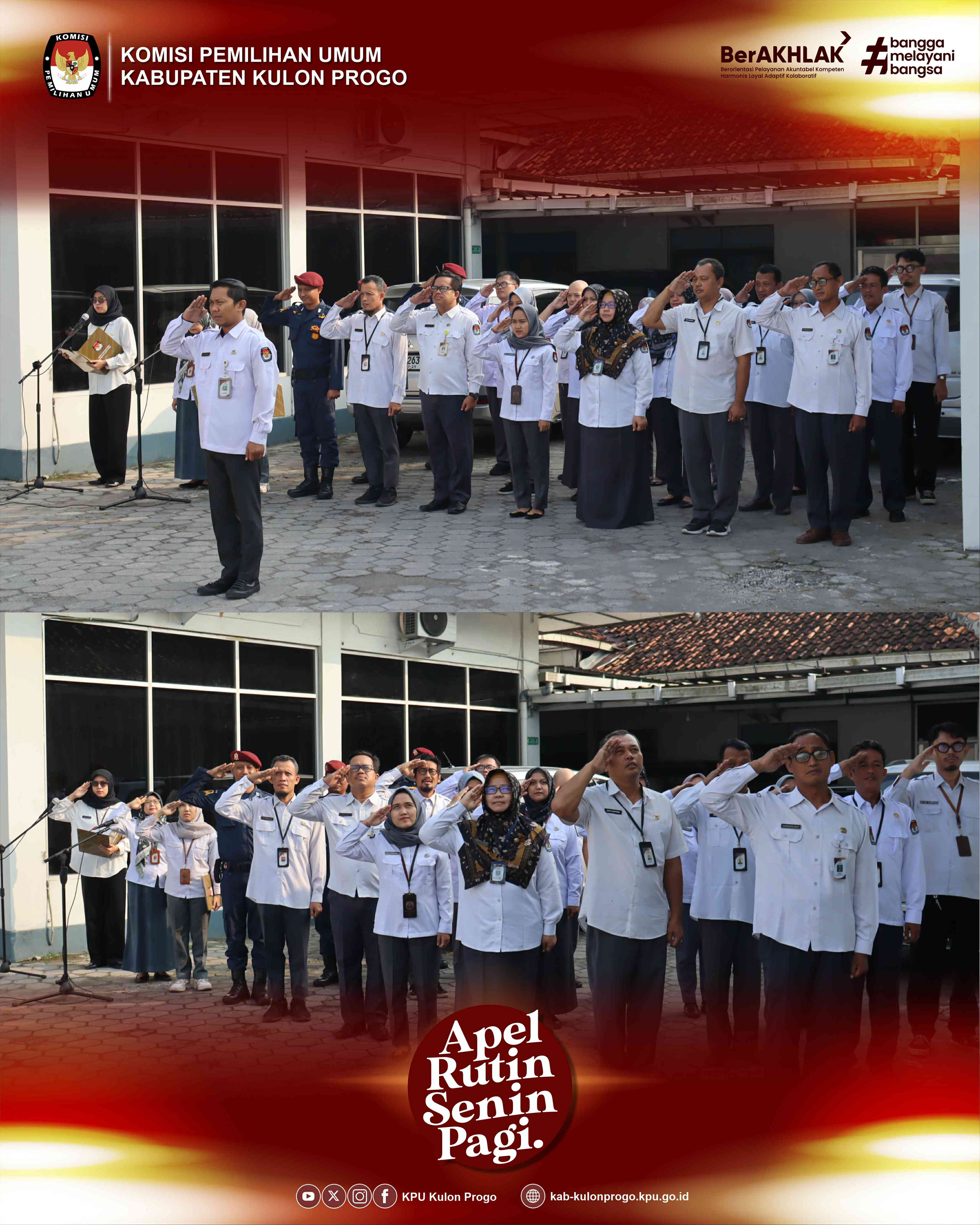 Senin, 23 Juni 2025 KPU Kabupaten Kulon Progo kembali melaksanakan apel rutin Senin pagi yang dilaksanakan di halaman kantor KPU Kabupaten Kulon Progo yang diikuti oleh Komisioner, Pejabat Struktural, Staf/Pelaksana dan PPNPN di lingkungan KPU Kabupaten Kulon Progo. Pembina apel pada kesempatan kali ini adalah Ketua Divisi Hukum dan Pengawasan KPU Kabupaten Kulon Progo, M. Puja Rasa Satuhu.
