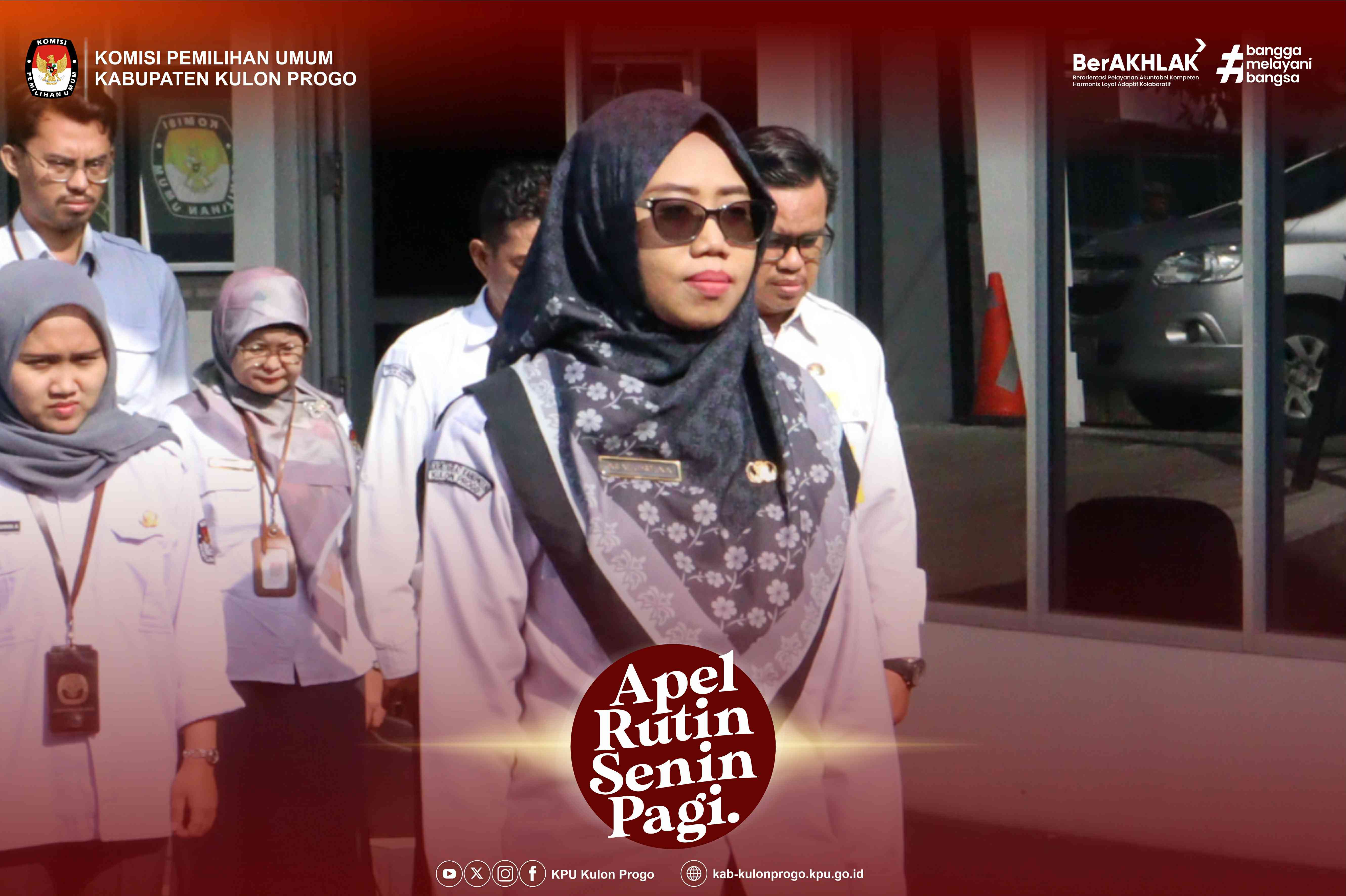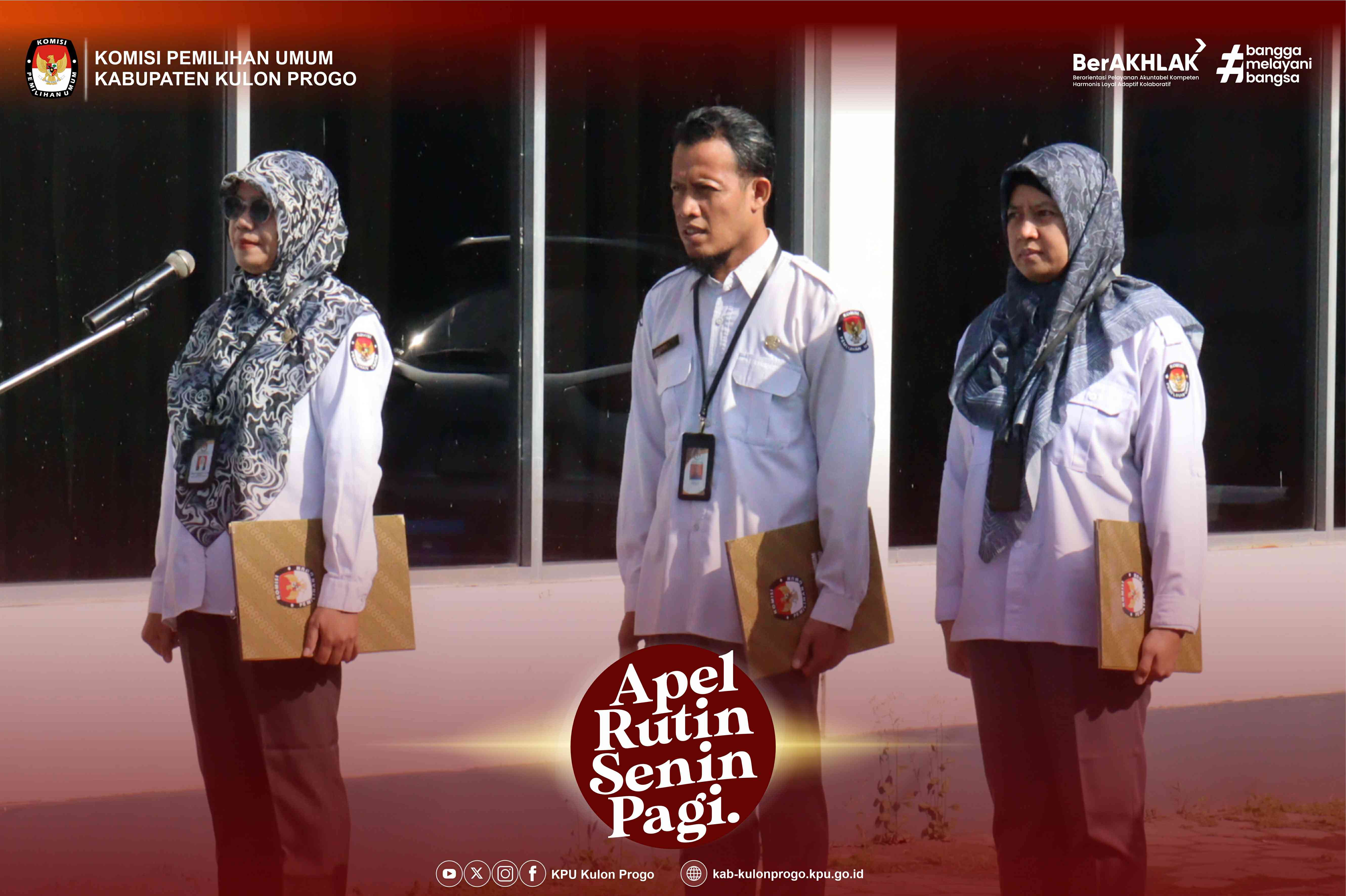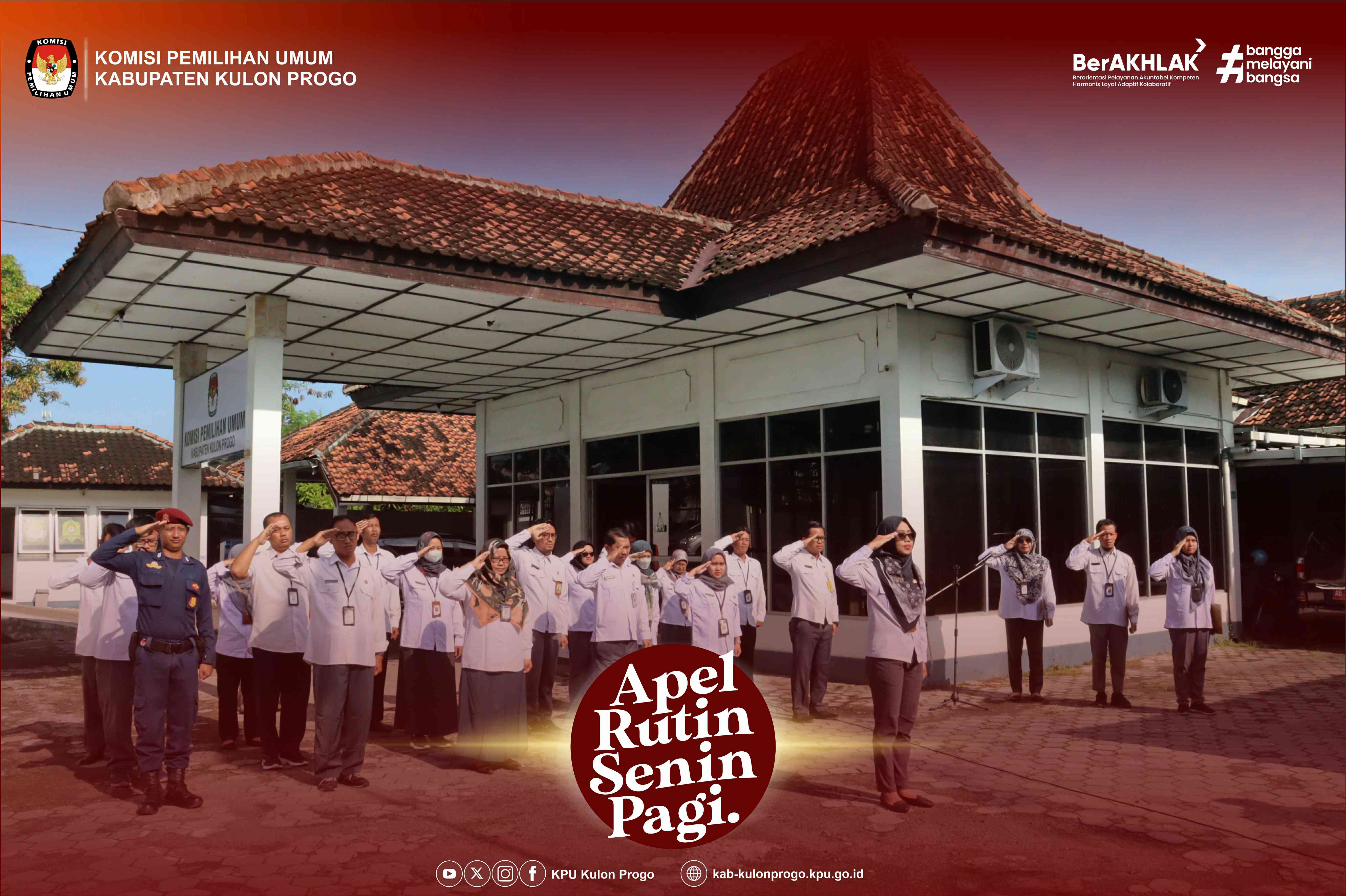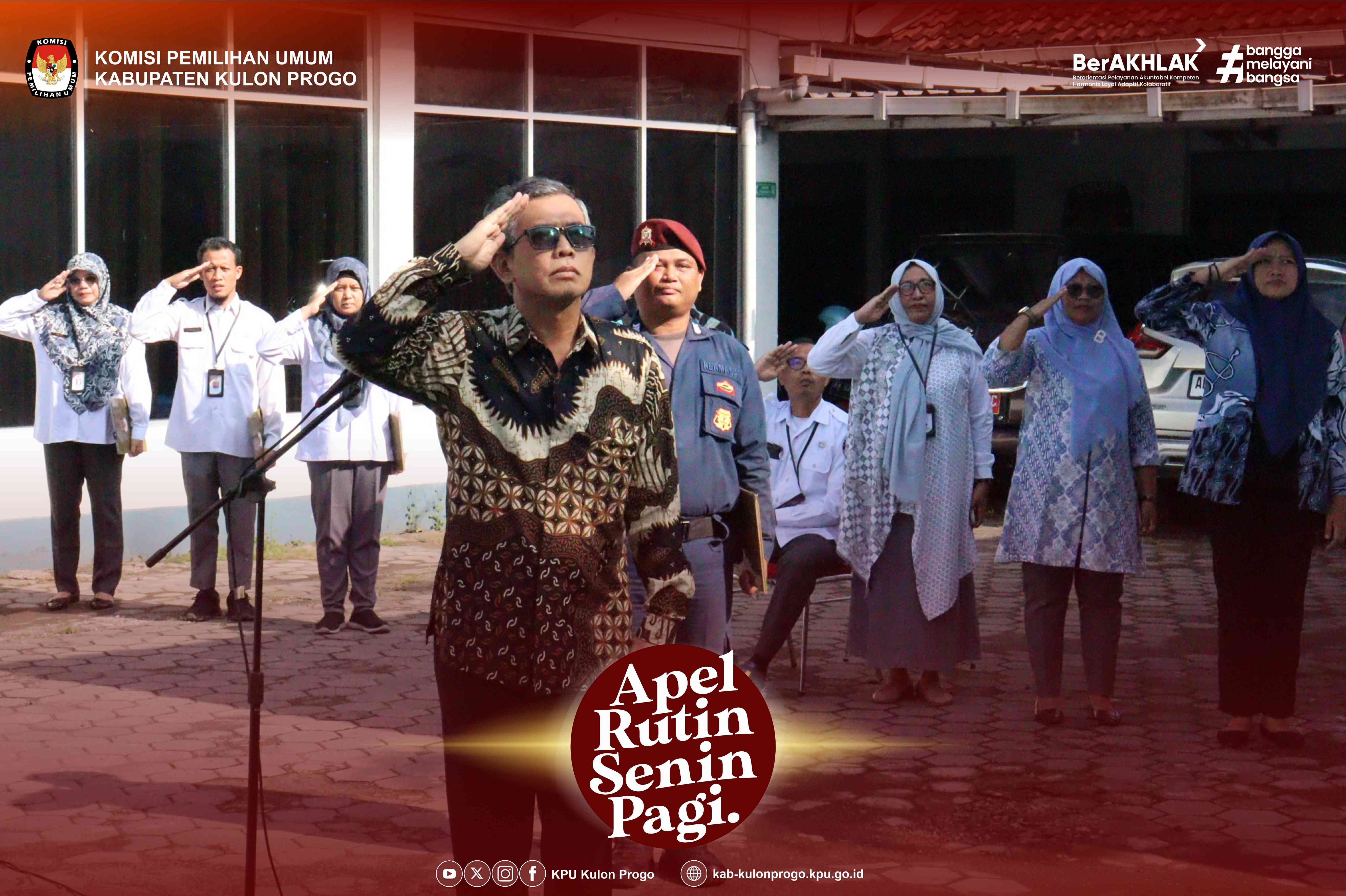 Senin, 24 Februari 2025 KPU Kabupaten Kulon Progo kembali melaksanakan apel rutin Senin pagi yang dilaksanakan di halaman kantor KPU Kabupaten Kulon Progo yang diikuti oleh Komisioner, Pejabat Struktural, Staf/Pelaksana dan PPNPN di lingkungan KPU Kabupaten Kulon Progo. Pembina apel pada kesempatan kali ini adalah Ketua KPU Kabupaten Kulon Progo, Budi Priyana.