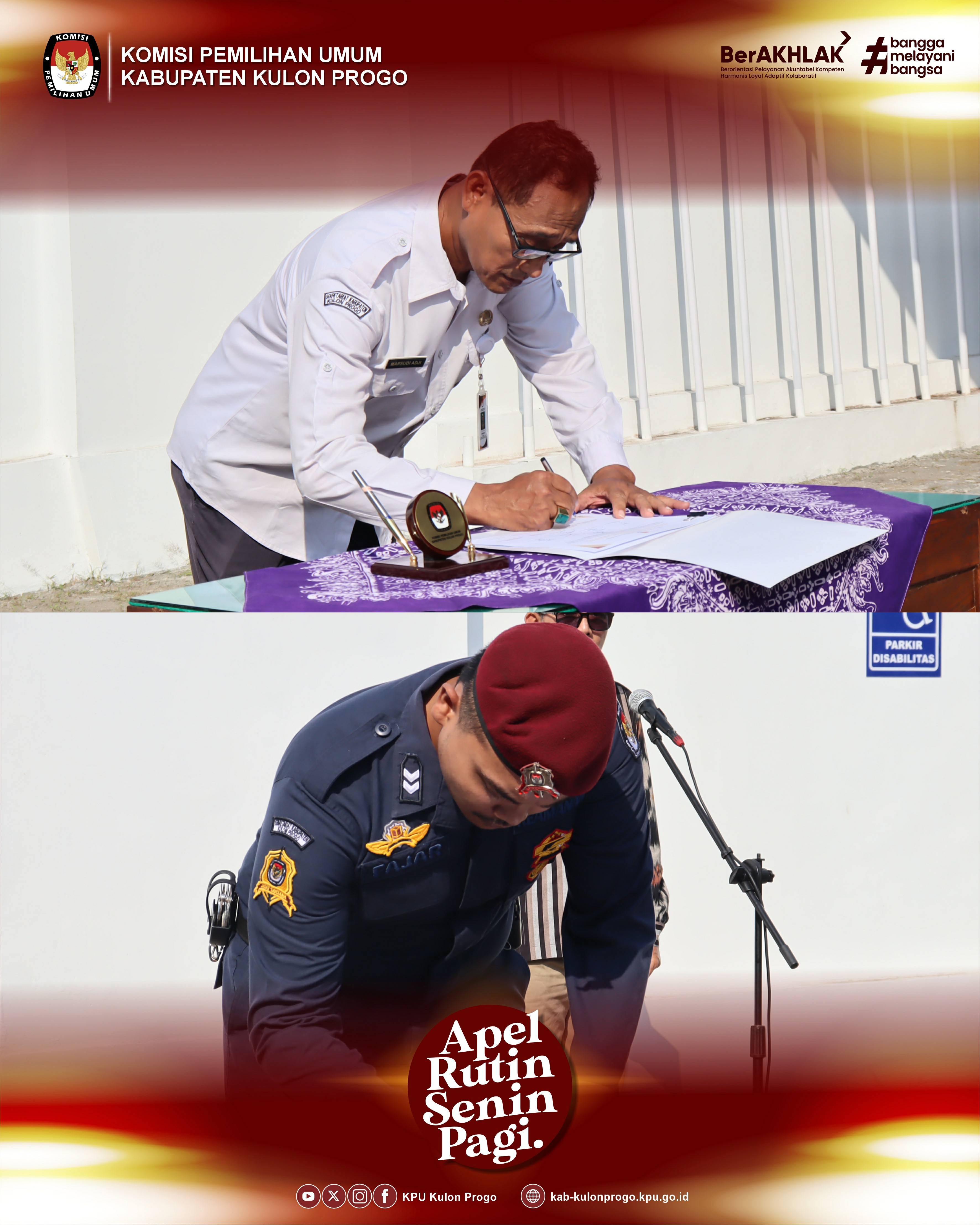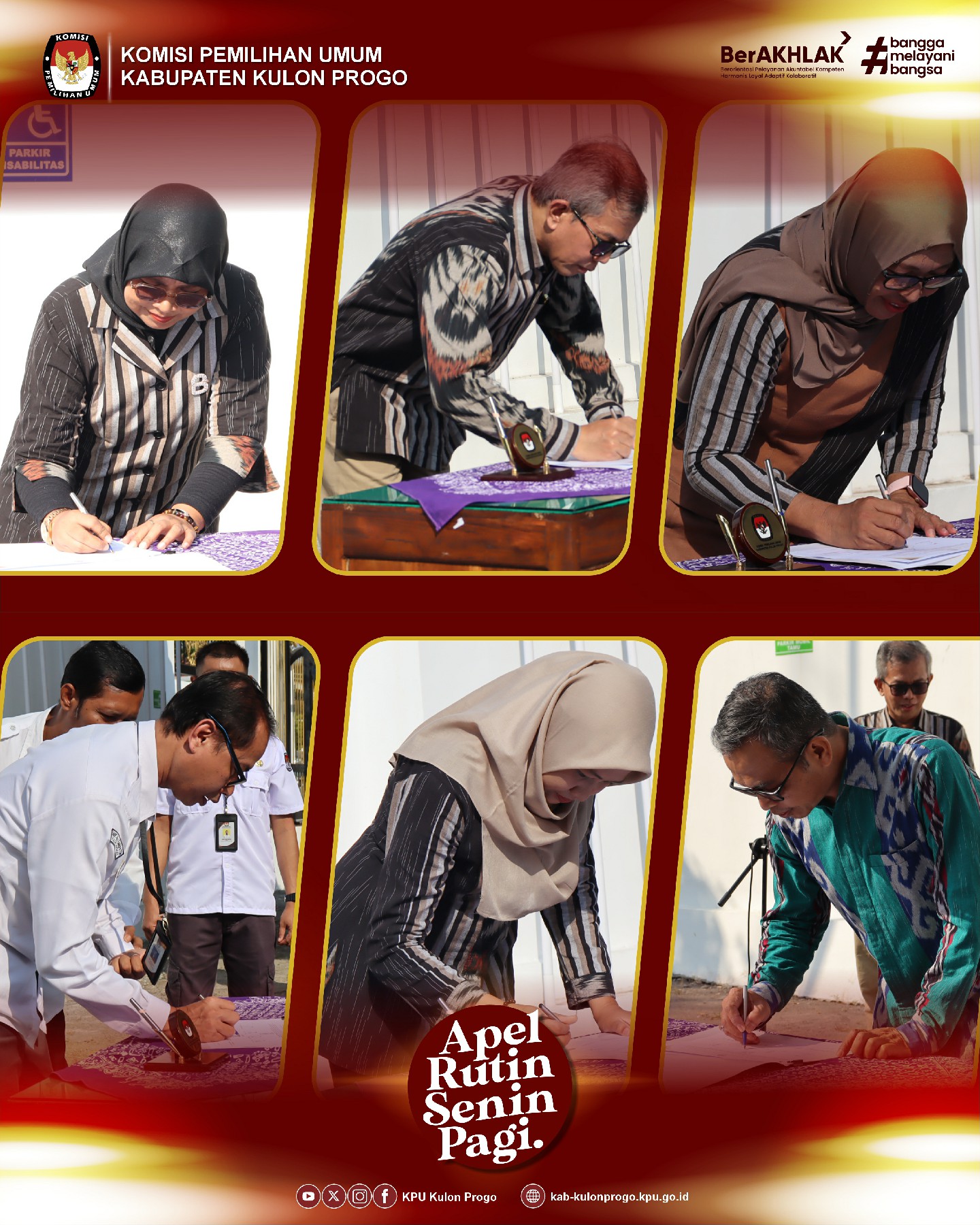 Sedikit berbeda dengan apel rutin sebelumnya, KPU Kabupaten Kulon Progo pada apel kali ini melaksanakan aksi deklarasi penguatan kembali komitmen bersama implementasi reformasi birokrasi zona integritas dan pelayanan publik, dengan penandatanganan dokumen komitmen bersama budaya kerja "MURAKABI" dalam pelaksanaan reformasi birokrasi dalam membangun zona intergritas oleh ketua, anggota, sekretaris dan sekretariat KPU Kabupaten Kulon Progo sebagai bentuk tanggungjawab sebagai lembaga pelayan publik.