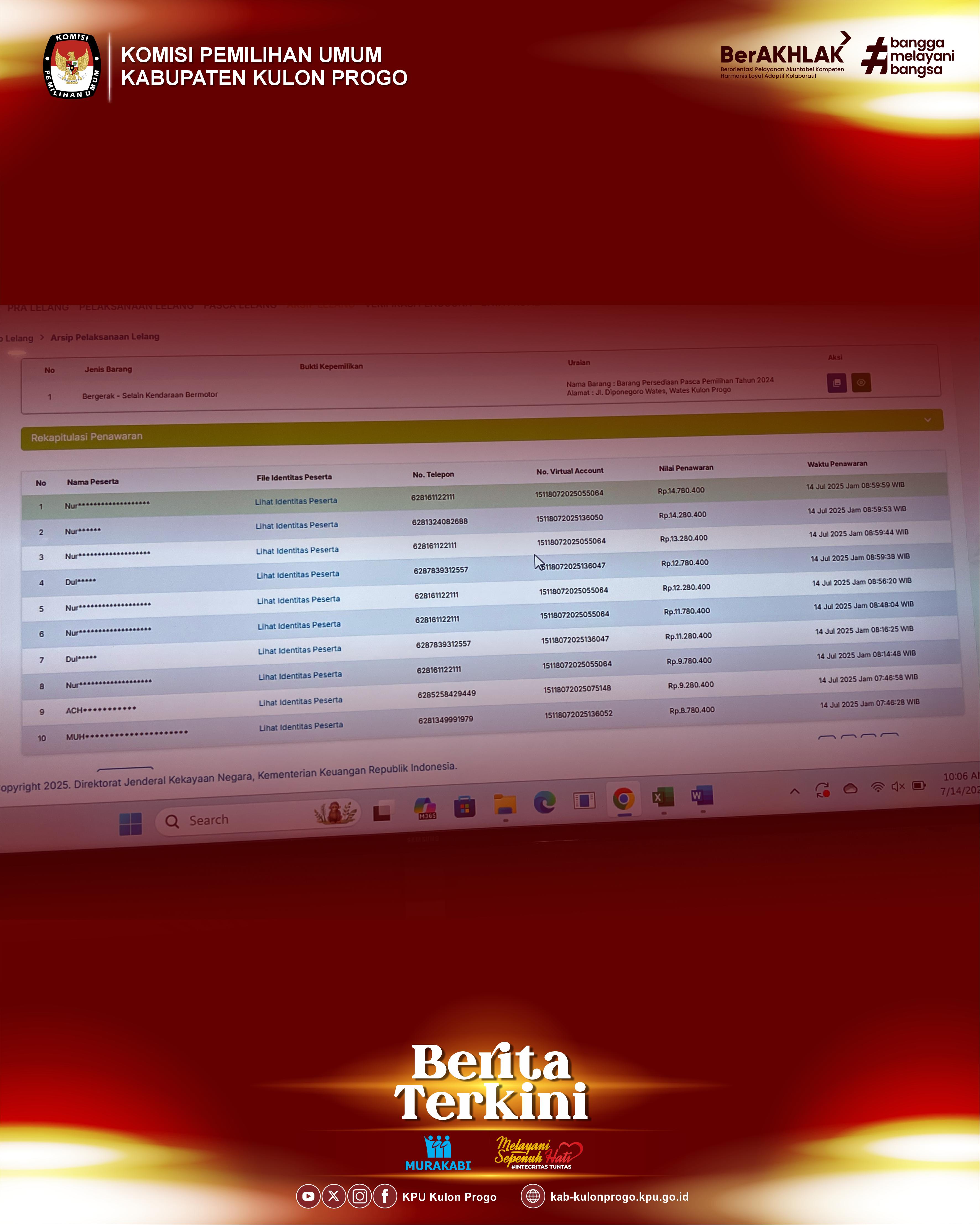 Senin, 14 Juli 2025, KPU Kabupaten Kulon Progo telah berhasil menjual Barang Persediaan Pasca Pemilihan Umum 2024 secara Lelang melalui Kantor Pelayanan Kekayaan Negara dan Lelang (KPKNL) Yogyakarta.