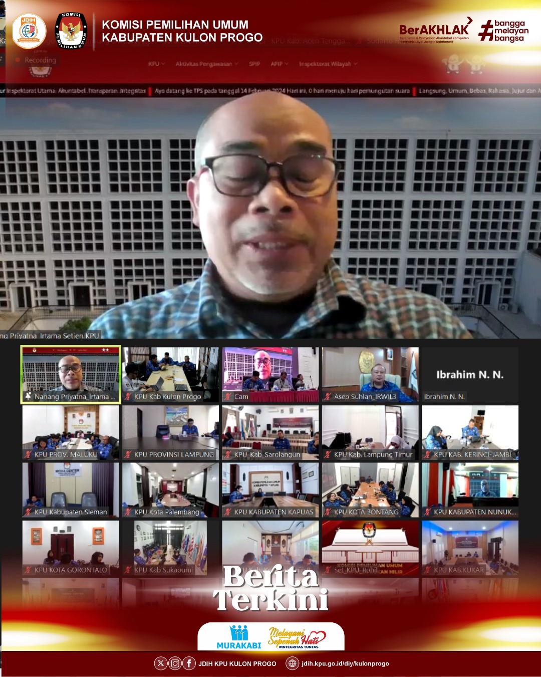 Wates, 17 Juli 2025, KPU Kabupaten Kulon Progo mengikuti Bimtek Pengisian Kertas Kerja Pelaksanaan Penilaian Mandiri Maturitas Penyelenggaraan SPIP Terintegrasi Tahun 2025 yang diadakan oleh KPU RI, dan diikuti oleh seluruh Ketua KPU Provinsi dan Kabupaten/Kota se-Indonesia, Ketua Divisi Hukum dan Pengawasan KPU Provinsi dan Kabupaten/Kota se-Indonesia, dan Sekretaris, Kepala Sub Bag yang membidangi hukum dan pelaksana sub bag hukum KPU Provinsi dan KPU Kabupaten/Kota se-Indonesia.