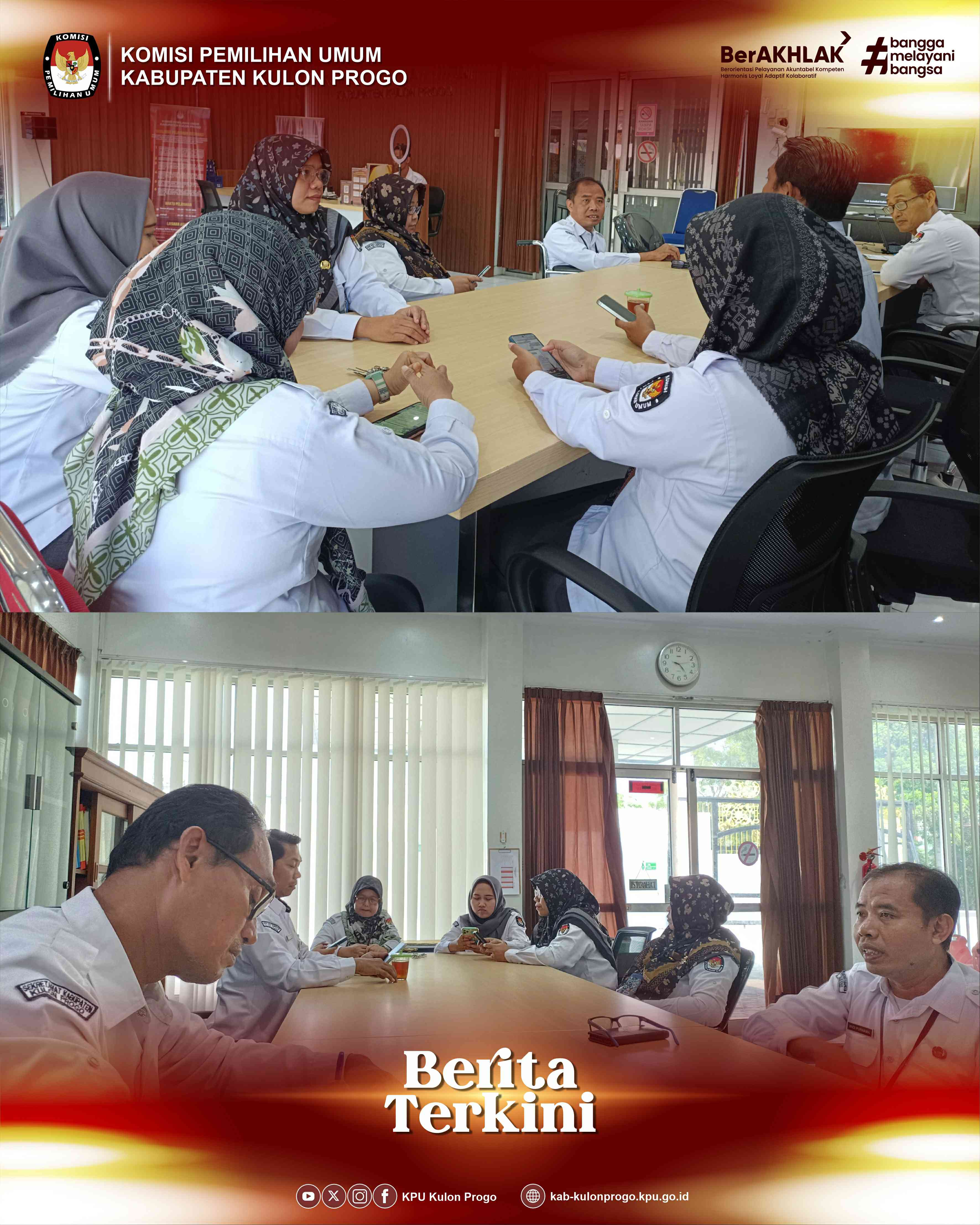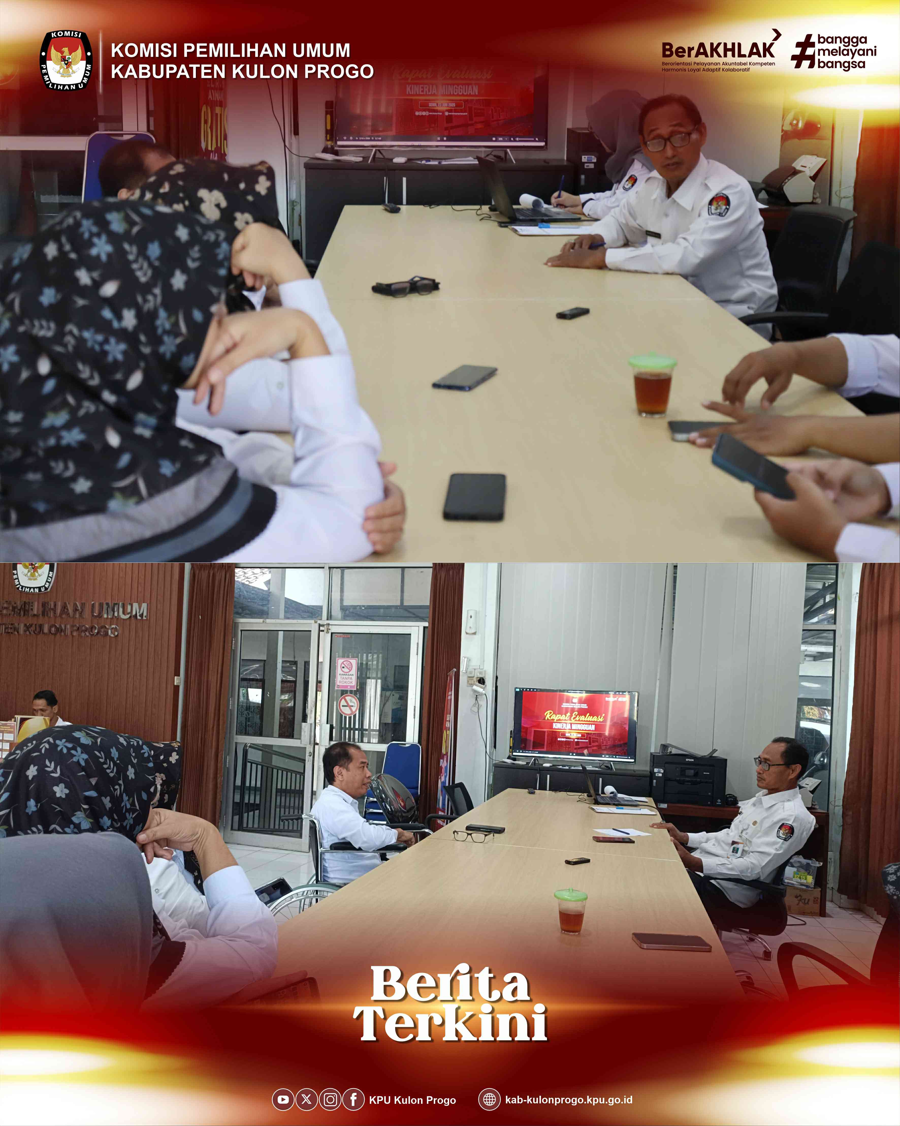 Senin, 23 Juni 2025 KPU Kabupaten Kulon Progo telah melaksanakan rapat evaluasi kinerja mingguan di Pendopo KPU Kabupaten Kulon Progo. Dalam rapat tersebut di pimpin oleh Sekretaris KPU Kabupaten Kulon Progo Widi Purnama dan diikuti seluruh pejabat struktural beserta pengelola keuangan dan pejabat pengadaan.