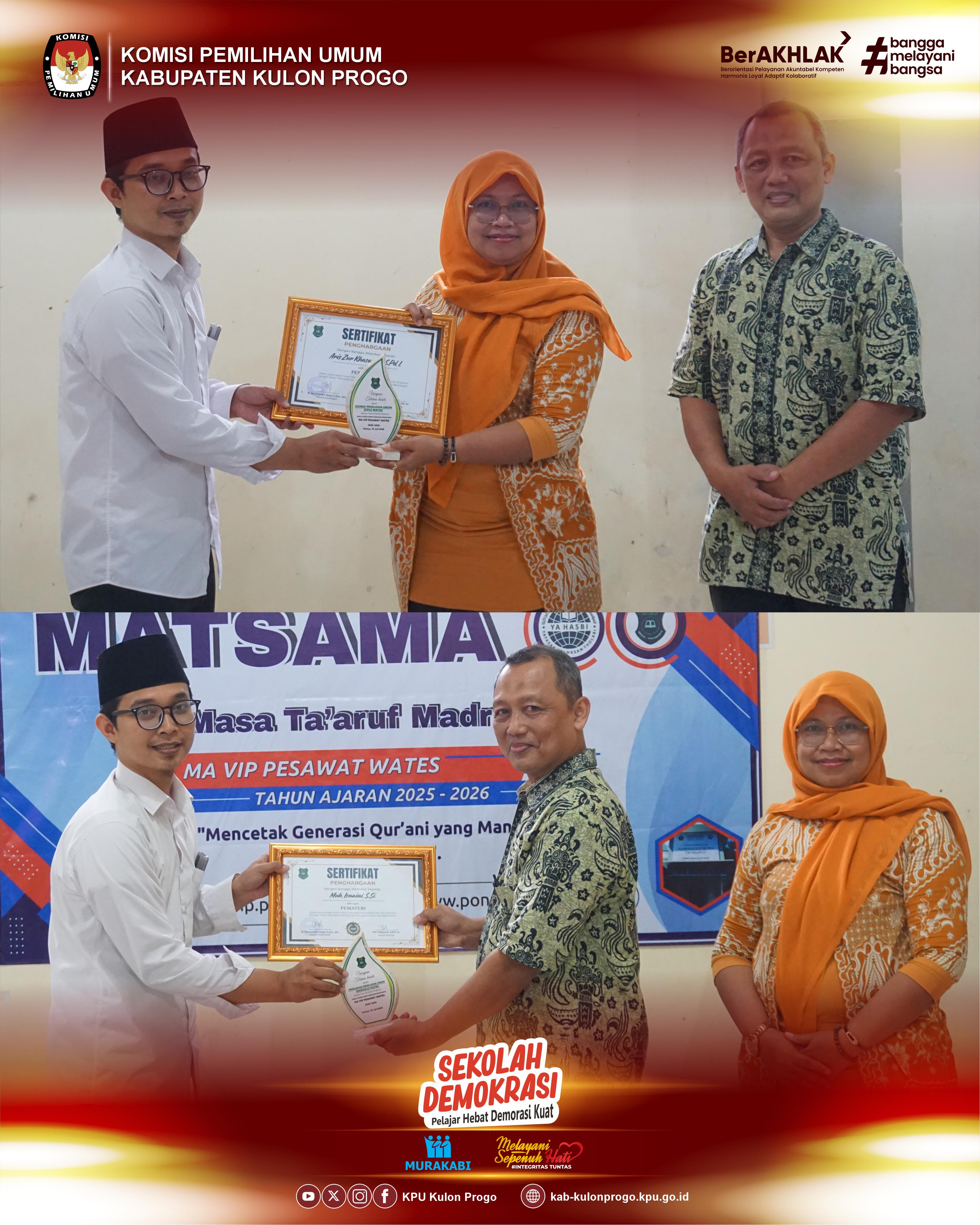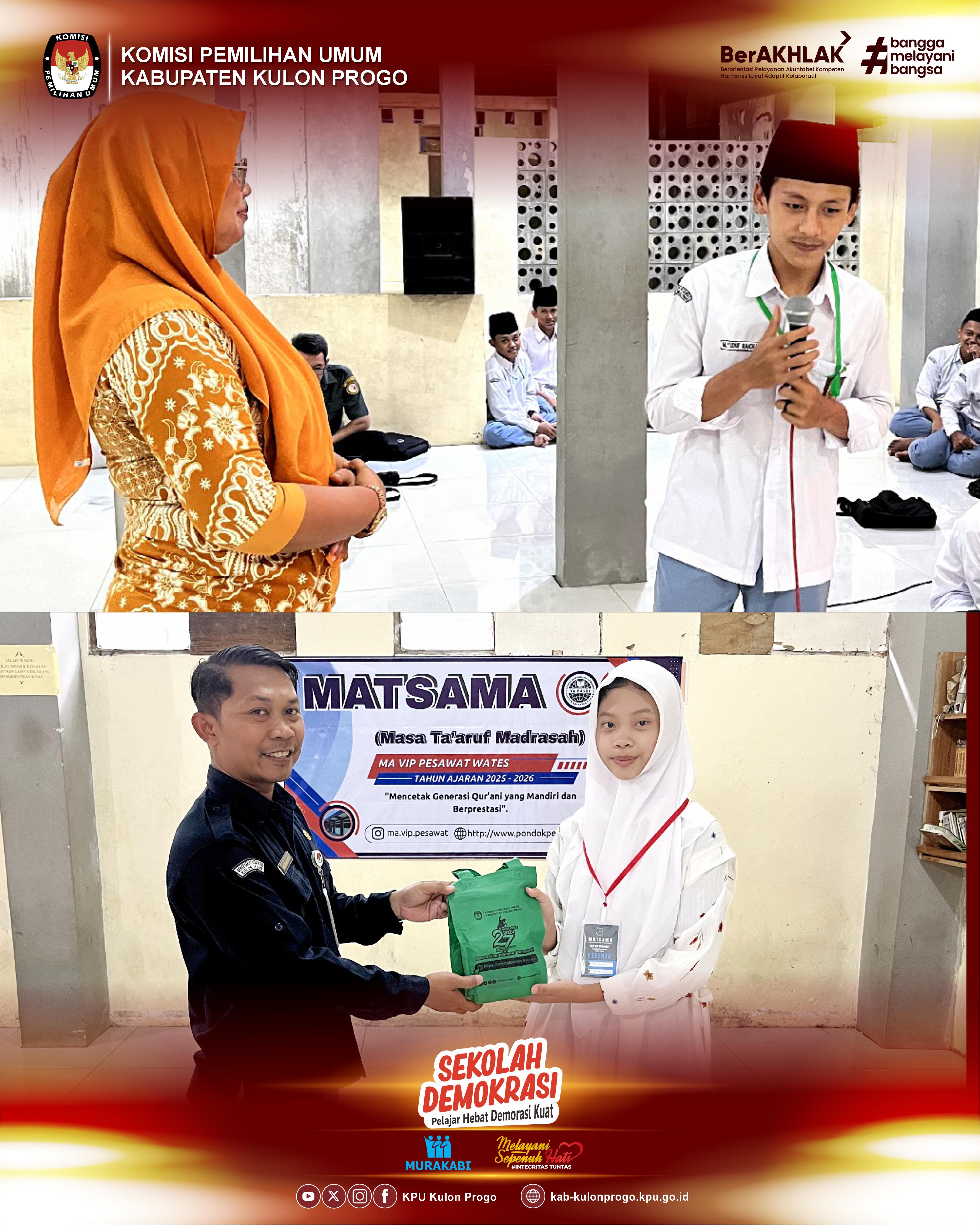 Edukasi Pemilu menjadi salah satu Materi pada Masa Ta'aruf Siswa Madrasah (MATSAMA) di MA VIP Pesawat. Kegiatan yang dilaksanakan pada Hari Selasa,Tanggal 15 Juli 2025 diikuti oleh Pimpinan Pondok Pesantren VIP Pesawat, Abdul Karim Mustofa, para guru MA VIP Pesawat dan calon santri kelas X MA VIP Pesawat sejumlah 40 santri dan santriwati dengan menghadirkan Narasumber dari KPU Kabupaten Kulon Progo dan Bawaslu Kabupaten Kulon Progo.