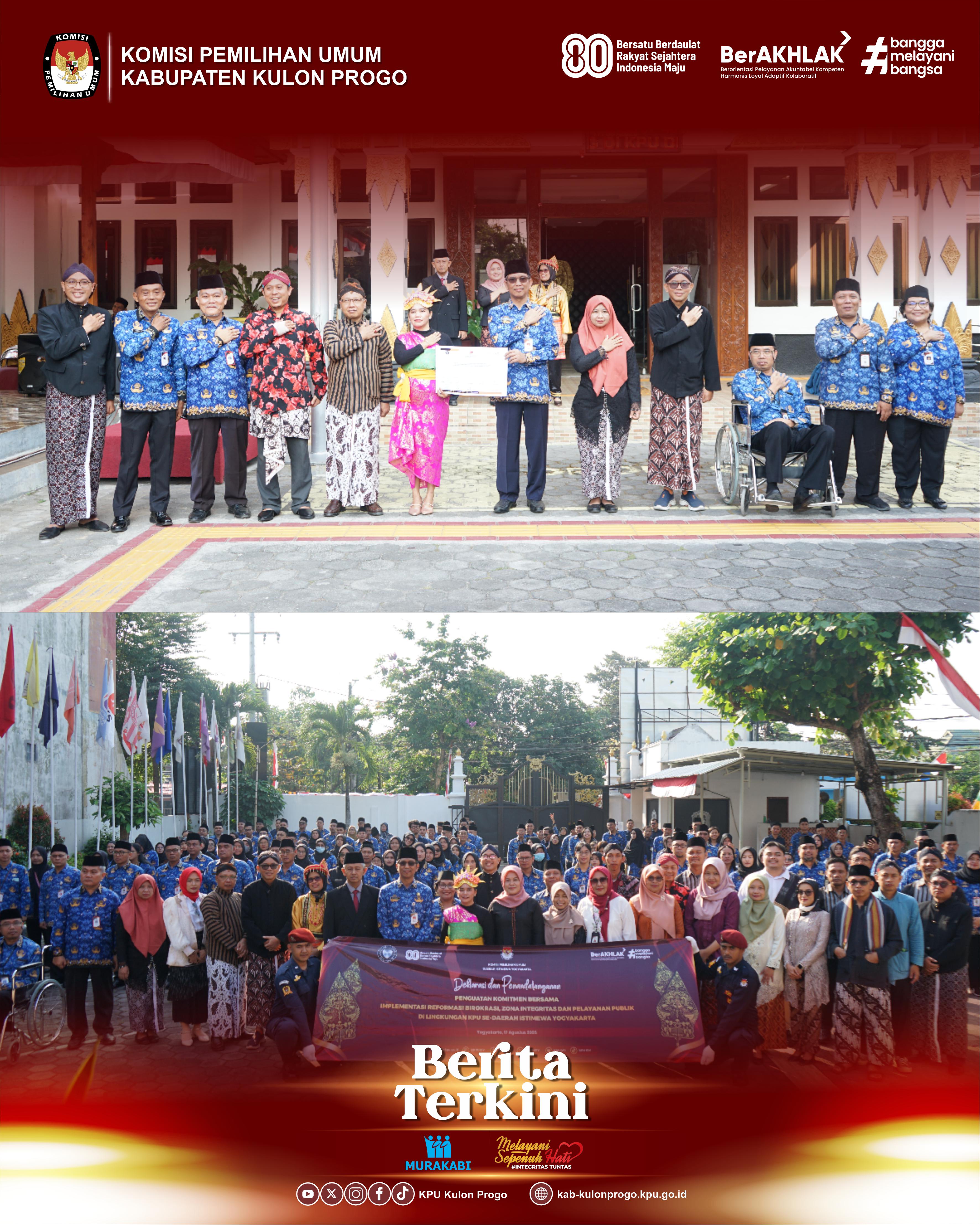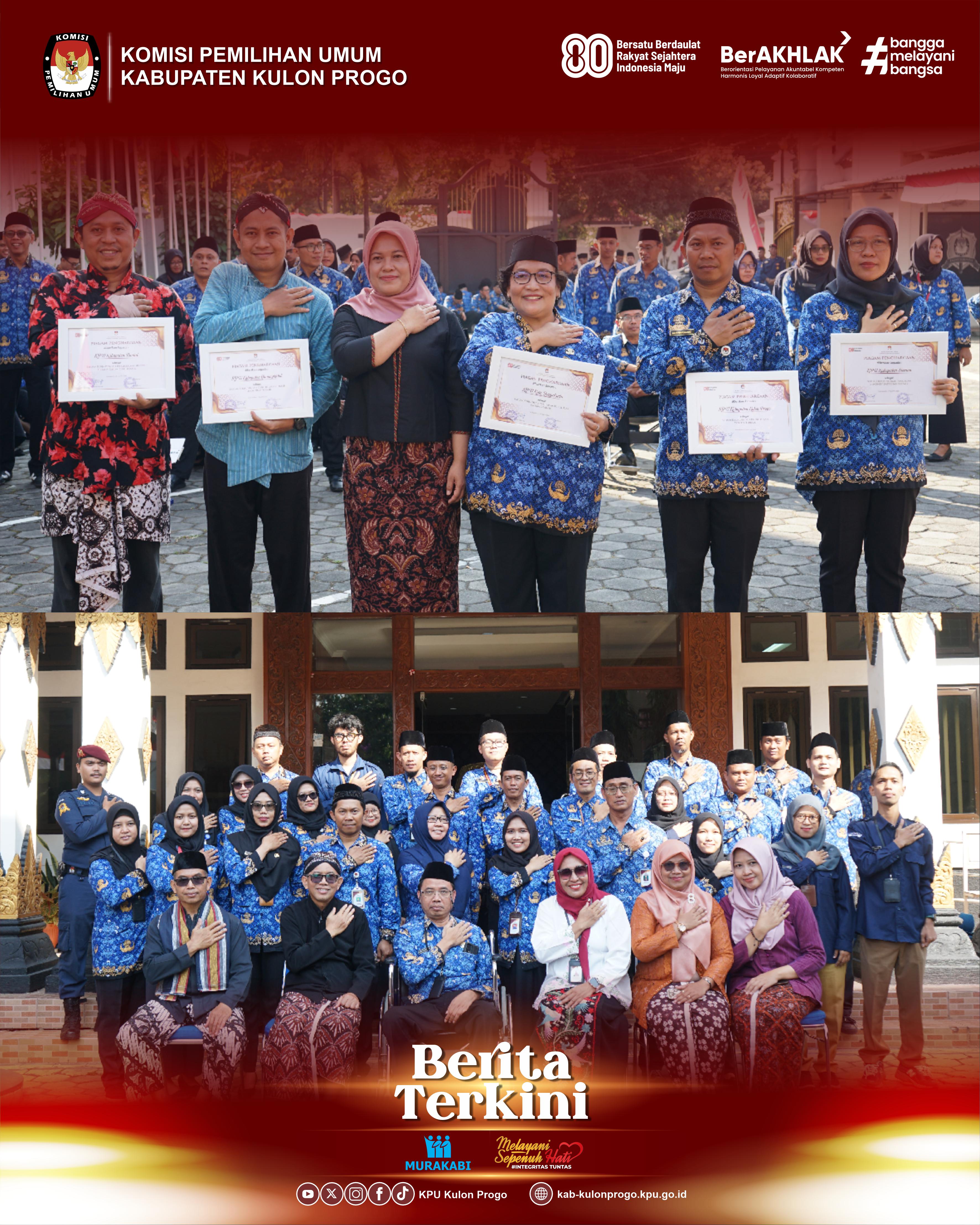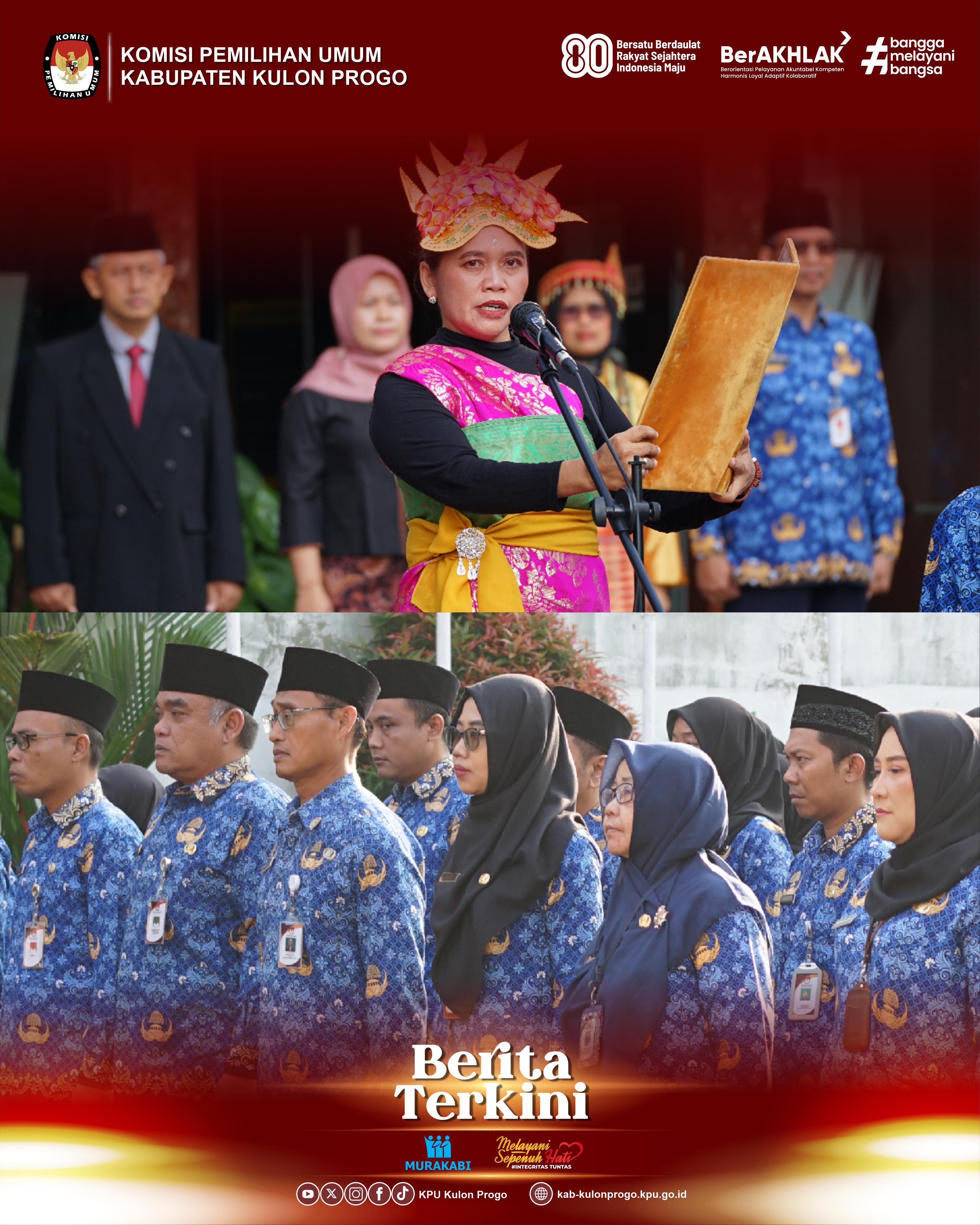 Yogyakarta, 17 Agustus 2025 – Komisi Pemilihan Umum Kabupaten Kulon Progo mengikuti Upacara Peringatan Hari Ulang Tahun (HUT) ke-80 Republik Indonesia yang diselenggarakan di halaman KPU Daerah Istimewa Yogyakarta (DIY). Upacara ini diikuti oleh seluruh satuan kerja KPU kabupaten/kota se-DIY.