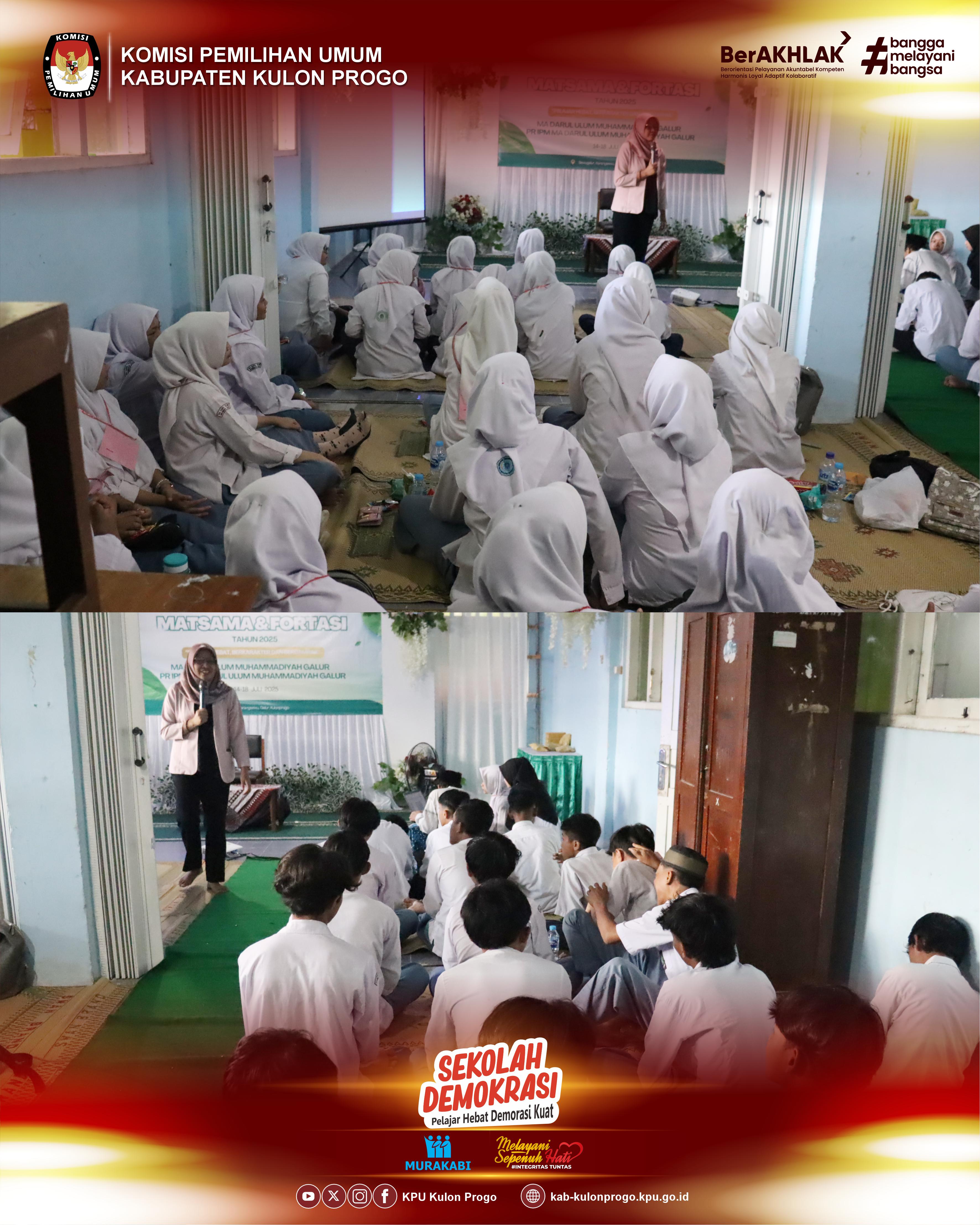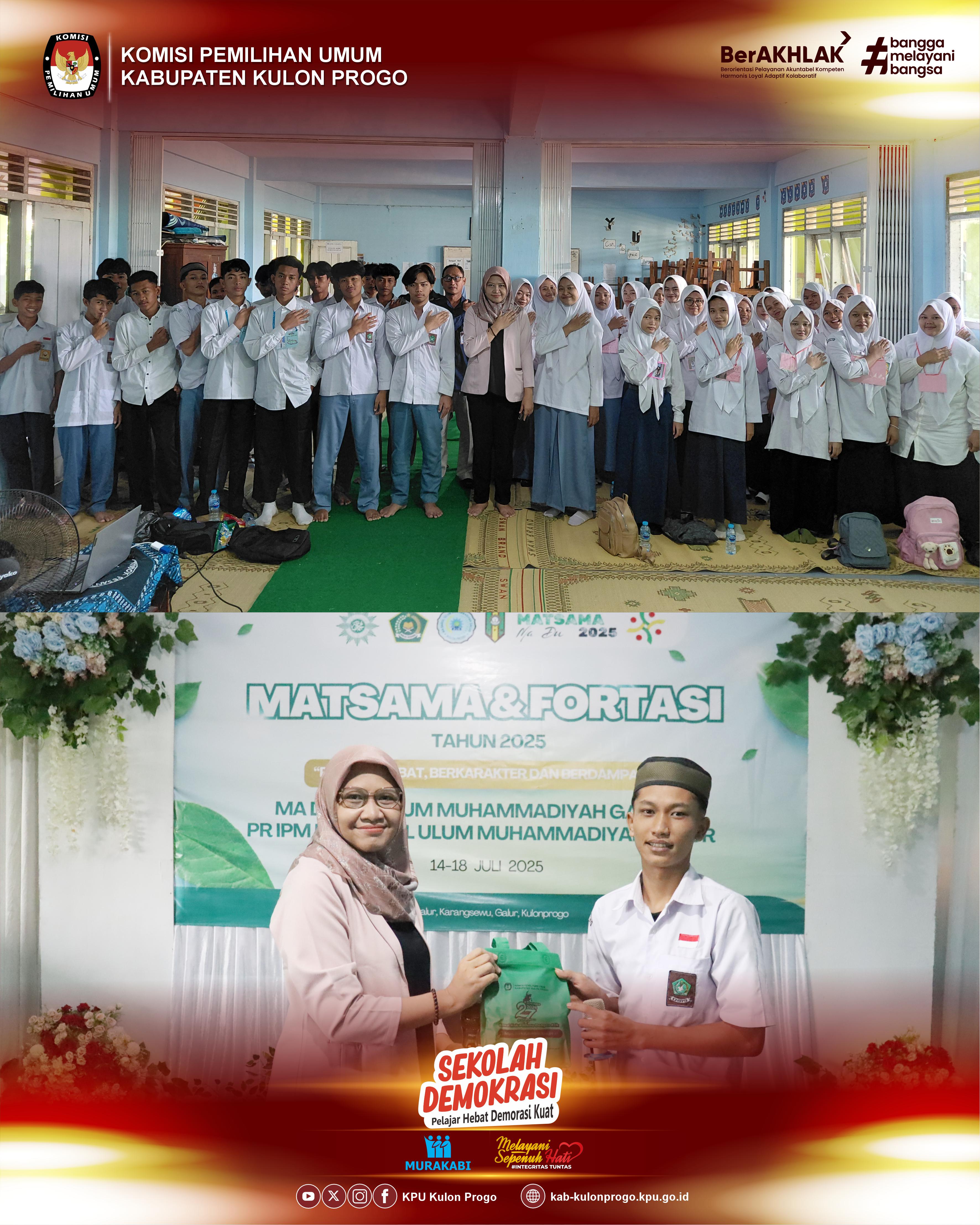 Galur, 15 Juli 2025 Bertempat di Aula MA Darul Ulum Muhammadiyah Galur, KPU Kabupaten Kulon Progo menyelenggarakan kegiatan Sosialisasi dan Pendidikan Pemilih (Sosdiklih) bagi pemilih pemula dalam rangkaian Masa Ta'aruf Siswa Madrasah (MATSAMA) Tahun Ajaran 2025/2026. Kegiatan MATSAMA ini dilaksanakan serentak di seluruh Indonesia mulai Senin, 14 Juli hingga Jumat 18 Juli 2025.
