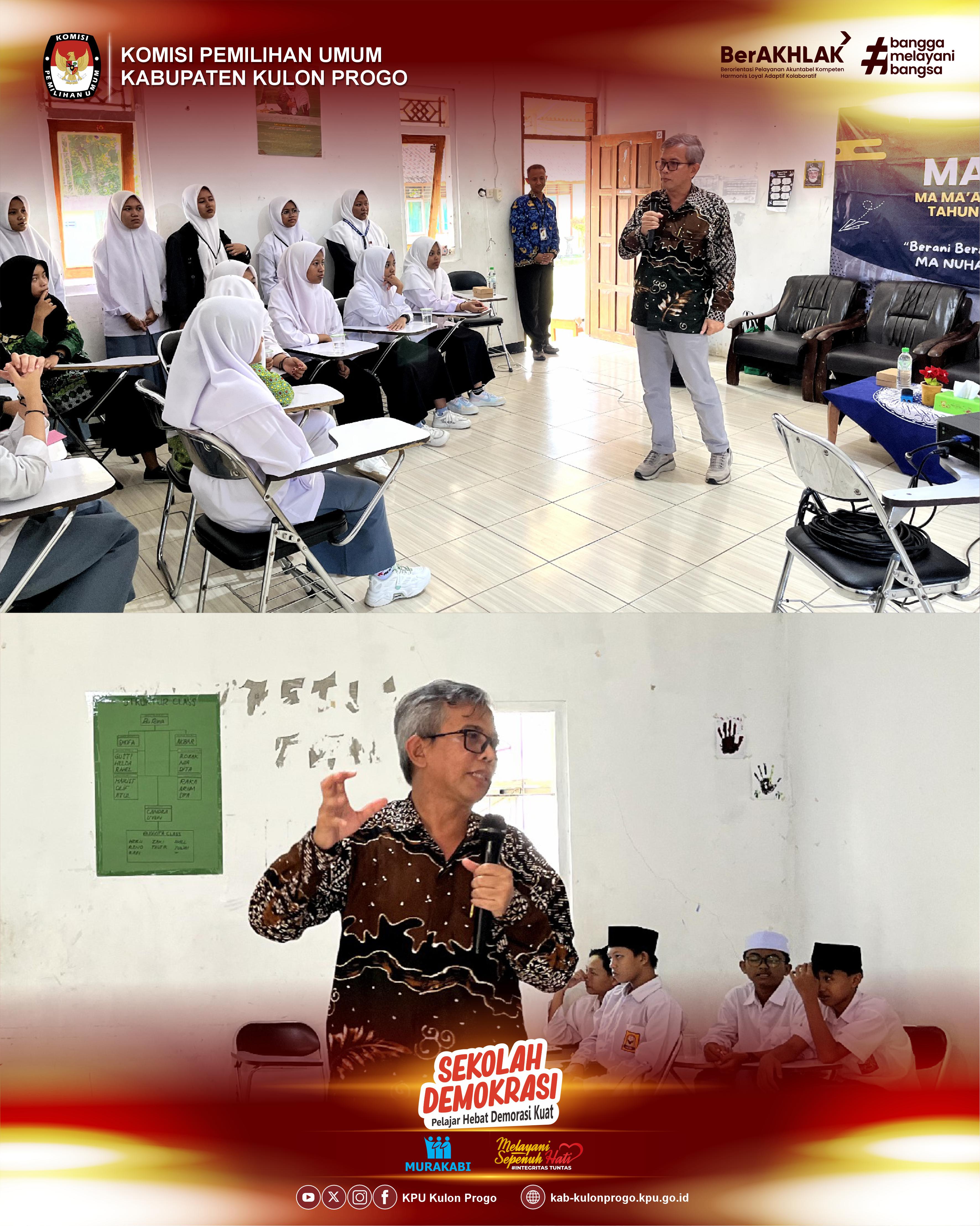 Wates, 17 Juli 2025, KPU Kabupaten Kulon Progo ikut berpartisipasi dalam kegiatan Masa Ta'aruf Siswa Madrasah (MATSAMA) MA Ma’arif Nurul Haromain, Sentolo, Kulon Progo dengan melaksanakan sosialisasi pendidikan pemilih.