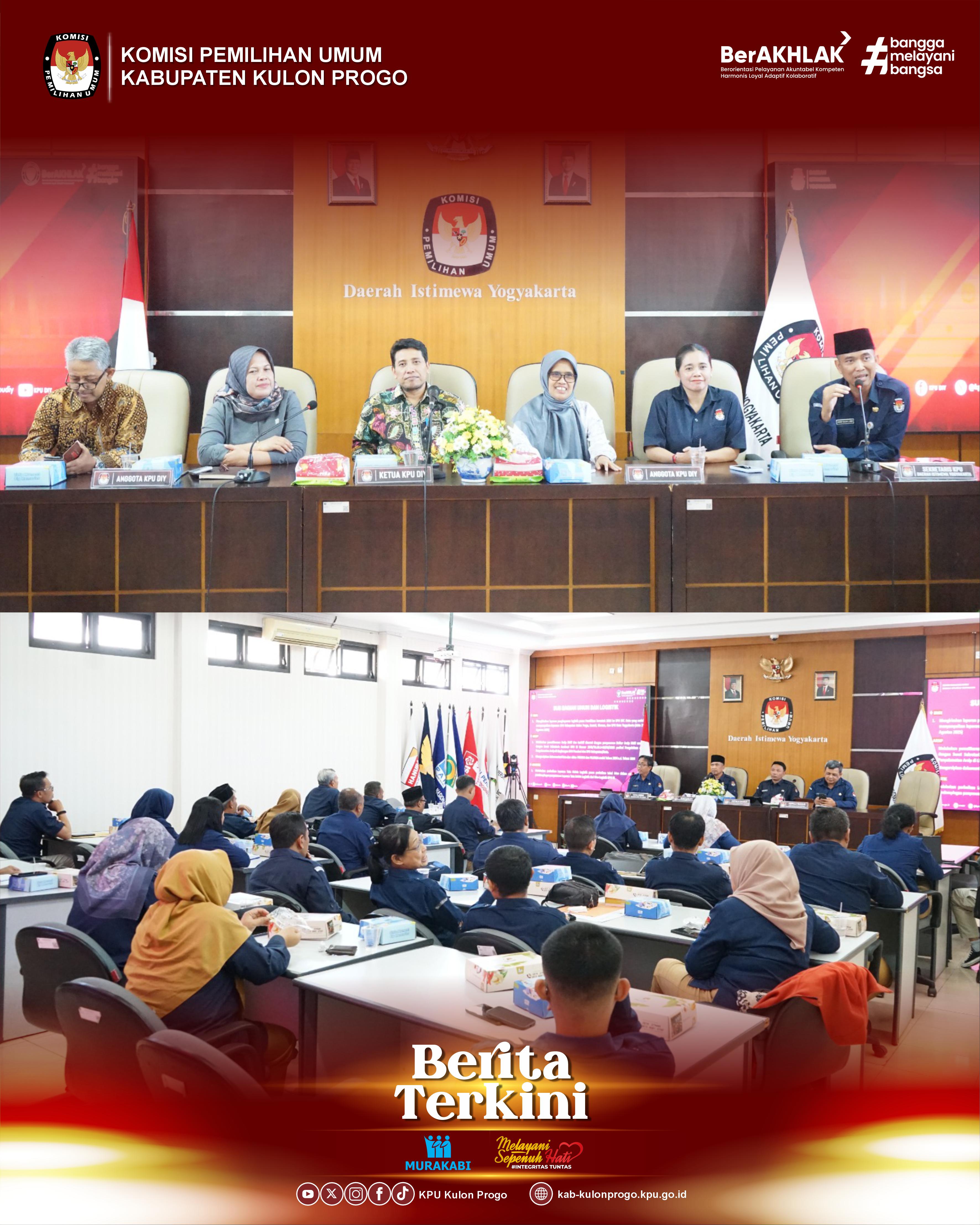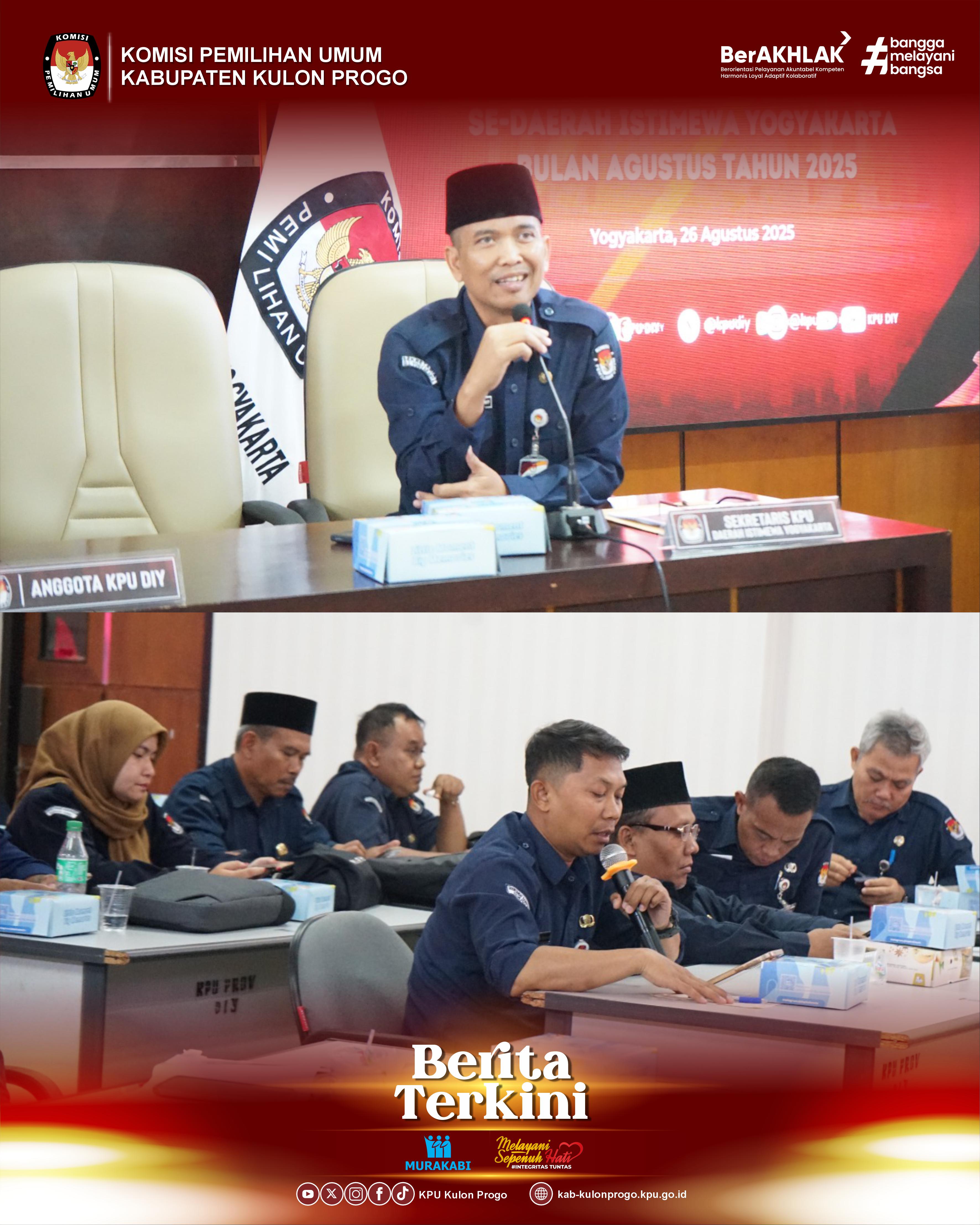 Yogyakarta – Komisi Pemilihan Umum Kabupaten Kulon Progo menghadiri Rapat Koordinasi Kesatkeran KPU se-DIY yang digelar di Kantor KPU DIY pada Selasa, 26 Agustus 2025. Rapat ini membahas optimalisasi penyerapan anggaran, penguatan kelembagaan, serta koordinasi program prioritas antar satuan kerja.