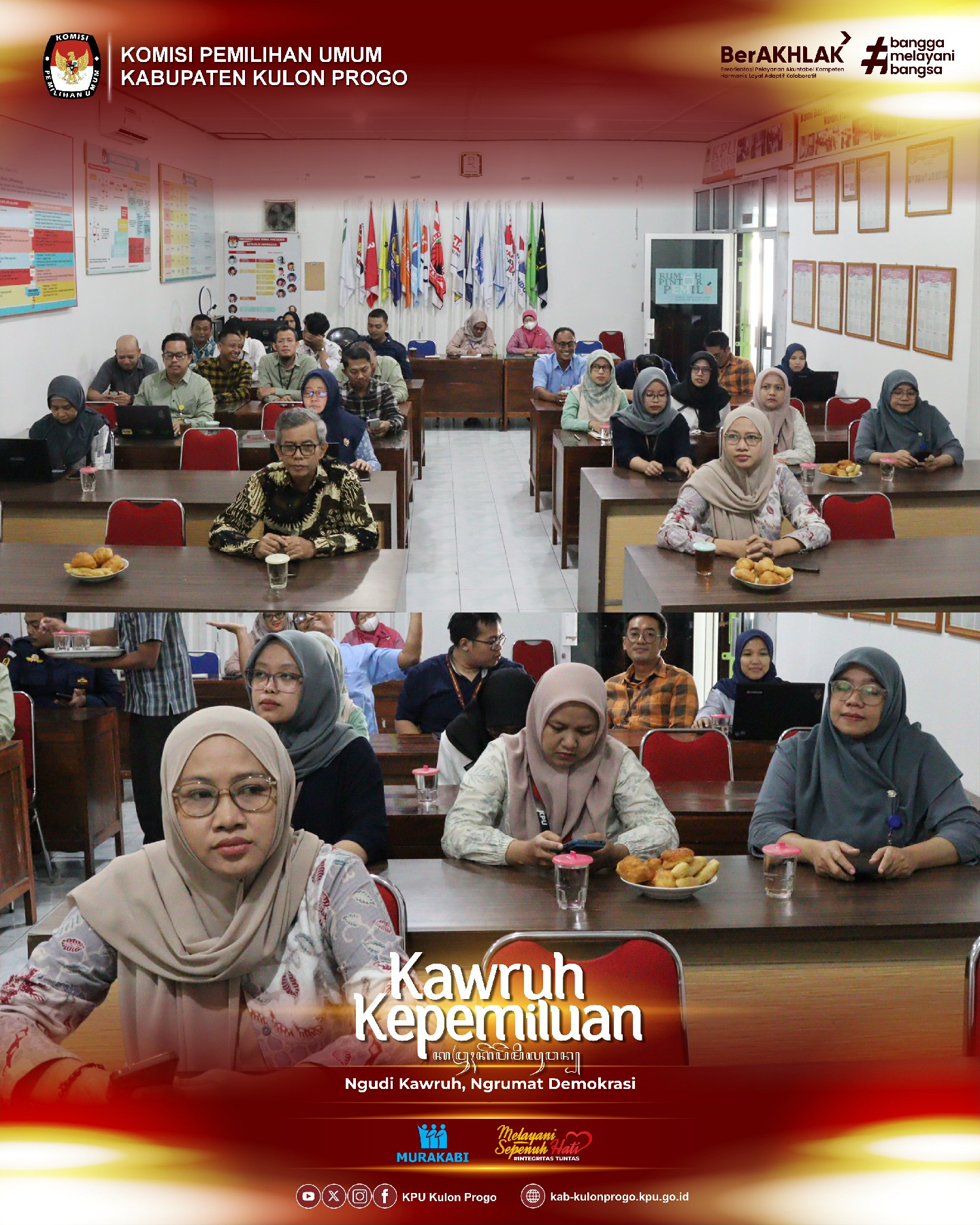 KPU Kabupaten Kulon Progo Kamis 10 Juli 2025, mengadakan Kegiatan Kawruh Kepemiluan dengan Tematik "Kepegawaian” yang diikuti seluruh pegawai dilingkungan KPU Kabupaten Kulon Progo. Kegiatan ini bertujuan untuk Peningkatan Kapasitas Kepegawaian di Lingkungan KPU Kabupaten Kulon Progo, agar setiap pegawai memahami antara Hak dan Kewajiban.