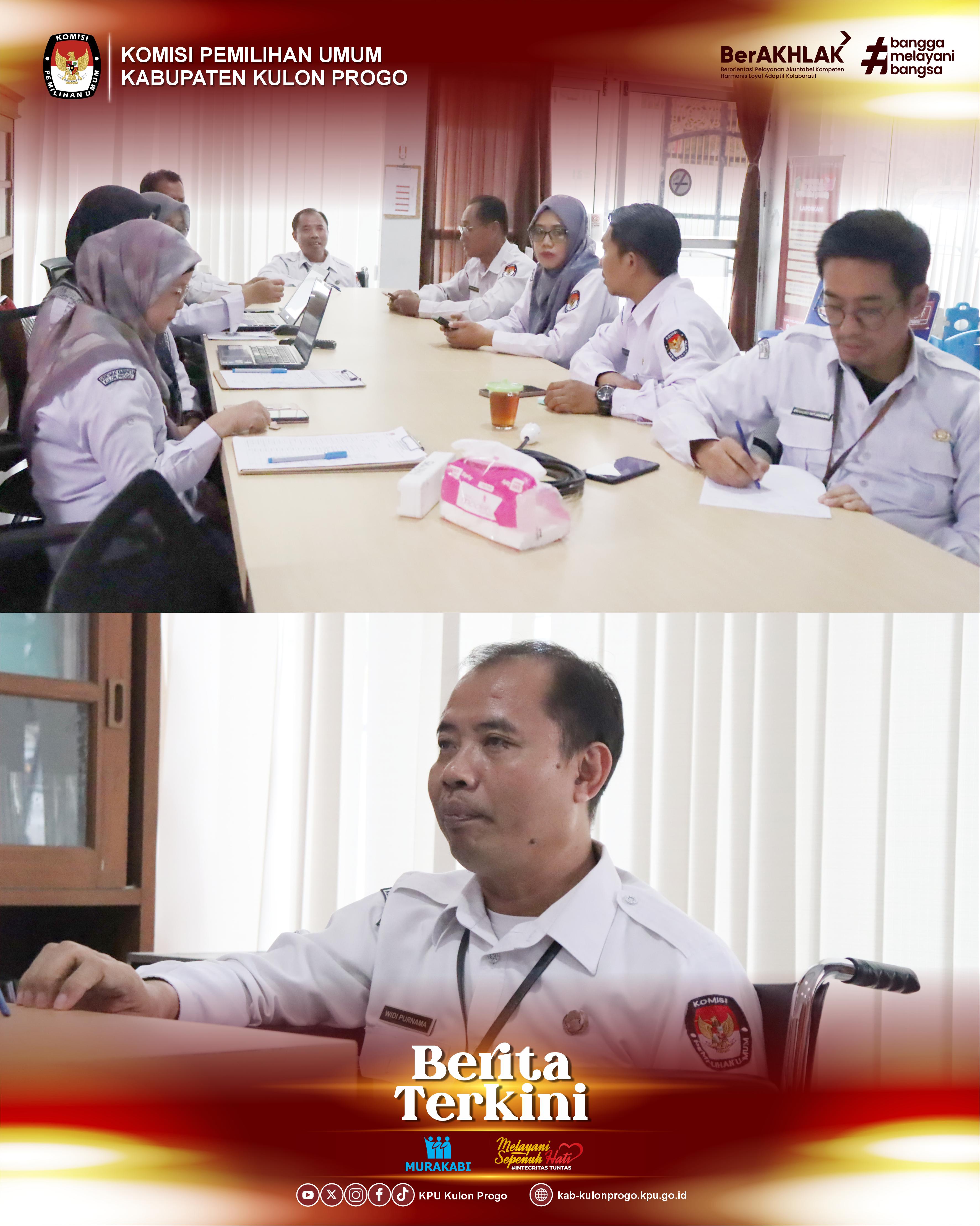 Wates– Senin (11/8/2025), Komisi Pemilihan Umum (KPU) Kabupaten Kulon Progo menggelar Rapat Evaluasi Kinerja Mingguan di Pendopo KPU Kabupaten Kulon Progo. Rapat dipimpin oleh Sekretaris KPU Kabupaten Kulon Progo, Widi Purnama, dan dihadiri seluruh pejabat struktural, pengelola keuangan, pejabat pengadaan, serta staf Subbagian Rendatin.