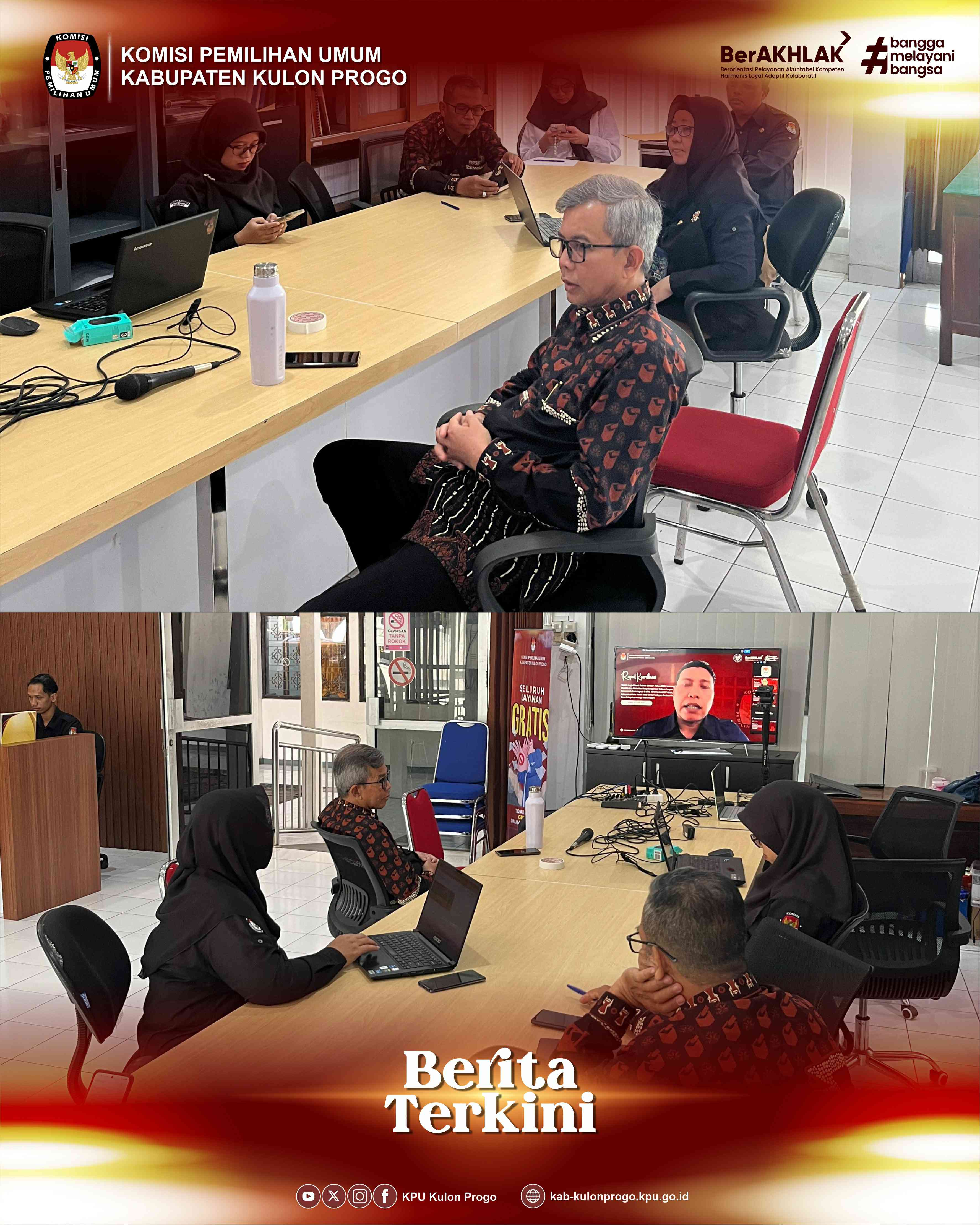Wates, 25 Juni 2025. Bertempat di Pendopo KPU Kabupaten Kulon Progo, Ketua KPU Kabupaten Kulon Progo beserta Ketua Divisi Hukum dan Pengawasan, Sekretaris, Ka. Subbag yang membidangi hukum beserta pelaksana sub bag Teknis dan Hukum mengikuti kegiatan Rapat Koordinasi Tindak Lanjut SE Nomor 1 Tahun 2025 tentang Penilaian Mandiri atas Maturitas SPIP Terintegrasi di KPU, KPU Provinsi/KIP Aceh dan KPU/KIP Kabupaten/Kota Tahun 2025 serta Penyampaian Hasil Rapat Koordinasi Nasional dalam rangka Penguatan Kelembagaan KPU Pasca Pemilu dan Pilkada yang diselenggarakan oleh KPU DIY dan diikuti oleh KPUKab./Kota se-DIY.
