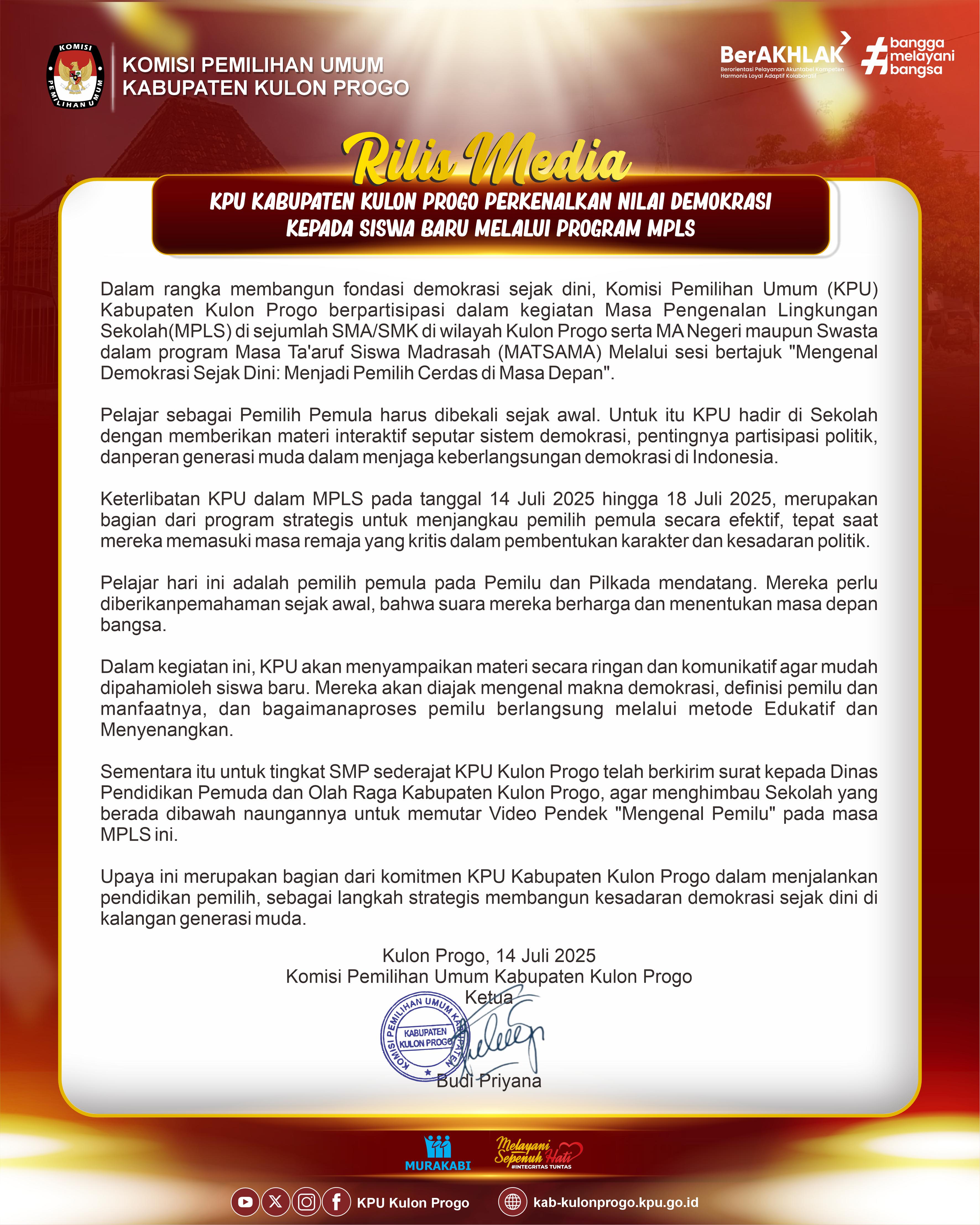 #TemanPemilih, berikut adalah Rilis Media KPU Kabupaten Kulon Progo Perkenalan Nilai Demikrasi Kepada Siswa Baru Melalui Program MPLS dan MATSAMA di Kabupaten Kulon Progo.