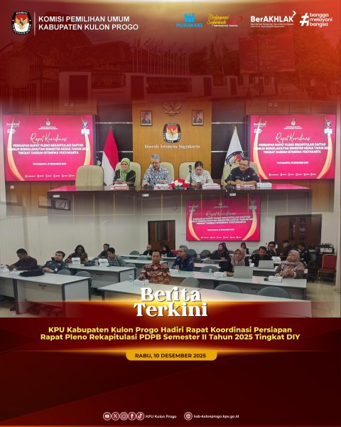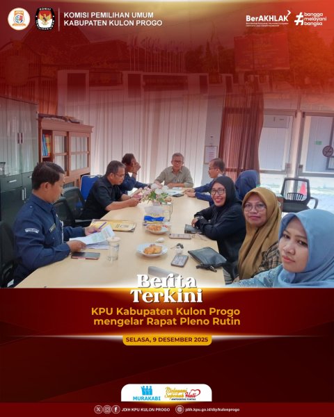 Kulon Progo, 9 Desembaer 2025 Komisi Pemilian Umum Kabupaten Kulon Progo menggelar Rapat Pleno Rutin membahas tentang Penyampaian hasil tindak lanjut rapat pleno sebelumnya, Laporan penggunaan anggaran dan Laporan pelaksanaan tugas lainnya secara periodik bertempat di Pendopo KPU Kabupaten Kulon Progo. Rapat Pleno Rutin dihadiri Ketua dan Anggota, Sekretaris, seluruh Kasubag dan pelaksana Sub bag Teknis dan Hukum KPU Kabupaten Kulon Progo. Rapat dibuka oleh Ketua KPU Kabupaten Kulon Progo Budi Priyana, Budi menyampaikan hasil tindak lanjut dari rapat pleno sebelunya yang telah dilaksanakan diantaranya telah direalisasikan penyerahan bahan hibah dari Pemda Kabupaten Kulon Progo melalui Badan Kesbangpol Kabupaten Kulon Progo berupa seperangkat Laptop, Telivisi Flat 70 inch dan perlengkapan untuk Podcast. Sekretaris KPU Kabupaten Kulon Progo Widi Purnama juga menambahkan tentang Hibah Tanah dari Pemda Kabupaten Kulon Progo ke KPU Kabupaten Kulon Progo masih dalam proses dan rencana akan diserahkan prosesnya melalui KPKNL yang diperkirakan membutuhkan waktu tujuh bulan. Untuk Penyerapan Anggaran sampai tanggal 8 Desember 2025 mencapai 98,8%, Widi juga menyampaikan akan ada kunjungan dari Dinas Kependudukan dan Catatan Sipil Kabupaten Sragen untuk studi banding. Dalam rapat pleno tersebut Kadiv Teknis Hidayatut Thoyyibah juga menyampaikan bahwa KPU Kabupaten Kulon Progo akan mengadakan Pelayanan Helpdesk tentang pemutakhiran data Parpol melalui aplikasi Sipol. Pelayanan dibuka pada tanggal 11 dan 12 Desember 2025. Pada kesempatan itu pula 5 tim helpdesk juga melaporkan progres tentang komunikasi dengan parpol yang diampunya. Beberapa Parpol sudah merespon dan menindak lanjuti dari tim Helpdesk KPU Kabupaten Kulon Progo. -AK