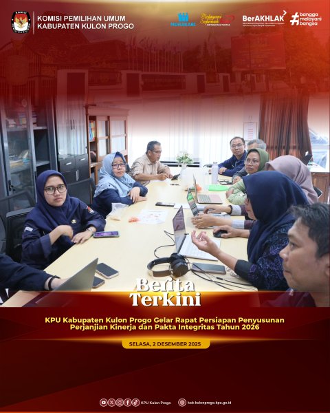 Yogyakarta, 5 Desember 2025 – Komisi Pemilihan Umum (KPU) Kabupaten Kulon Progo mengikuti kegiatan Rapat Koordinasi Persiapan Rekapitulasi Pemutakhiran Data Pemilih Berkelanjutan Triwulan IV Tahun 2025 Tingkat Kabupaten/Kota, yang dilaksanakan oleh KPU Daerah Istimewa Yogyakarta (DIY) pada Jumat (5/12), bertempat di Lantai 2 kantor KPU DIY. Kegiatan ini dihadiri oleh Ketua dan Anggota serta Plh Sekretaris KPU DIY. Selain itu, rapat juga diikuti oleh seluruh Ketua KPU Kabupaten/Kota, Ketua Divisi Perencanaan, Data, dan Informasi, Kepala Subbagian yang membidangi Perencanaan, Data, dan Informasi, serta staf pelaksana atau operator Sidalih di lingkungan KPU se-DIY. Dalam Rapat Koordinasi tersebut di pimpin langsung oleh Ketua Divisi Perencanaan, Data, dan Informasi, Moh Zaenuri Ikhsan. Rakor ini dilaksanakan untuk memastikan seluruh tahapan penyusunan rekapitulasi PDPB Triwulan IV berjalan sesuai ketentuan dan standar yang ditetapkan oleh KPU RI. Dalam kesempatan tersebut, KPU Kabupaten/Kota mendapatkan penguatan terkait mekanisme finalisasi data, penyelarasan data sinkronisasi, serta penyiapan dokumen dan laporan yang akan digunakan dalam proses rekapitulasi ditingkat Kabupaten/Kota. Selain itu, rakor juga membahas evaluasi pelaksanaan PDPB selama bulan Oktober–Desember 2025, termasuk progres tindak lanjut masukan dari Bawaslu serta stakeholder terkait lainya, pembaruan data dari instansi terkait, serta kendala yang muncul pada proses verifikasi dan validasi data. KPU Kabupaten/Kota diminta memastikan bahwa seluruh proses pemutakhiran dilakukan secara akurat, akuntabel dan dapat dipertanggungjawabkan. Melalui kegiatan ini, KPU Kabupaten Kulon Progo berharap proses rekapitulasi PDPB Triwulan IV Tahun 2025 di Kabupaten Kulon Progo dapat berjalan lebih terarah, konsisten, dan sesuai ketentuan yang berlaku. Hasil rekapitulasi ini nantinya akan menjadi dasar penting dalam penyusunan data pemilih yang lebih akurat dan mutakhir untuk mendukung penyelenggaraan pemilu serta pemilihan yang berkualitas. (Irv)