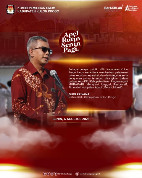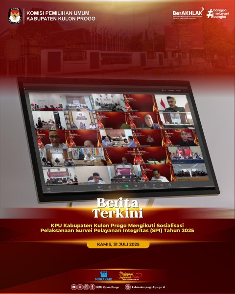 Wates, 31 Juli 2025, KPU Kabupaten Kulon Progo mengikuti Sosialisasi Pelaksanaan Survei Penilaian Integritas (SPI) Tahun 2025 yang dihadiri oleh Pegawai di lingkungan Biro/Pusat/Inspektorat Wilayah Setjen KPU, Sekretaris KPU Provinsi dan Sekretaris KPU Kabupaten/Kota se Indonesia. Sosialisasi dibuka oleh Nanang Priyatna selaku Inspektorat Utama KPU RI. Tujuan dilaksanakan sosialisasi yaitu agar pegawai (responden) mengerti dan memahami tujuan dari SPI, mengetahui sebagai responden, memahami cara pengisian survey serta ikut mendukung agar hasil SPI tinggi dan berkualitas. SPI adalah survey nasional yang dilaksanakan oleh KPK untuk mempotret integritas lembaga publik (dicerminkan oleh Indek Integritas Nasional) berdasarkan pengalaman dan persepsi masyarakat (pengguna layanan), pegawai serta expert (ahli). Pelaksanaan survey oleh KPK akan dilaksanakan pada bulan Juli sampai dengan Oktober 2025, metode yang digunakan yaitu pencacahan secara daring dan pengambilan data primer yaitu menghubungi pegawai, eksternal pengguna layanan (penyedia barang dan jasa) dan eksper untuk mengisi kuesioner daring. SPI merupakan media partisipasi publik dalam pencegahan korupsi dengan mendorong perbaikan layanan dan tata kelola instansi melalui masukan langsung dari publik. Dengan mengikuti SPI ini, responden turut berperan aktif dalam menciptakan yang bersih dan berintegritas. -Sap